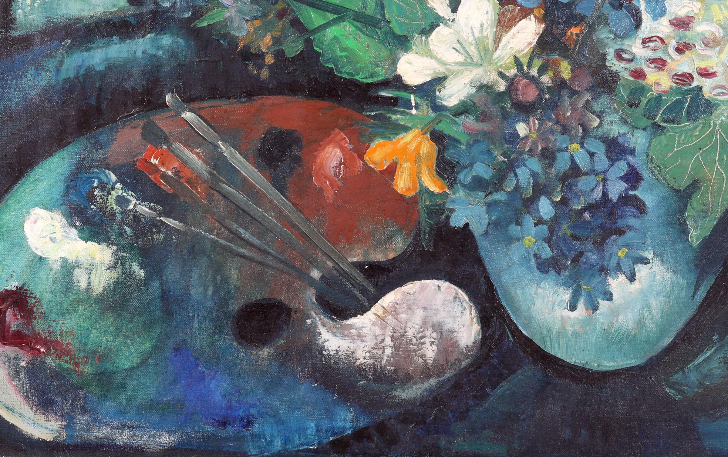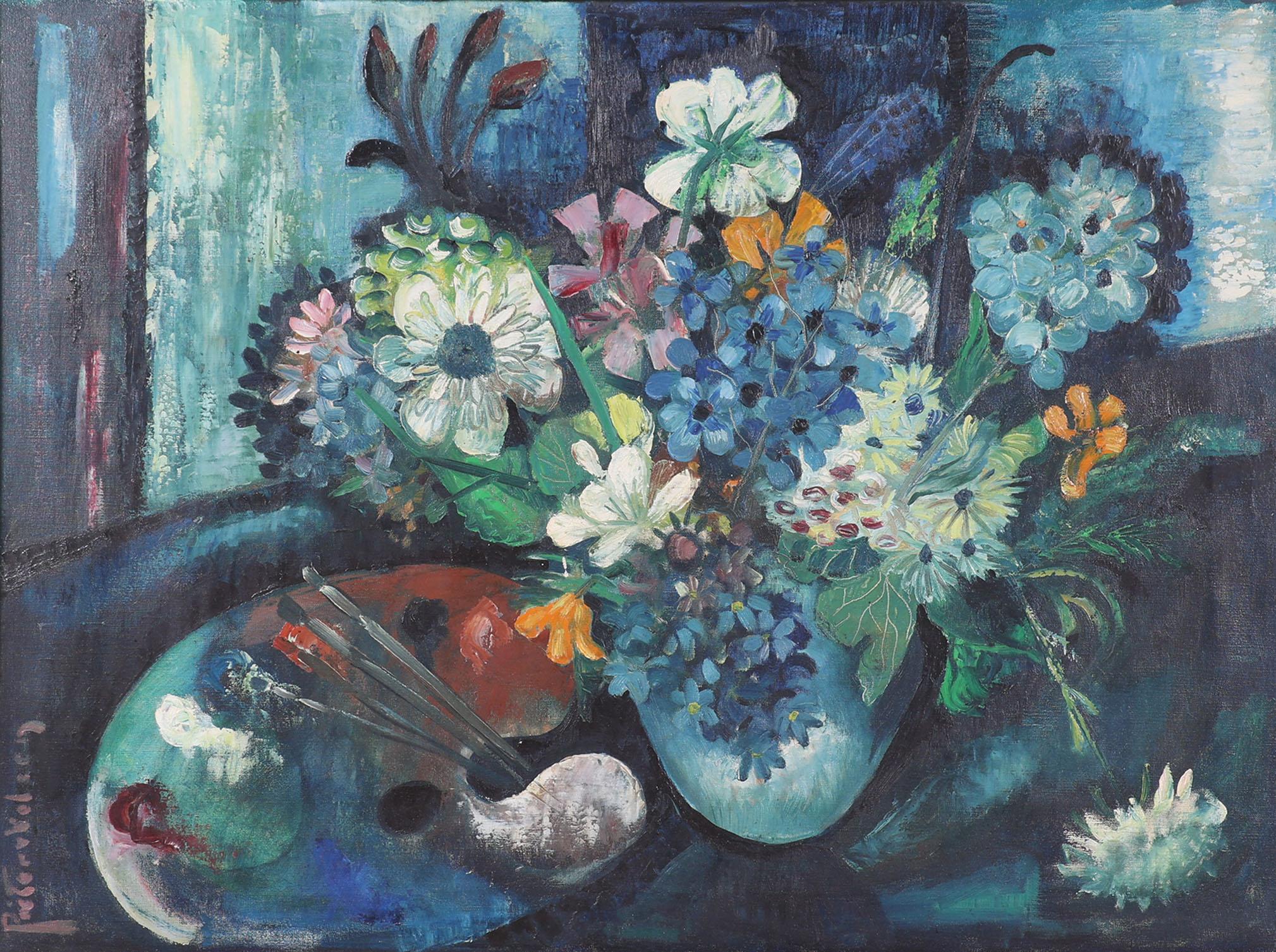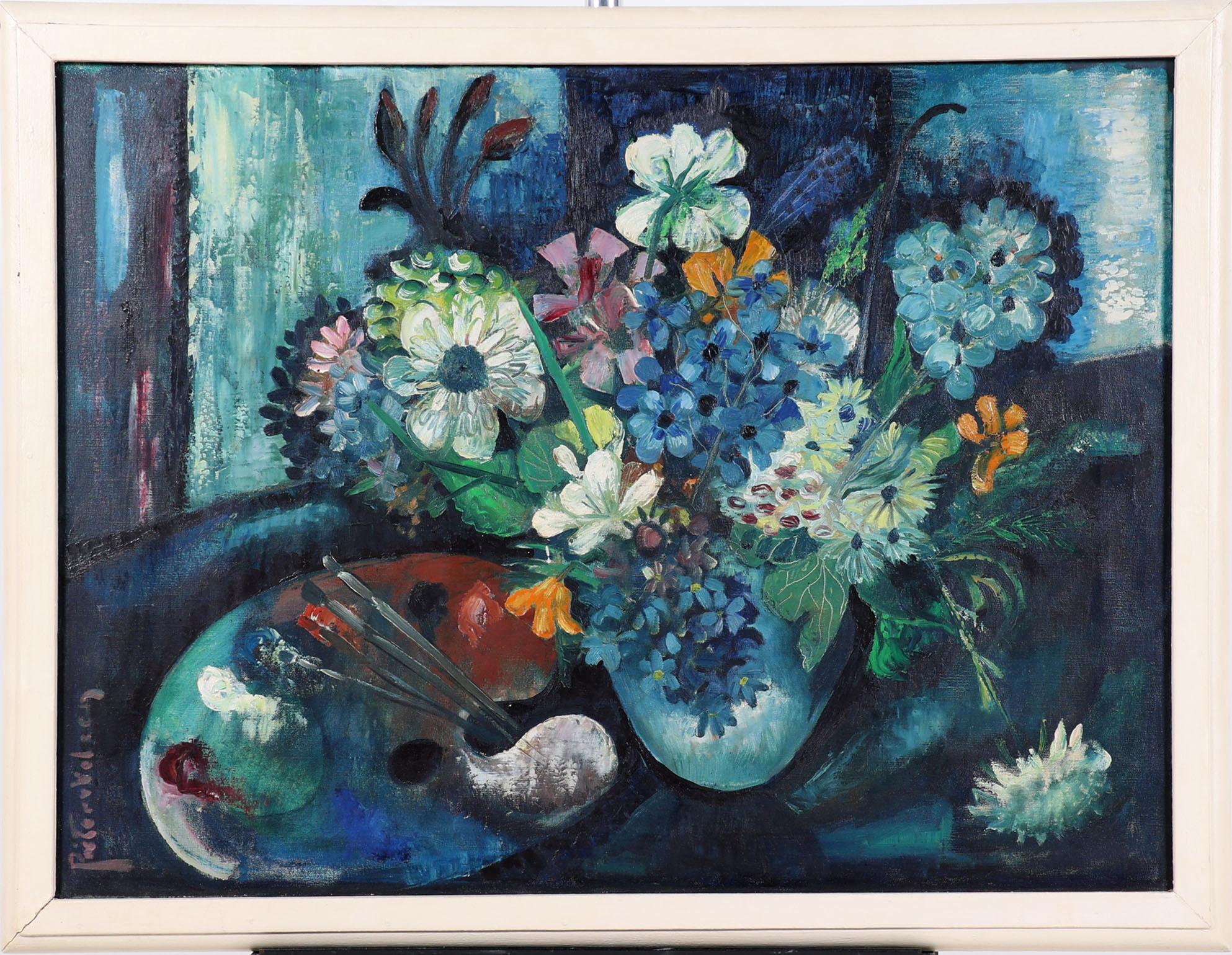 P. Voleen, Schilderspalet met bloemstilleven, olieverf op doek, 100 x 74 cm.