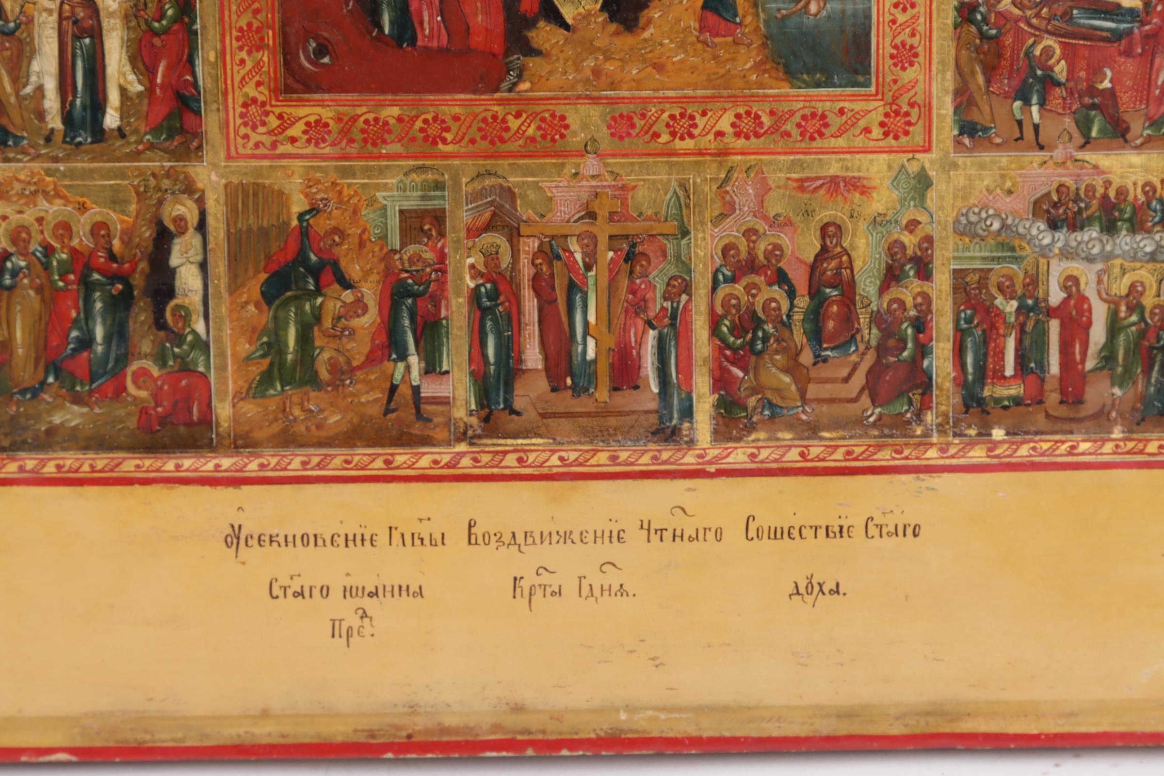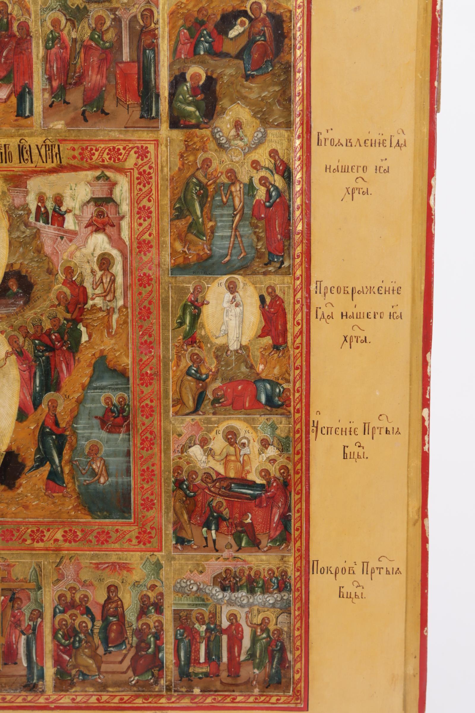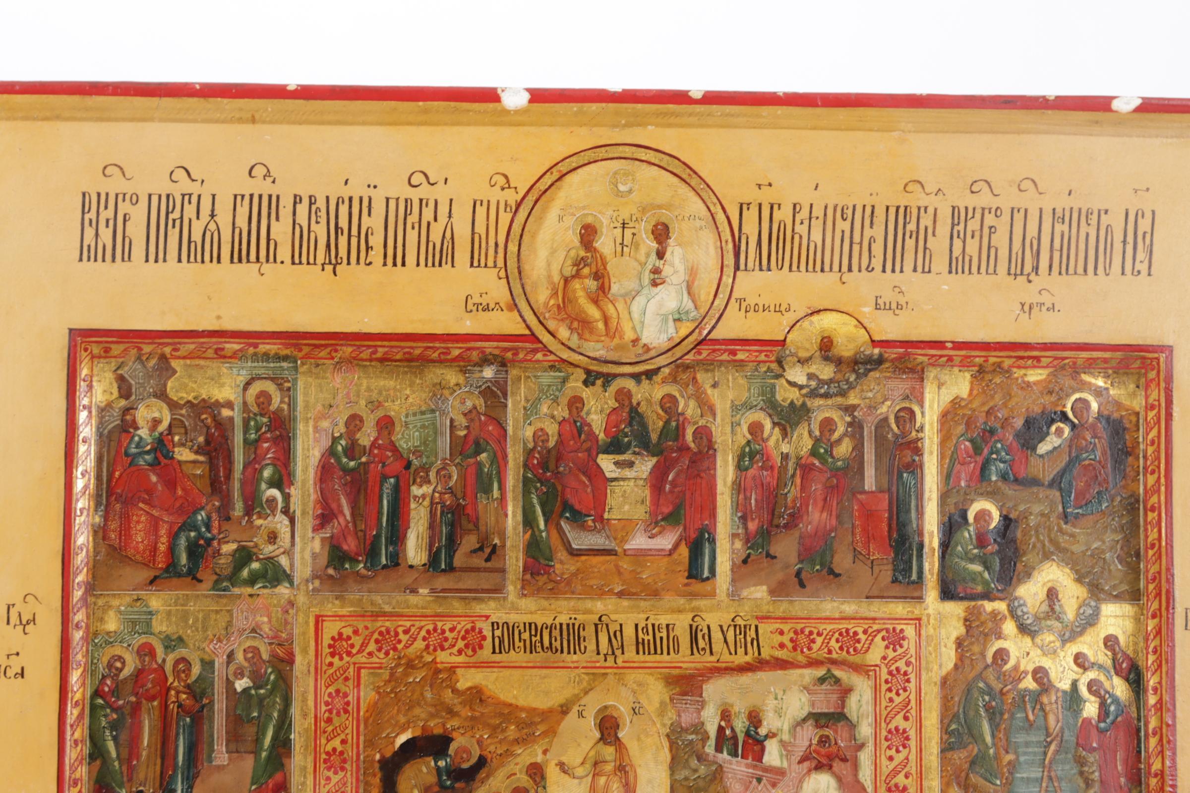 Russische Feestdagen ikoon met voorstellingen van de belangrijkste Russisch/Orthodoxe kerkelijke feestdagen gegroepeerd rond de paasvoorstelling, centraal Rusland, tempra op paneel, 19e eeuw, 35,5 x 31 cm.