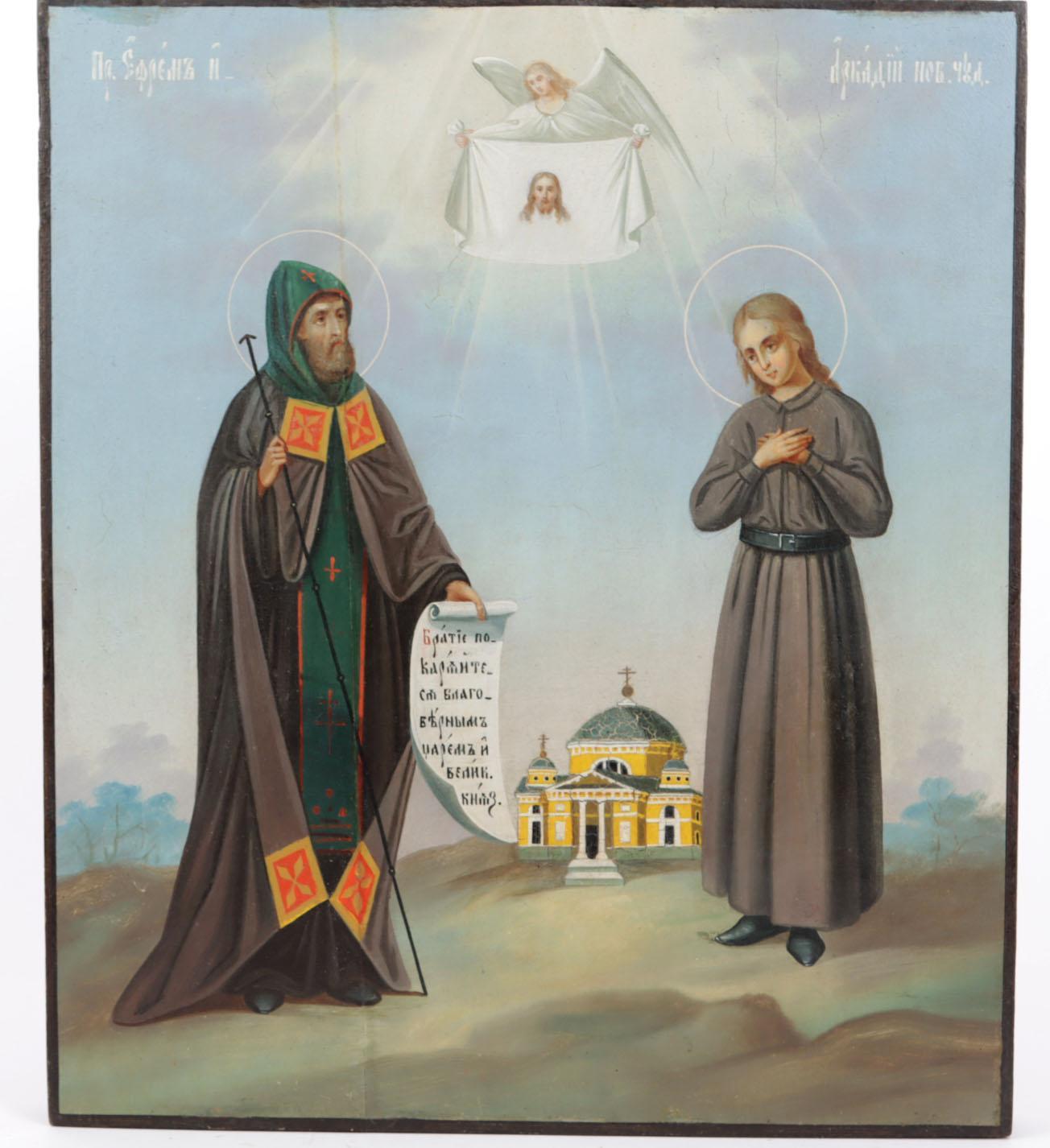 Oude ikoon, St. Ephraim en St. Arkady van Novy Torg, Moeder Gods, Feodorovskaja, tempra op paneel, 35 x 30 cm.