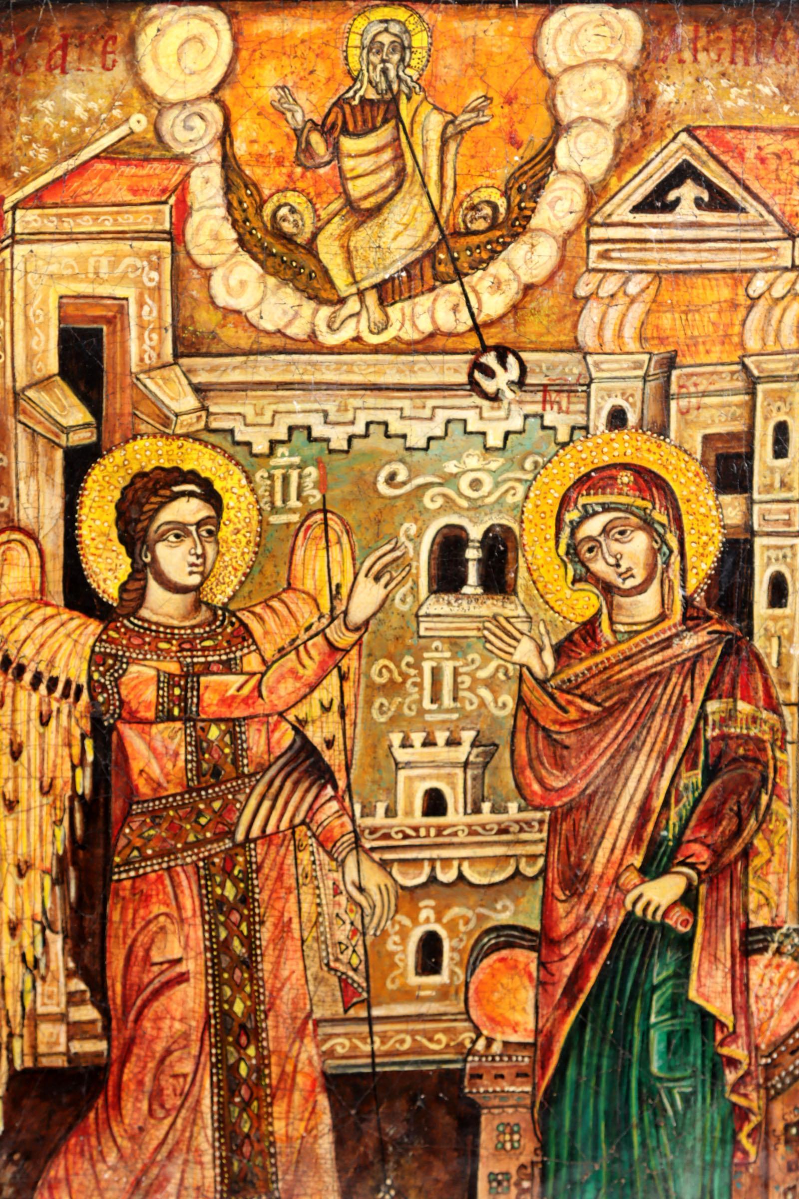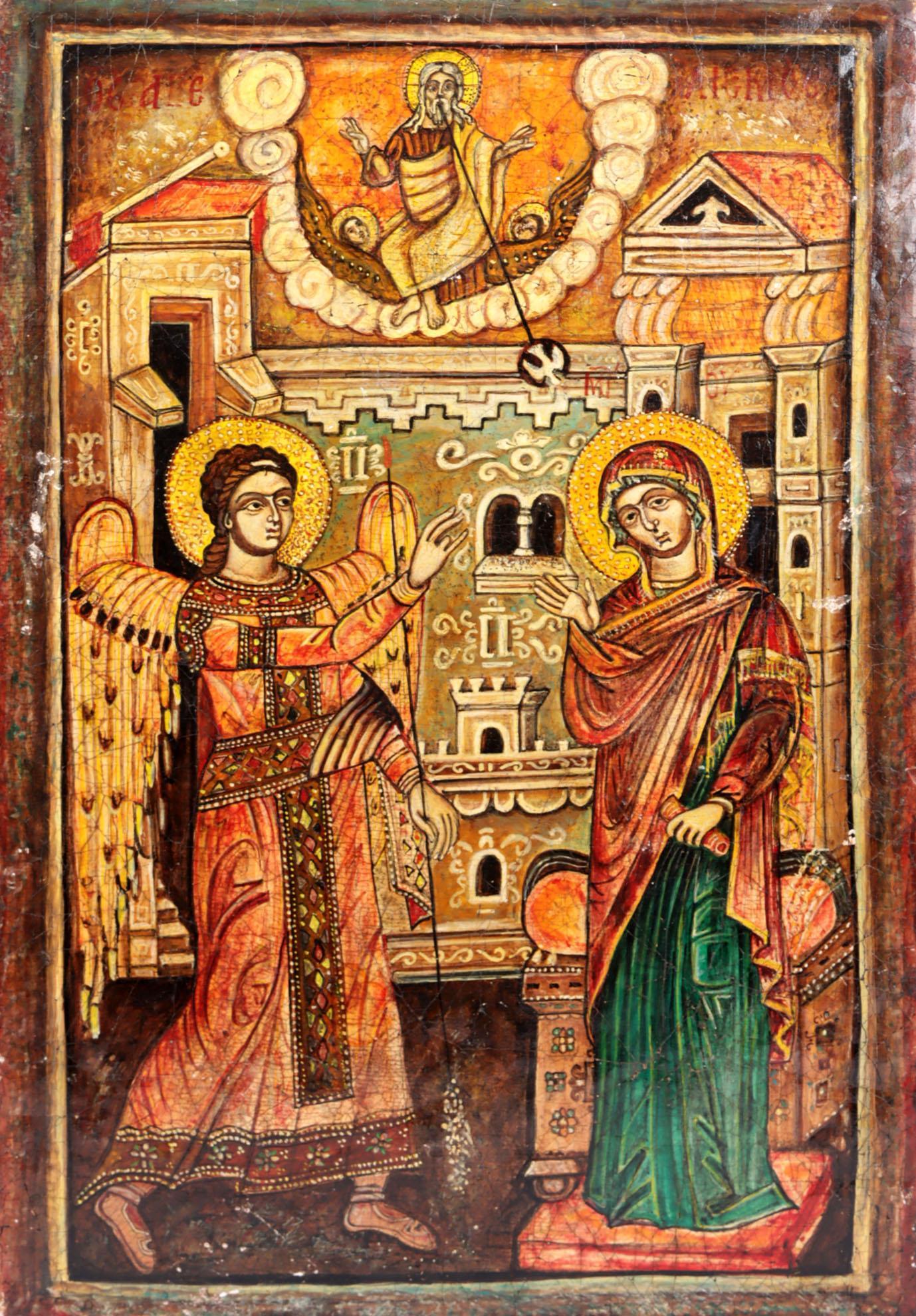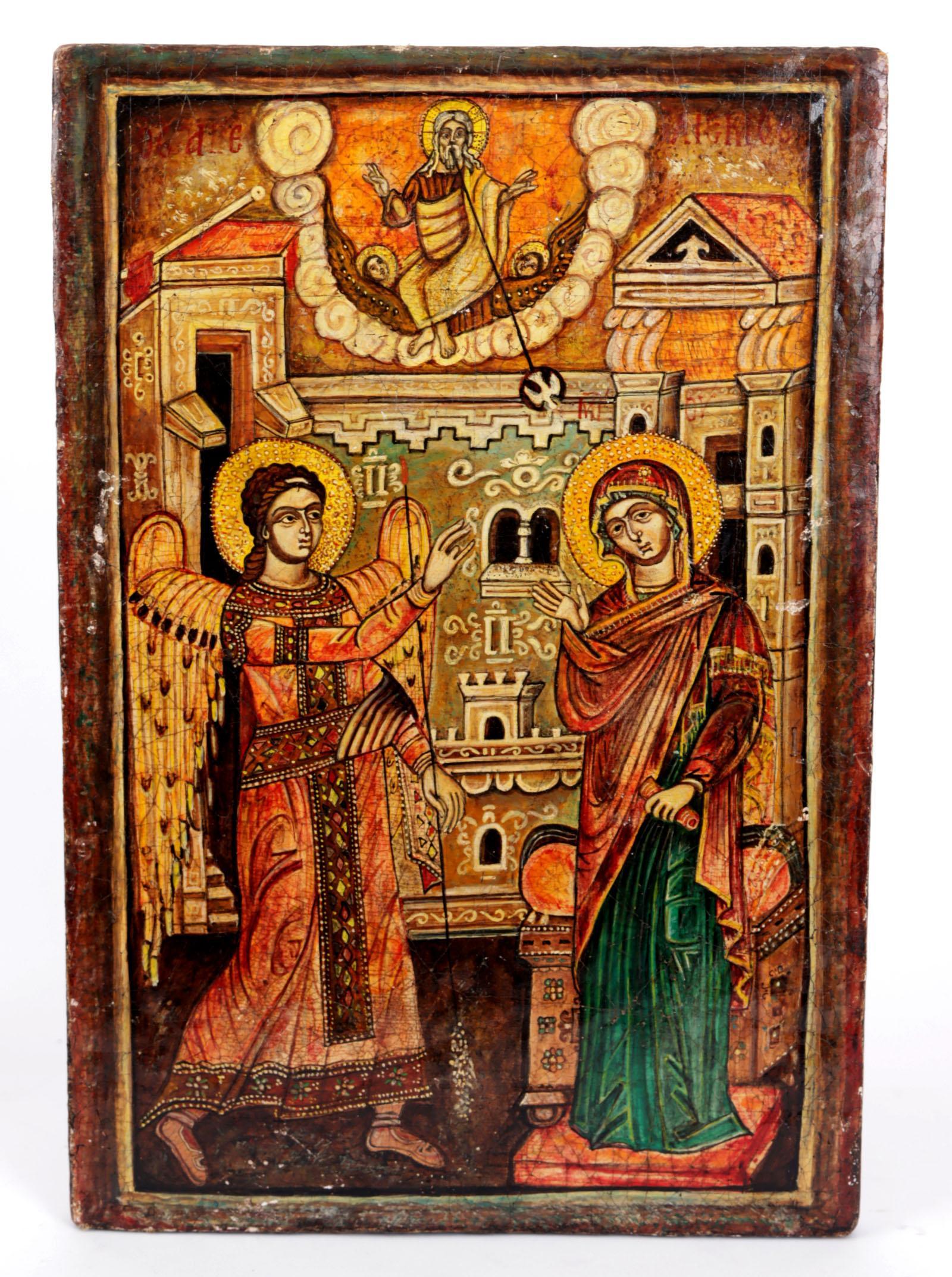 Oude Griekse ikoon, aartsengel Gabriël voor Maria verschijnt, tempra op paneel 39 x 26,5 cm., 18e/19e eeuw