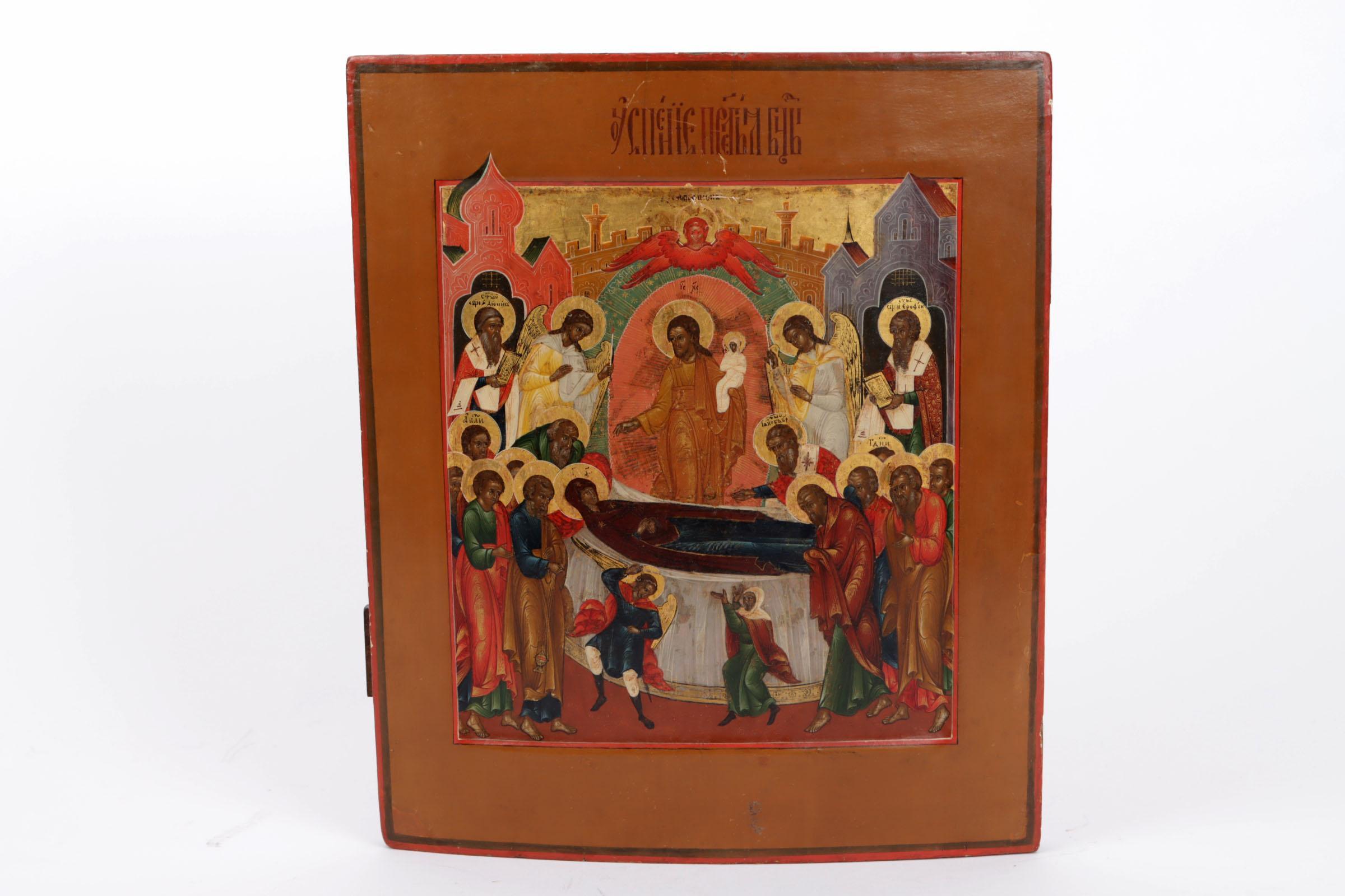 Russisch ikoon, Ontslaping van moeder Gods, tempra op paneel, 31 x 26,5 cm., 19e eeuw