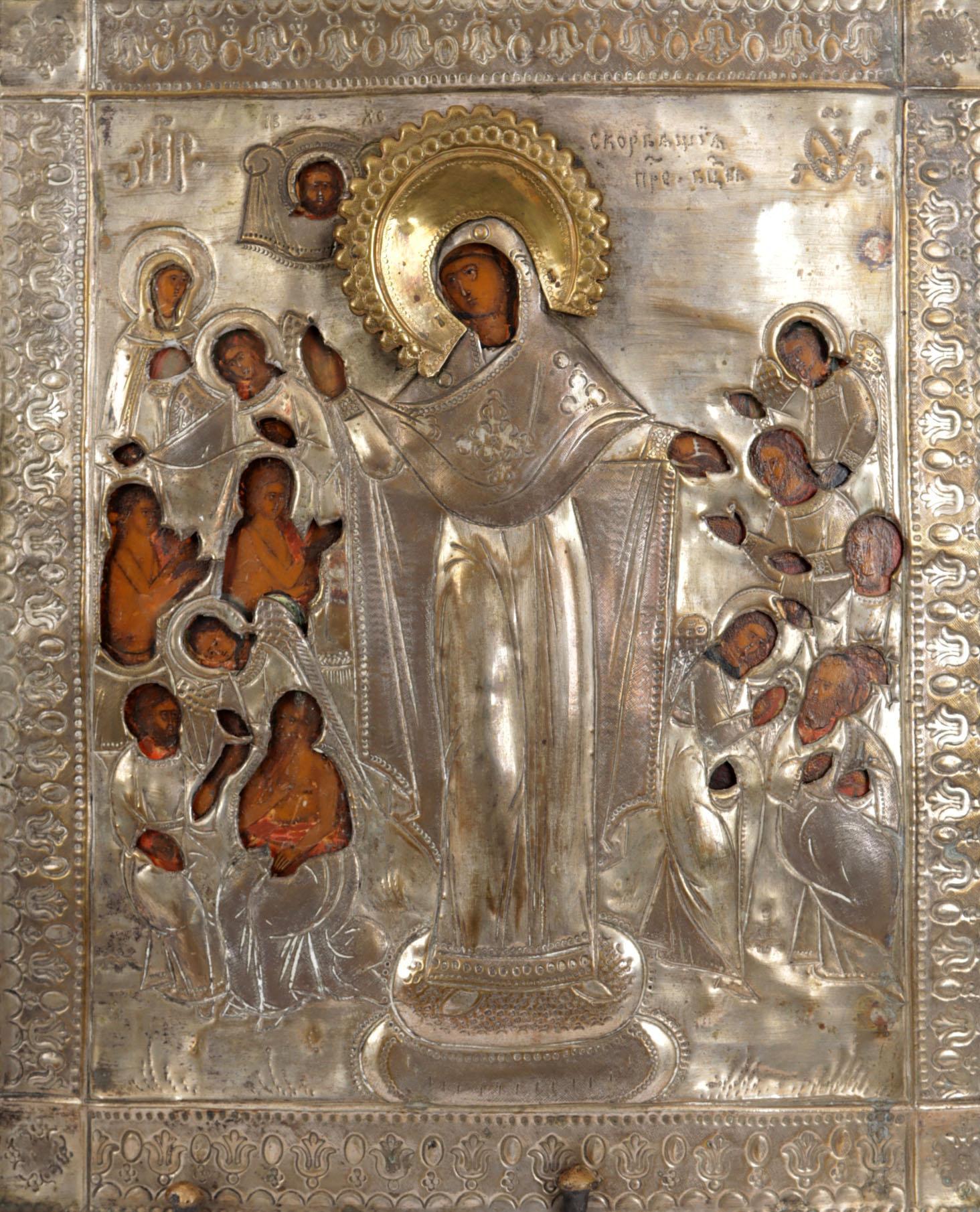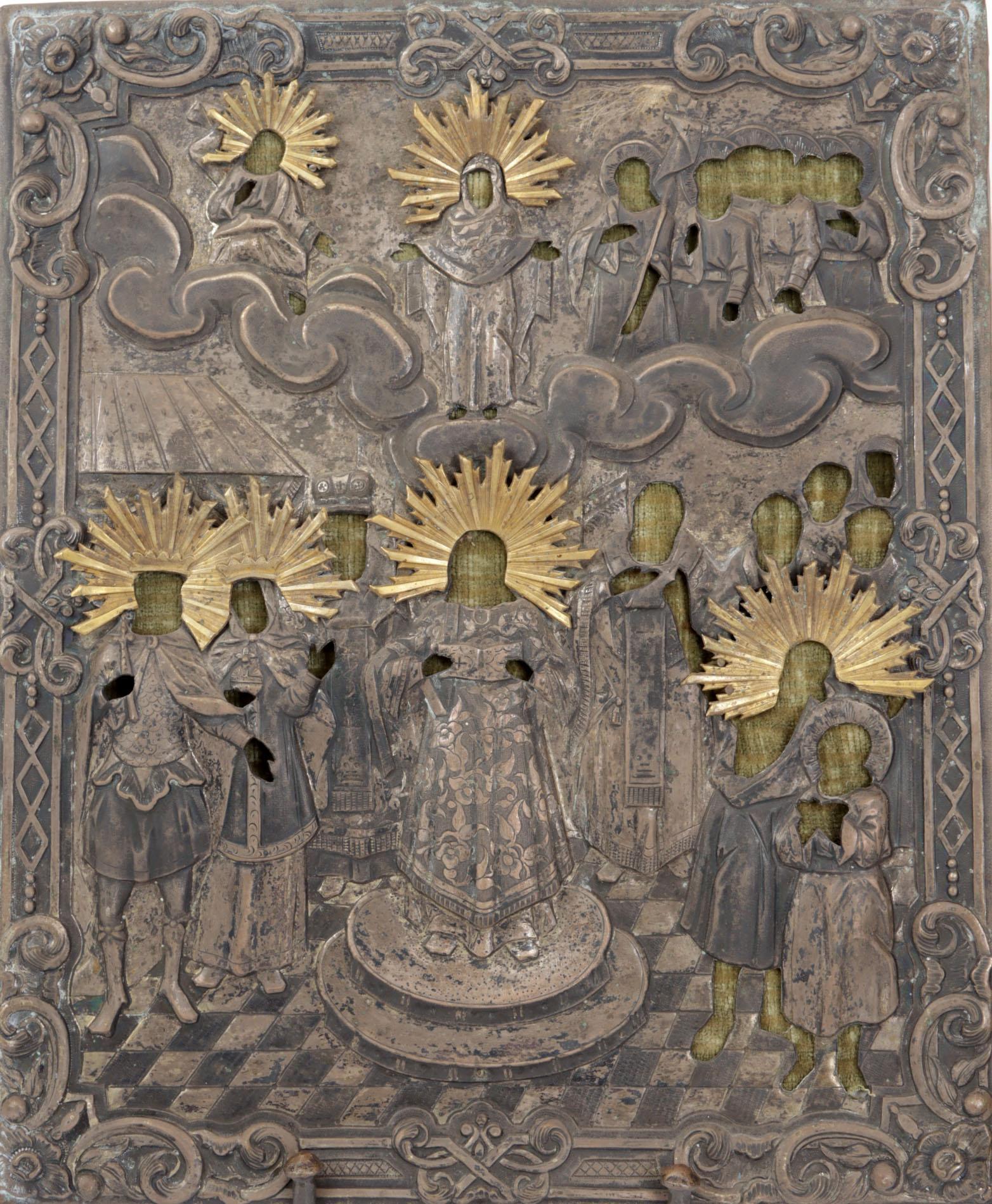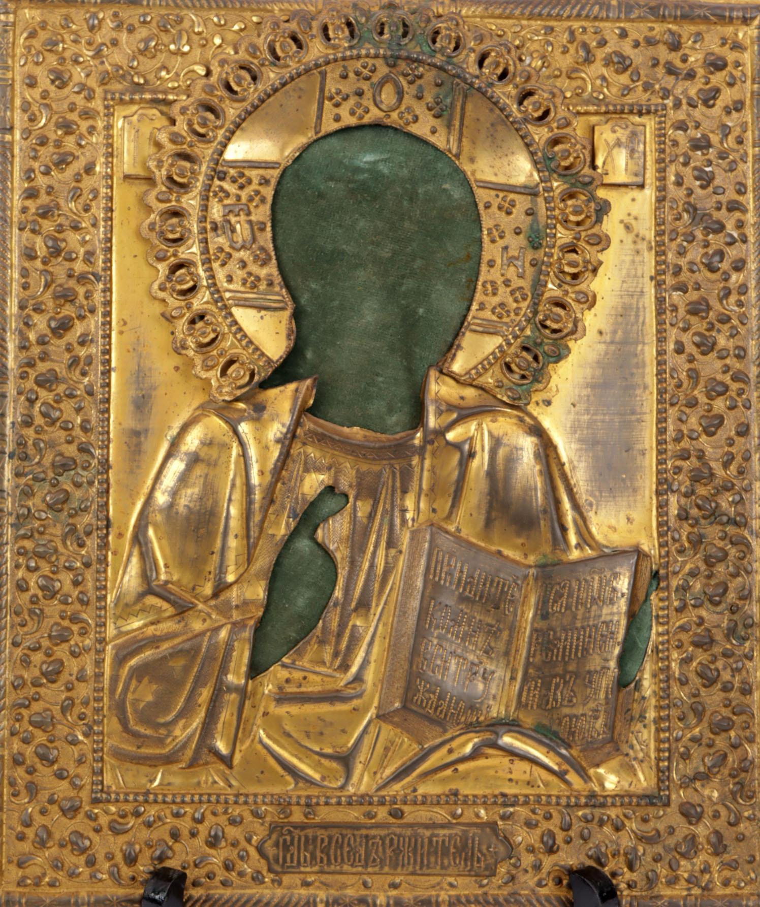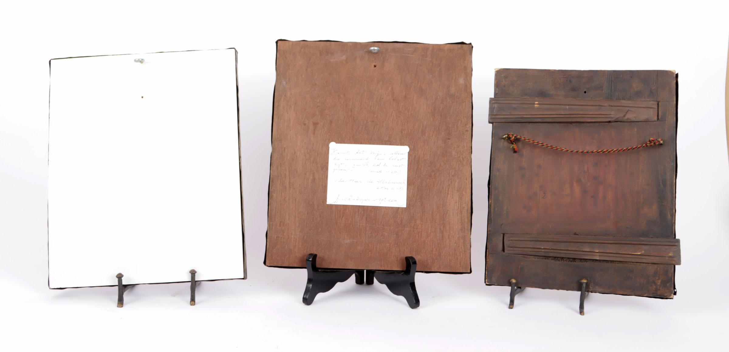 Drie diverse Russische ikonen met metalen monturen, ca.30 x 24 cm.
