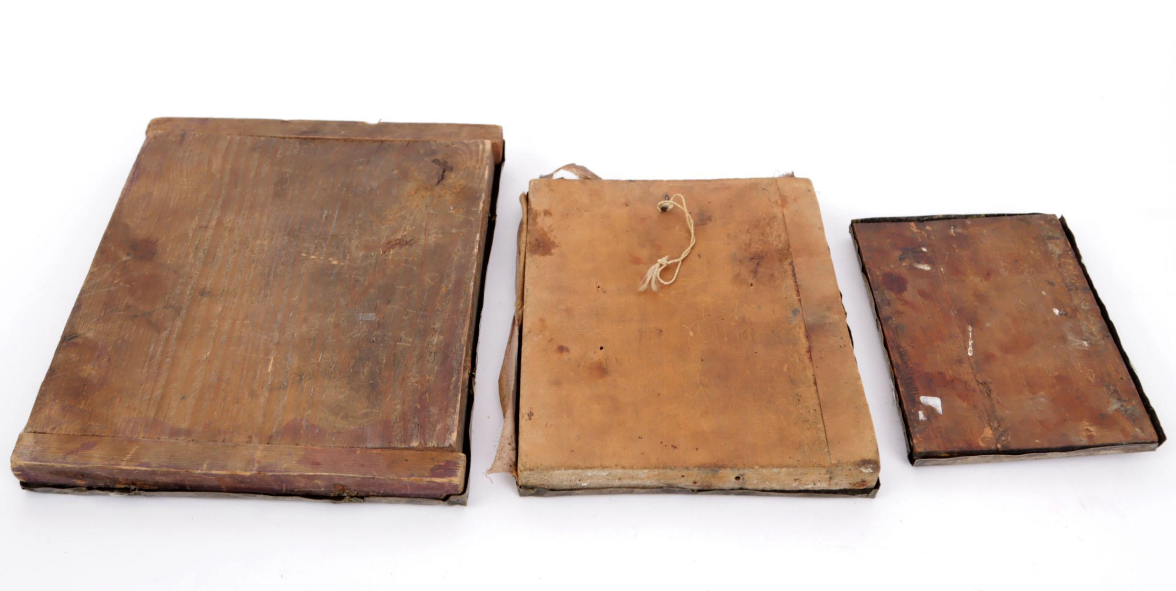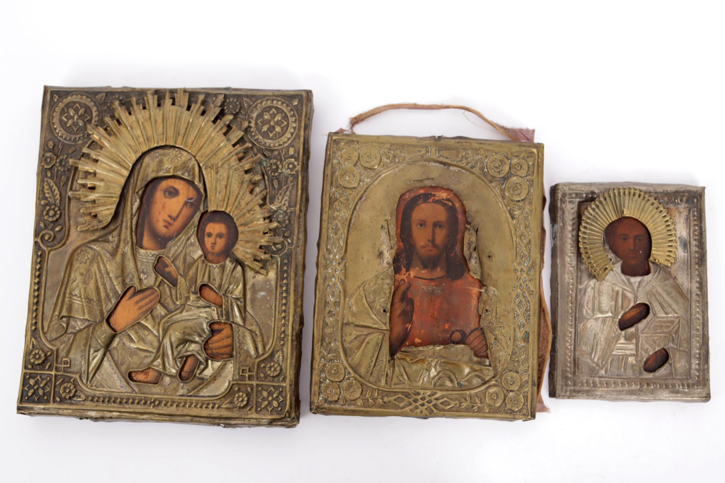 Koop van 3 oude ikonen met metalen mantels, 27 x 22 cm., 22 x 18 cm. en 17 x 13 cm.