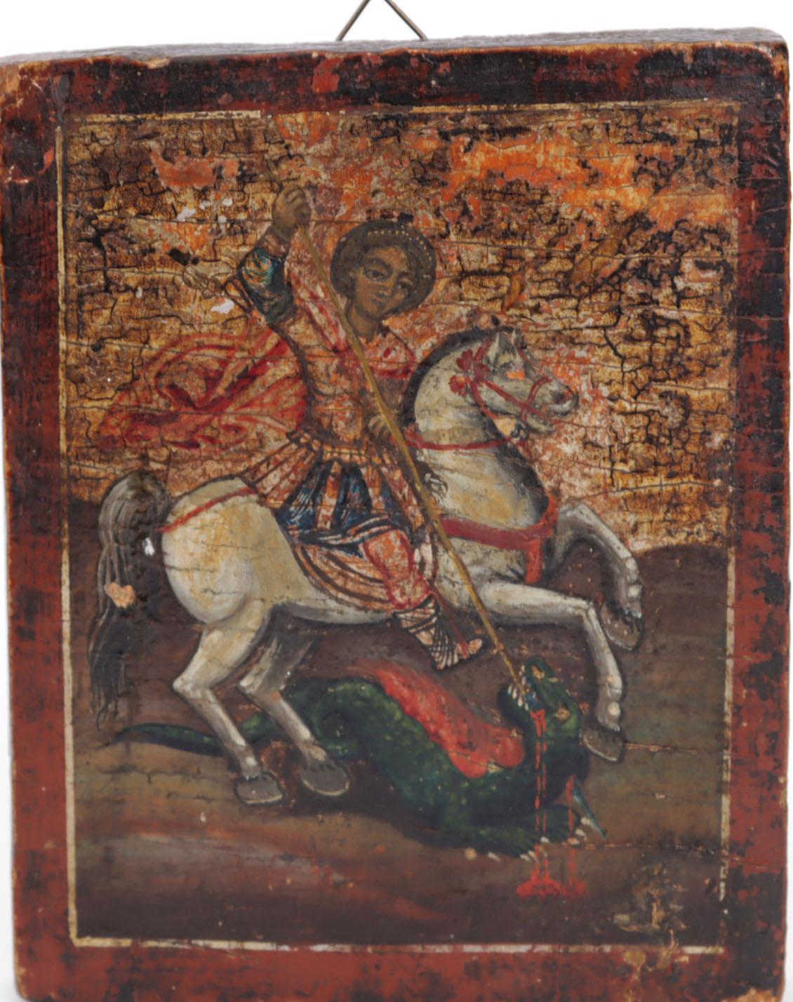 Oude ikoon, St. Joris en de Draak, tempra op paneel, 15 x 12 cm.