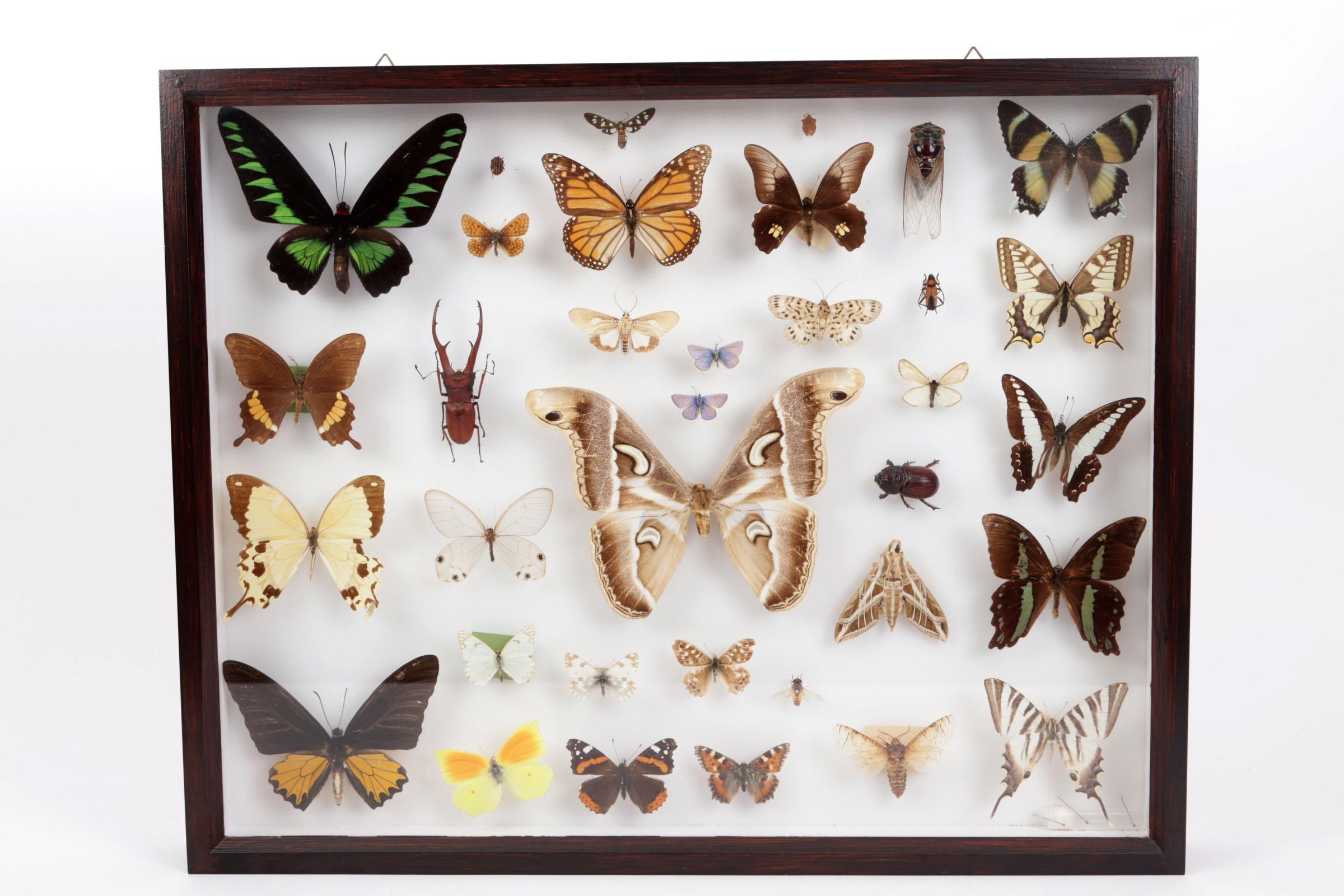 Insectenkabinet met diverse vlinders en torren, 19e eeuw, 50 x 40 cm.