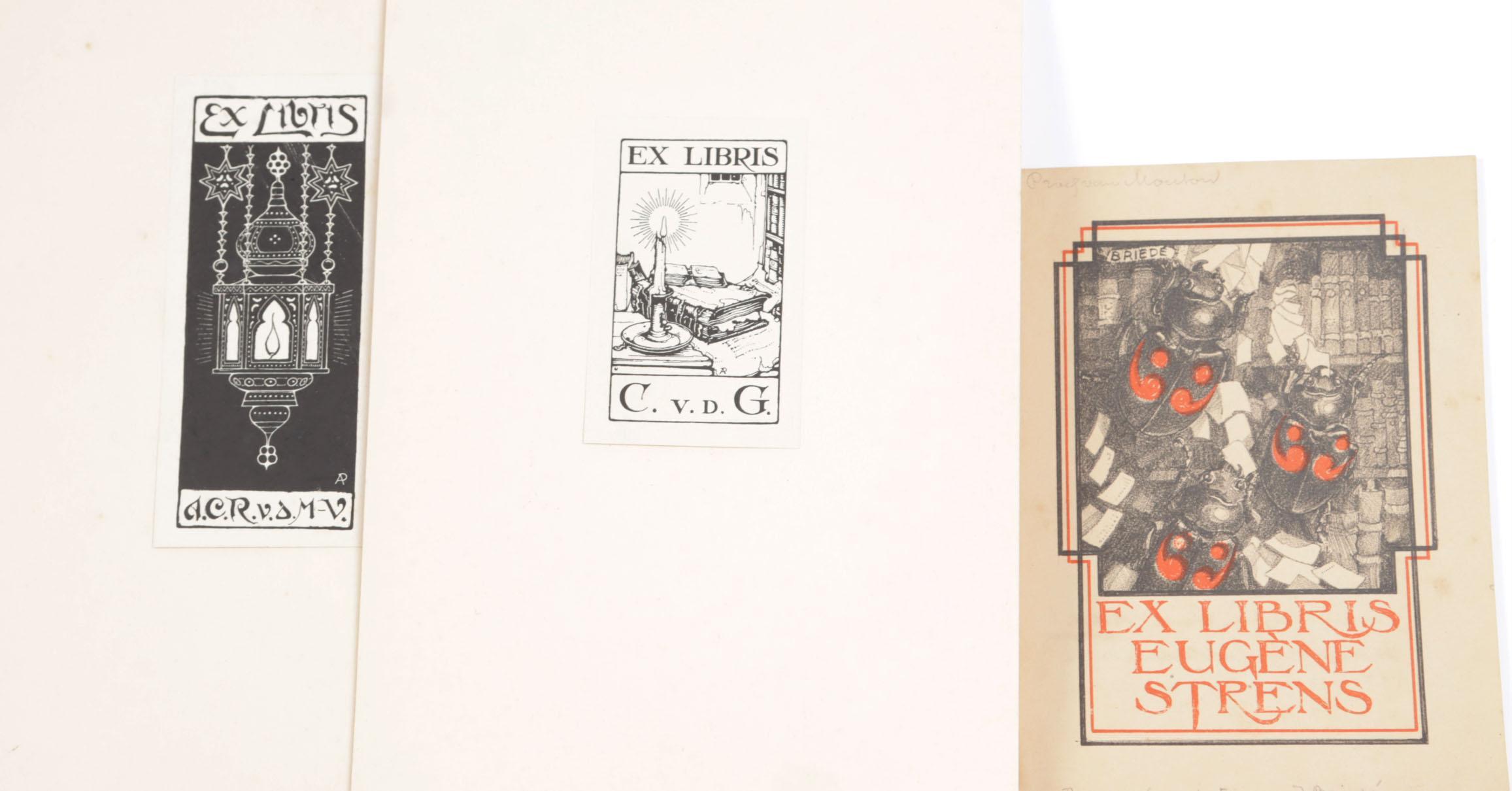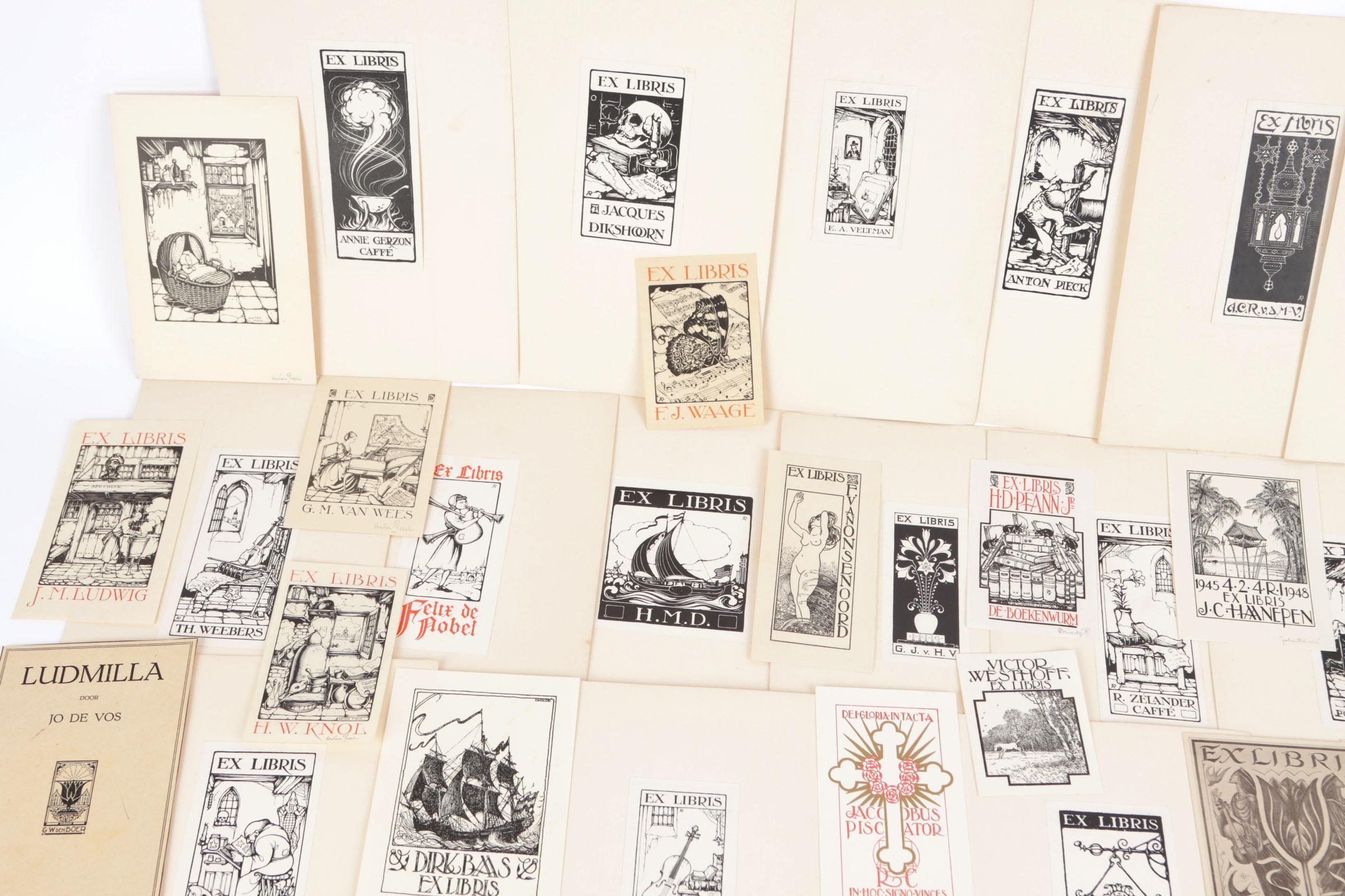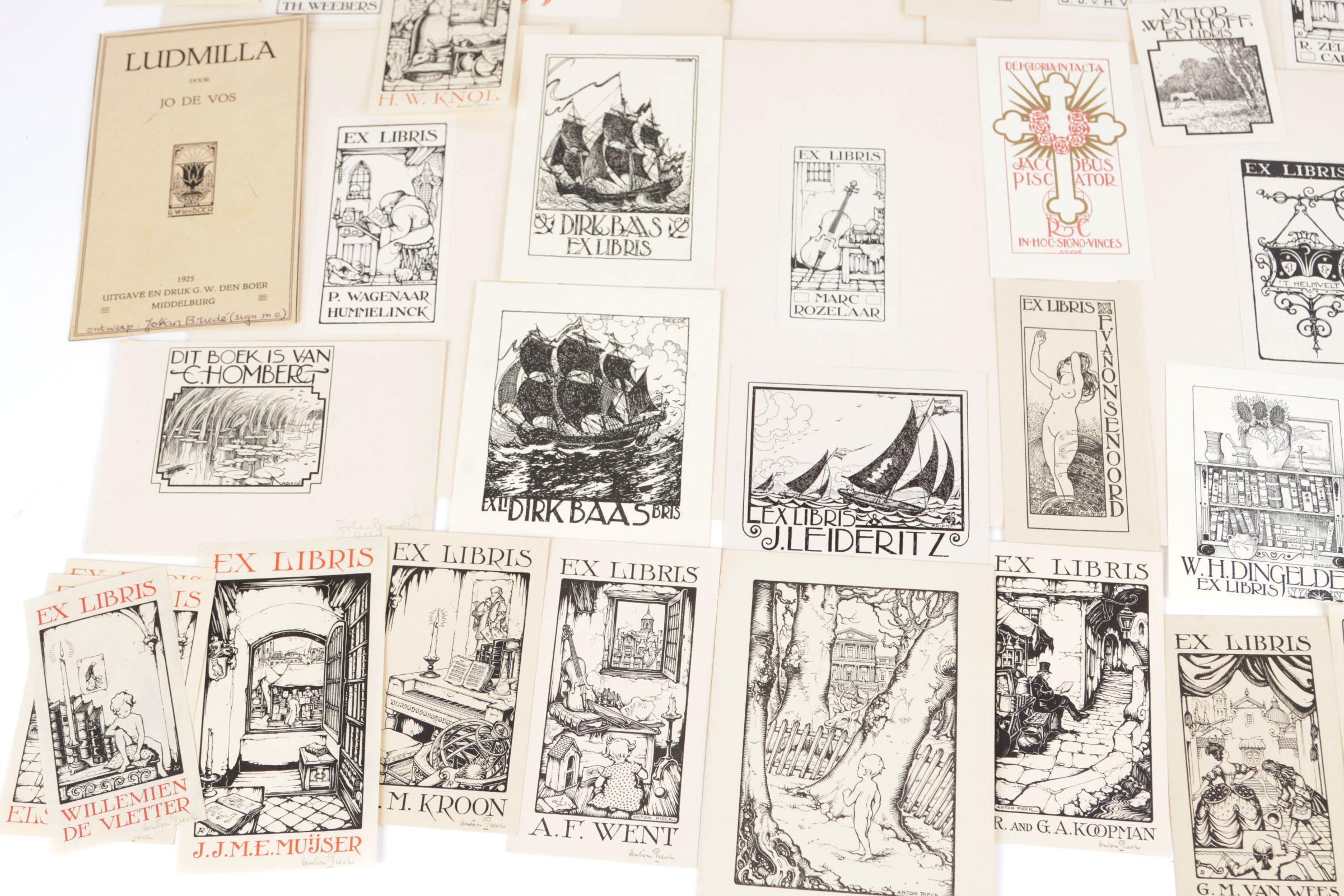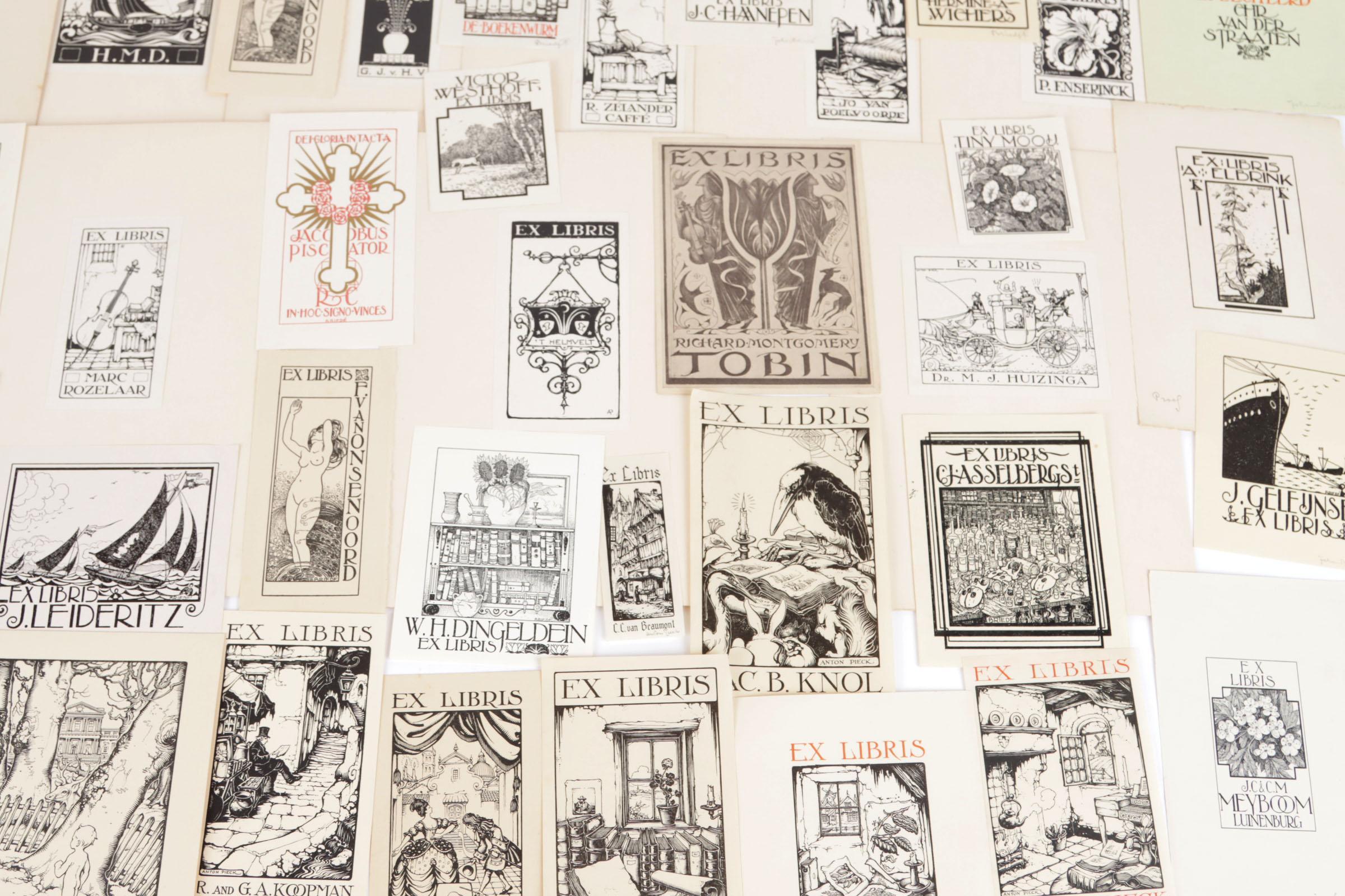 Collectie plm. 55 Ex-Libris/klein grafiek. Anton Pieck, 16x gesigneerd, 20x niet gesigneerd (cliché/houtsnede), Joh. Briedé, 7x gesigneerd, 13x niet gesigneerd (cliché), W.A. v. Konijnenburg, Ex-Libris (Tobin), litho