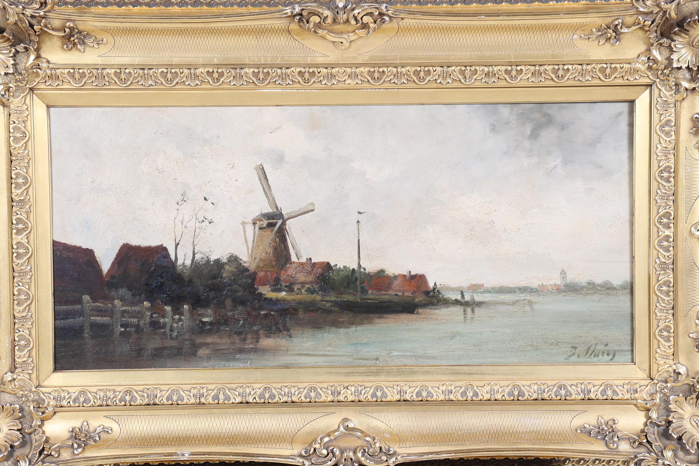 Omgeving J. Maris, Rivierlandschap met molen, olieverf op paneel, 80 x 36 cm.