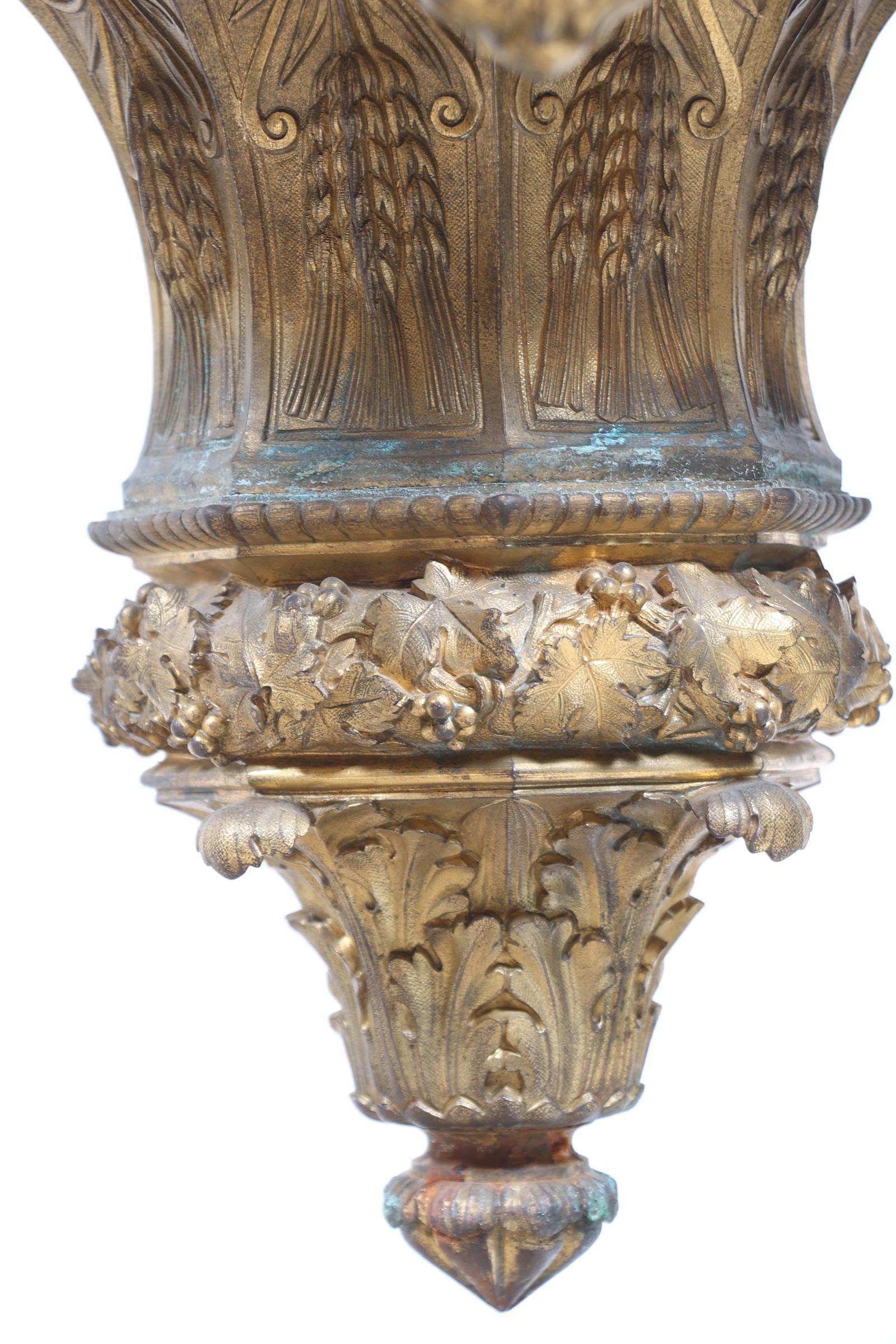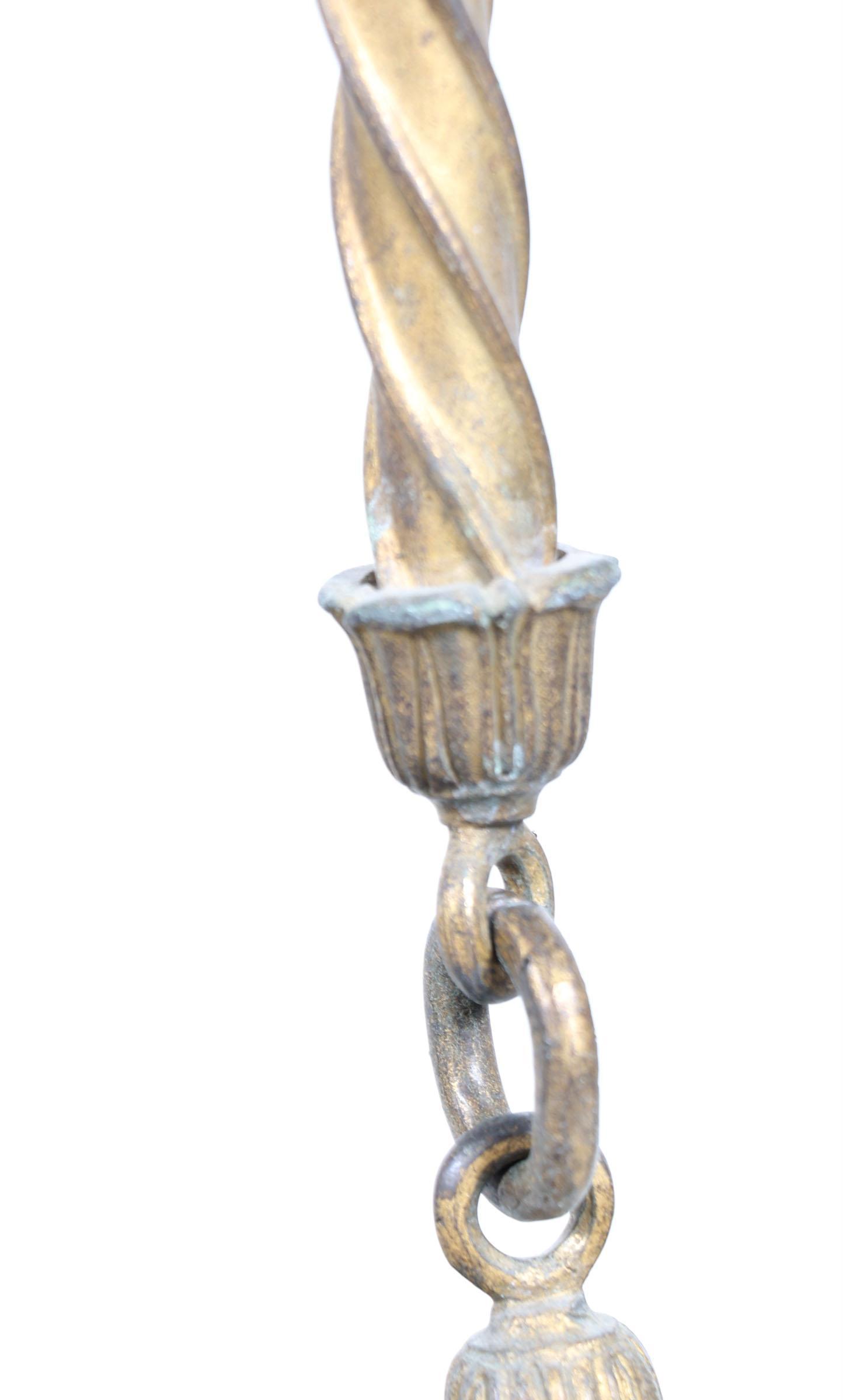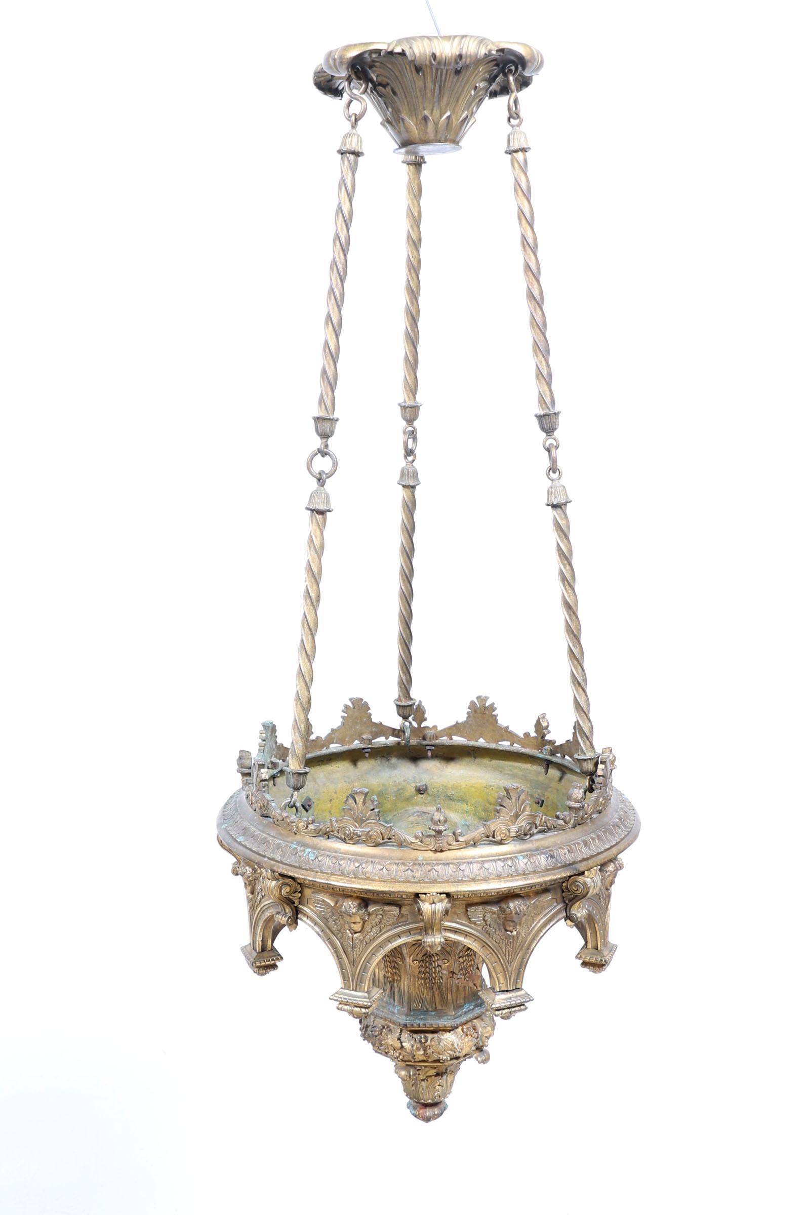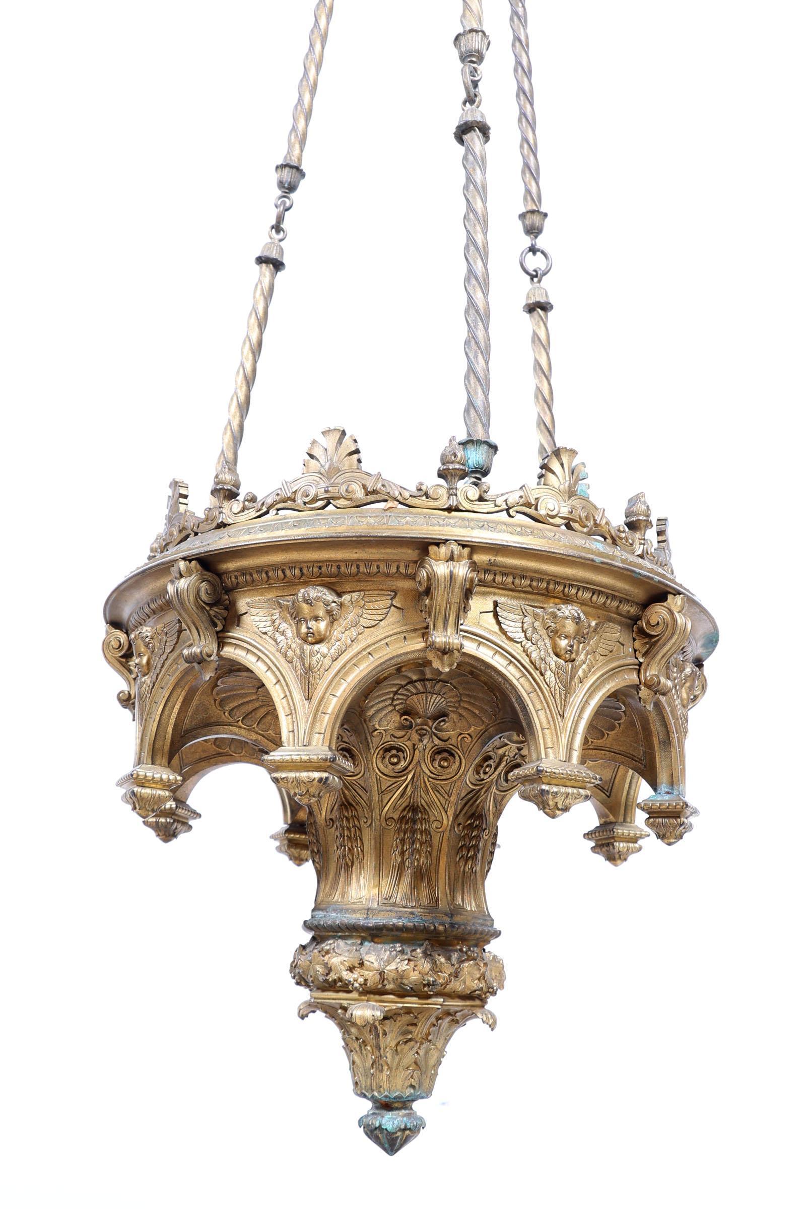 Antieke rijkbewerkte met engelenhoofden gedecoreerde koperen godslamp, ca. h.140 x diam.46 cm.