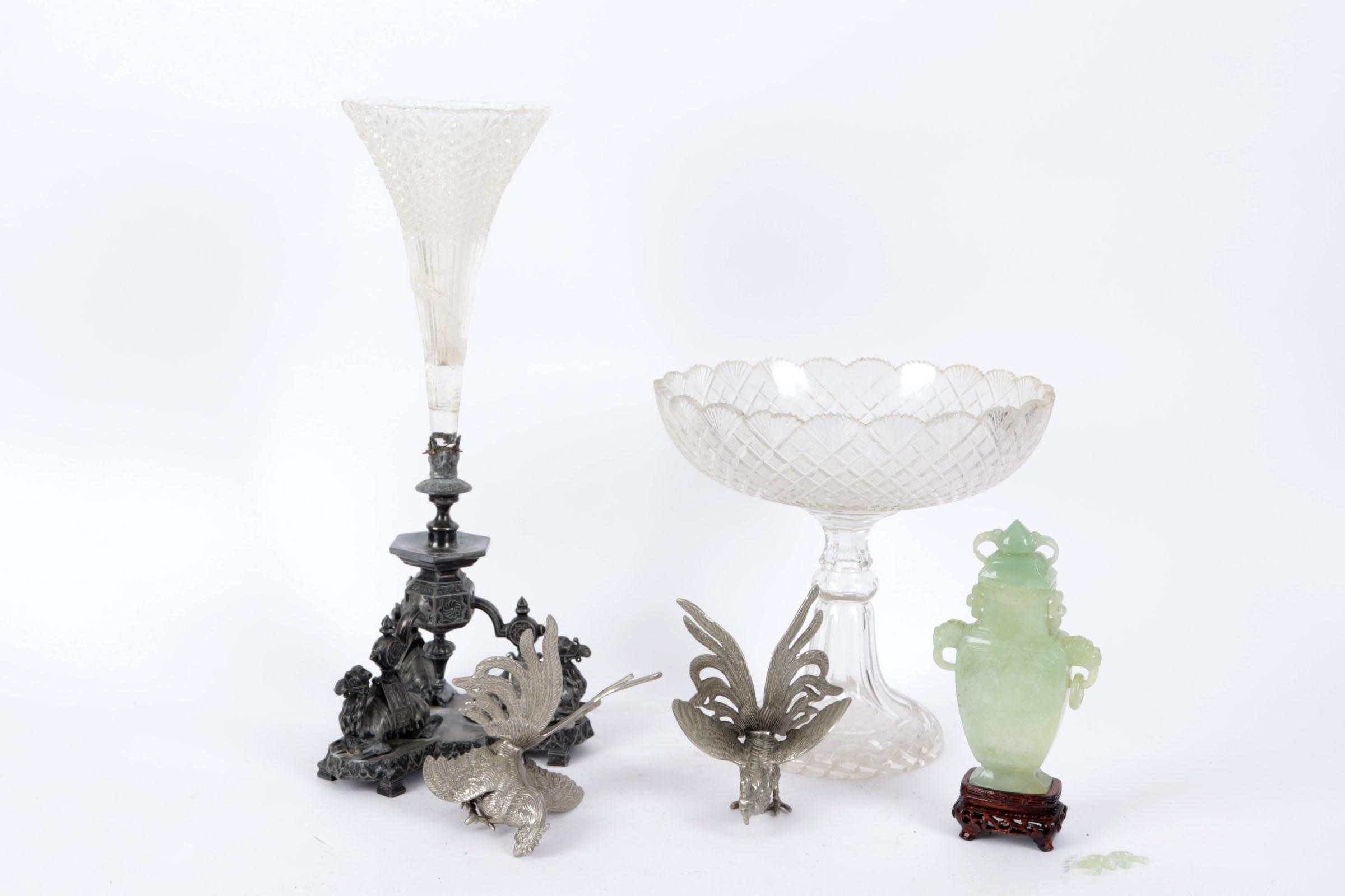 Koop van kristallen schaal, jade glazen vaasje op sokkel, piece de milieu op pleet onderstel en 2 tafelhanen