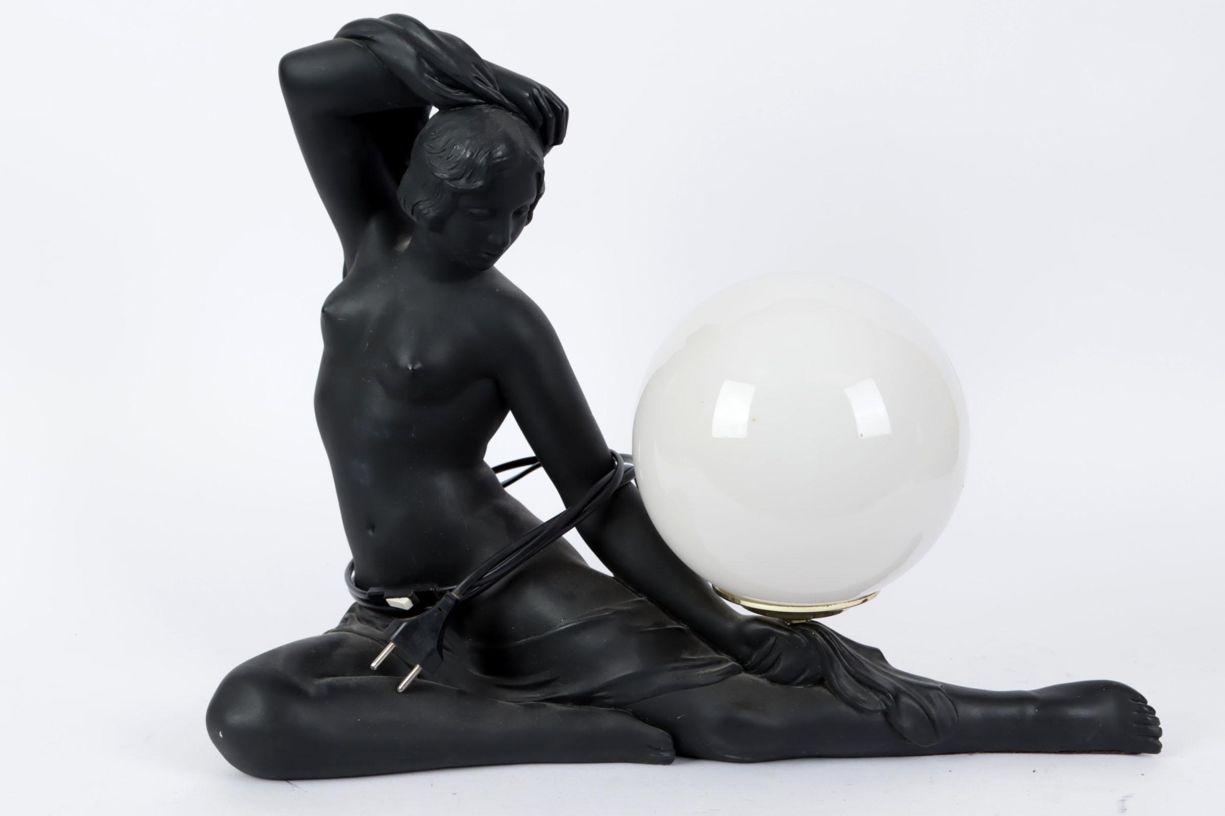 Zwart gelakt gipsen beeld van een Art Deco zittende dame met lamp, h.40 b 52 x d29 cm.