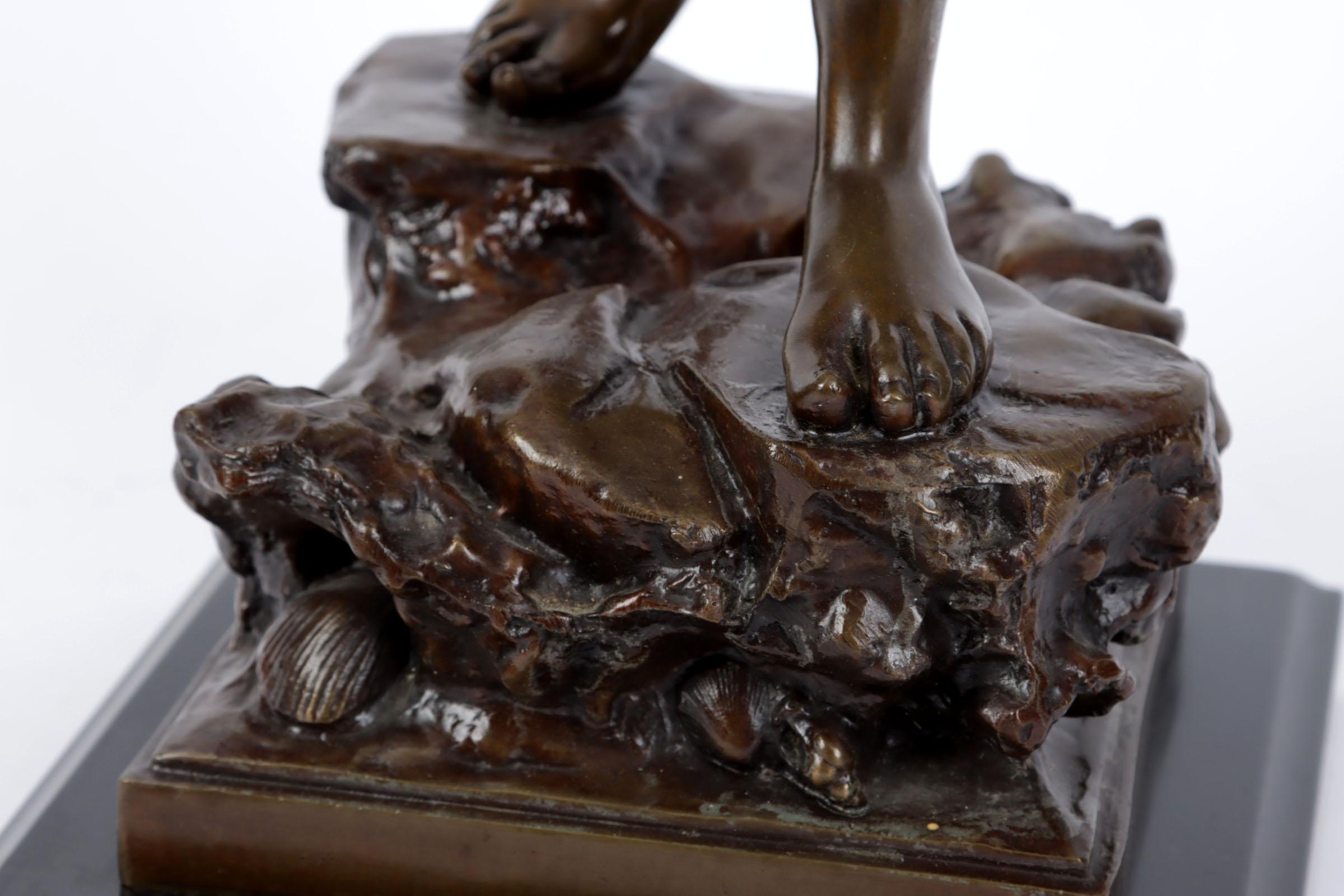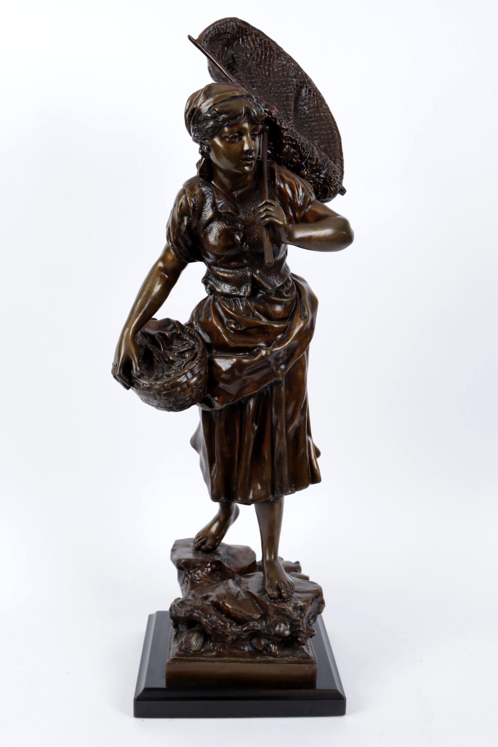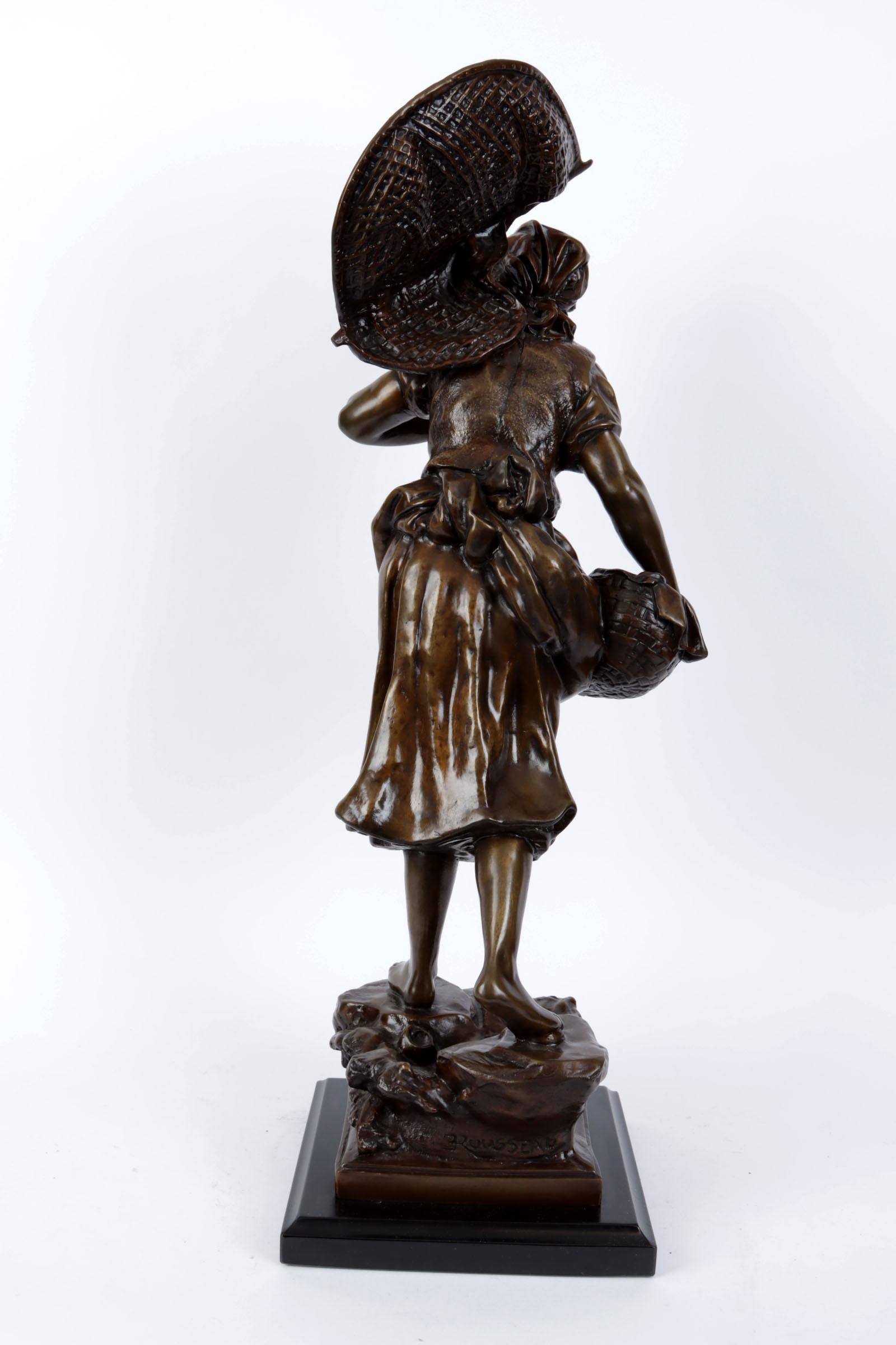 Bronzen beeld van vrouw met schepnet rustend op hardstenen sokkel naar Rousseau, h.78 cm.
