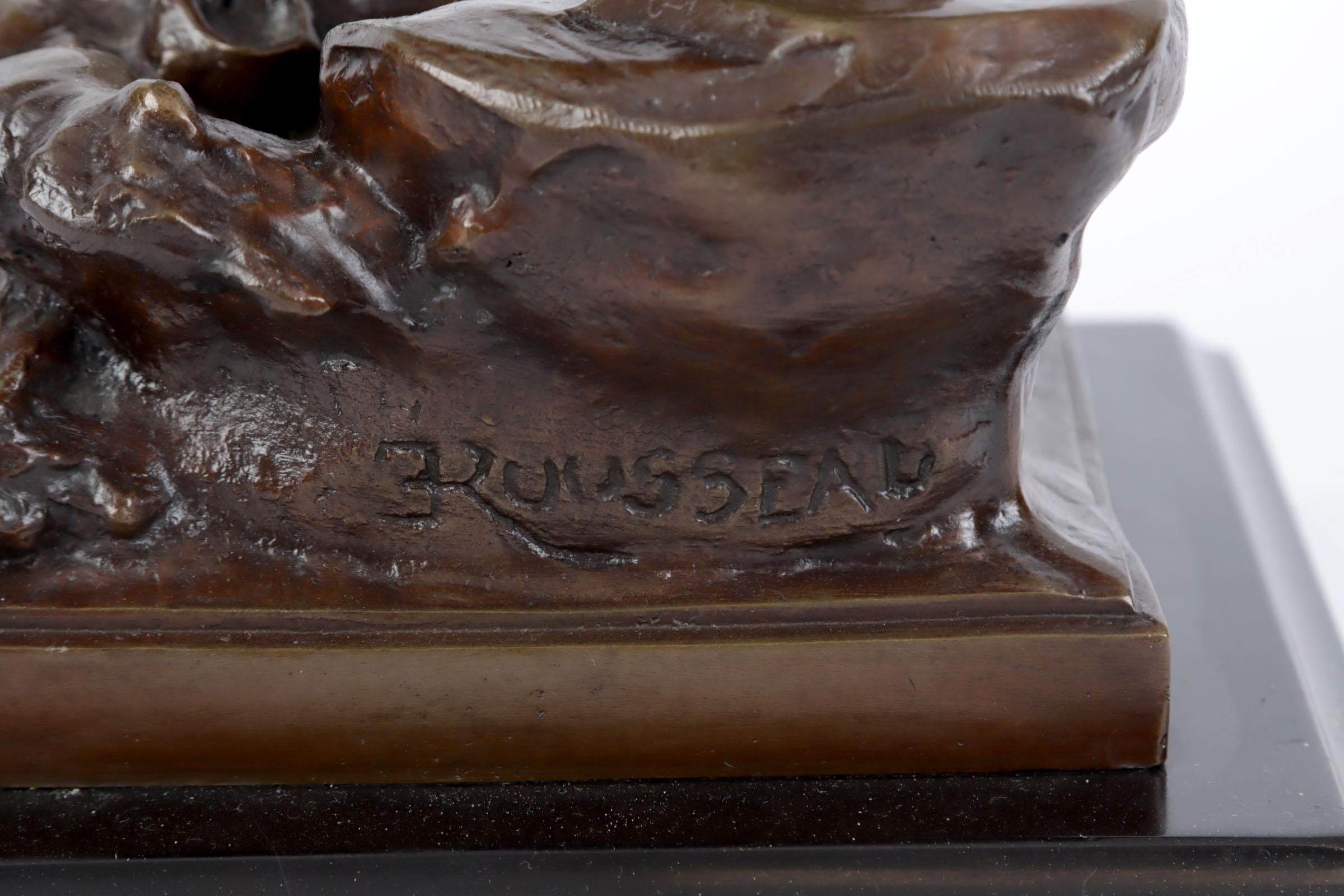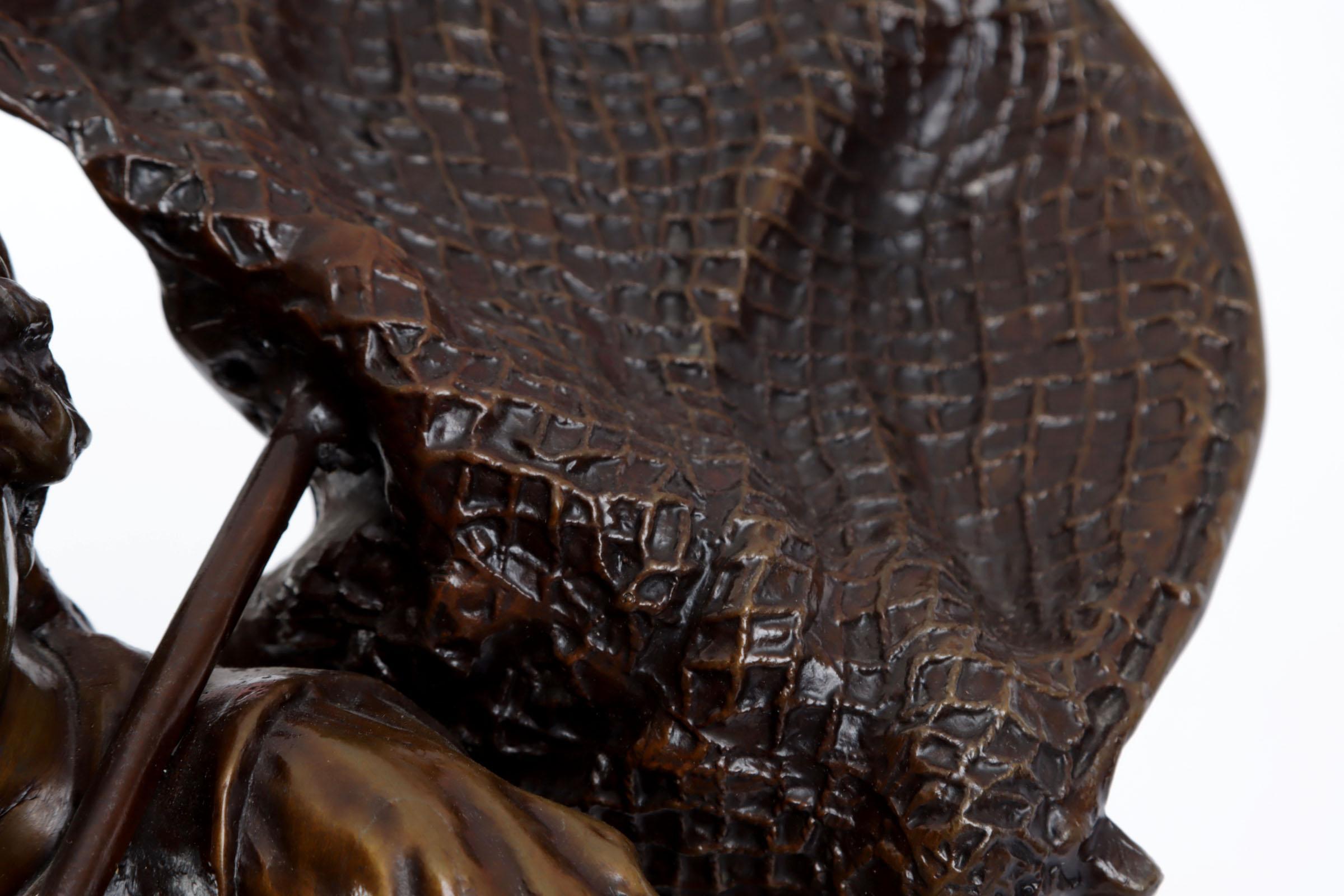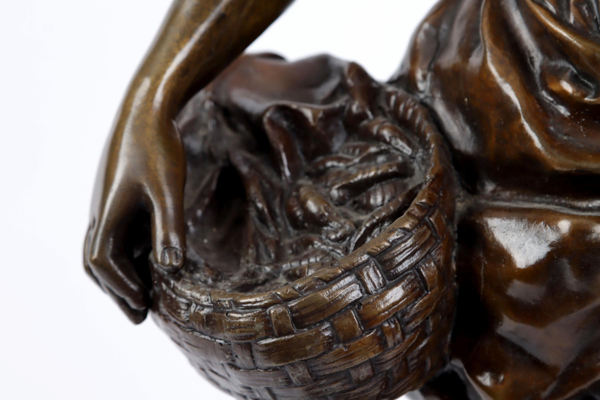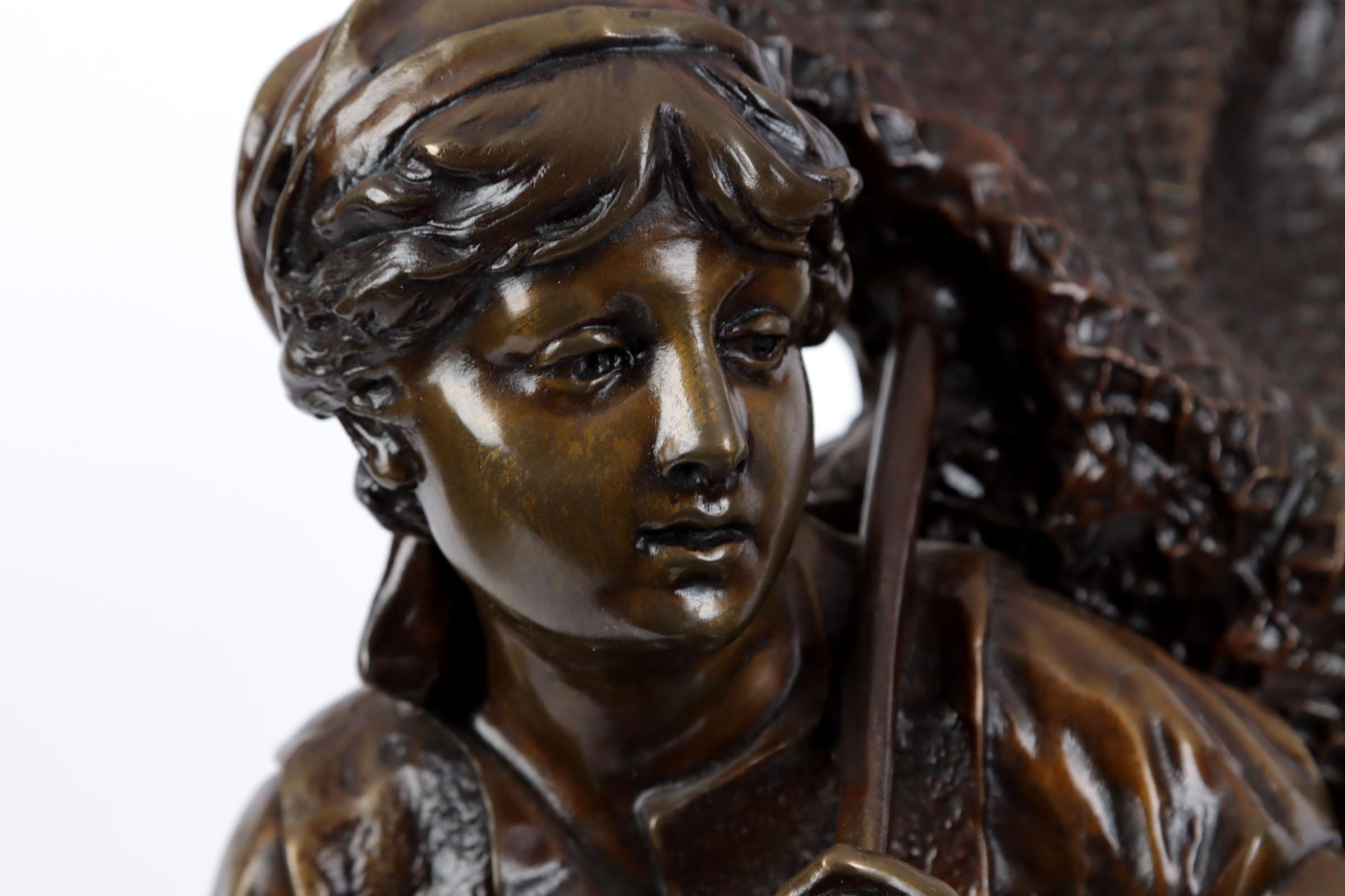 Bronzen beeld van vrouw met schepnet rustend op hardstenen sokkel naar Rousseau, h.78 cm.