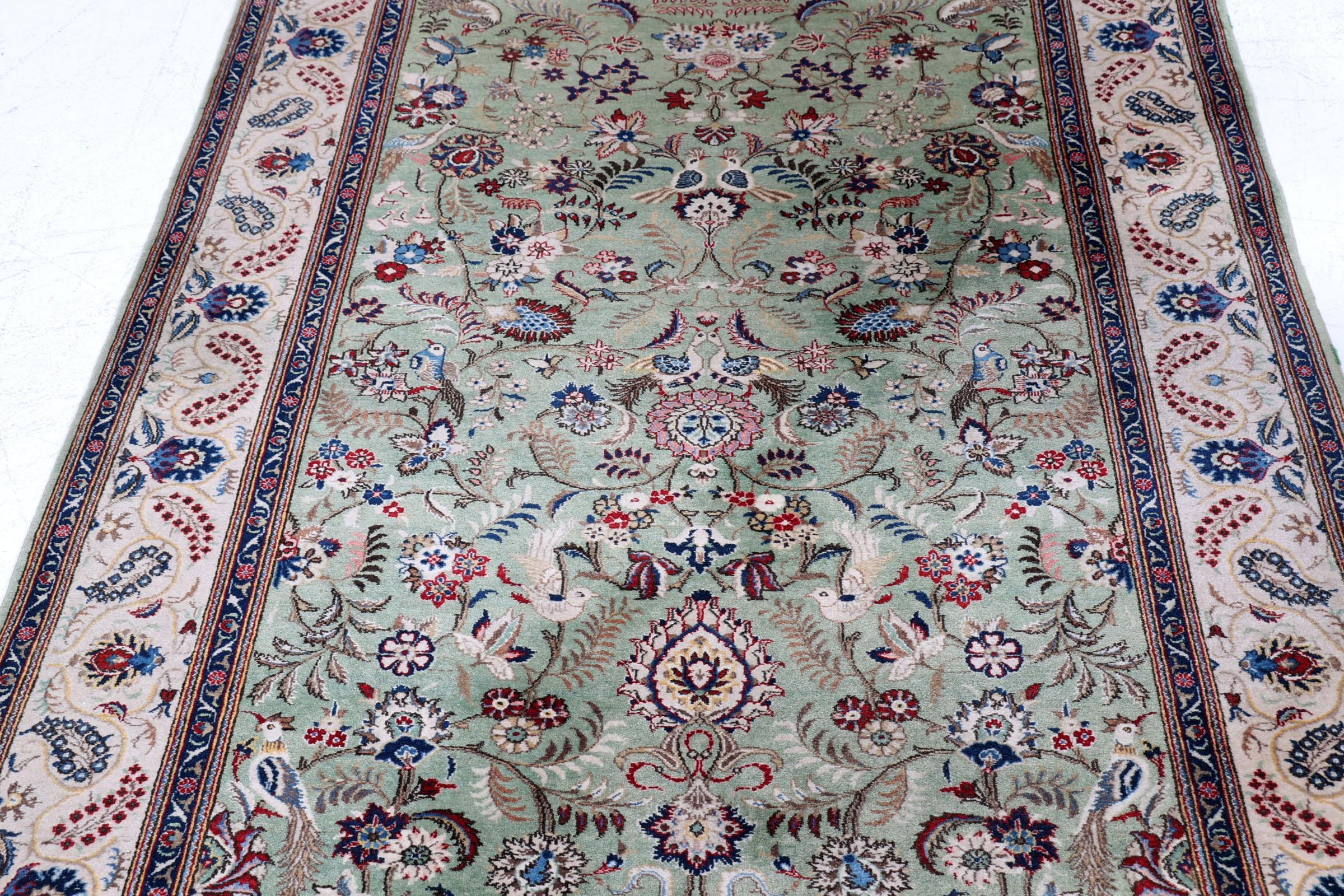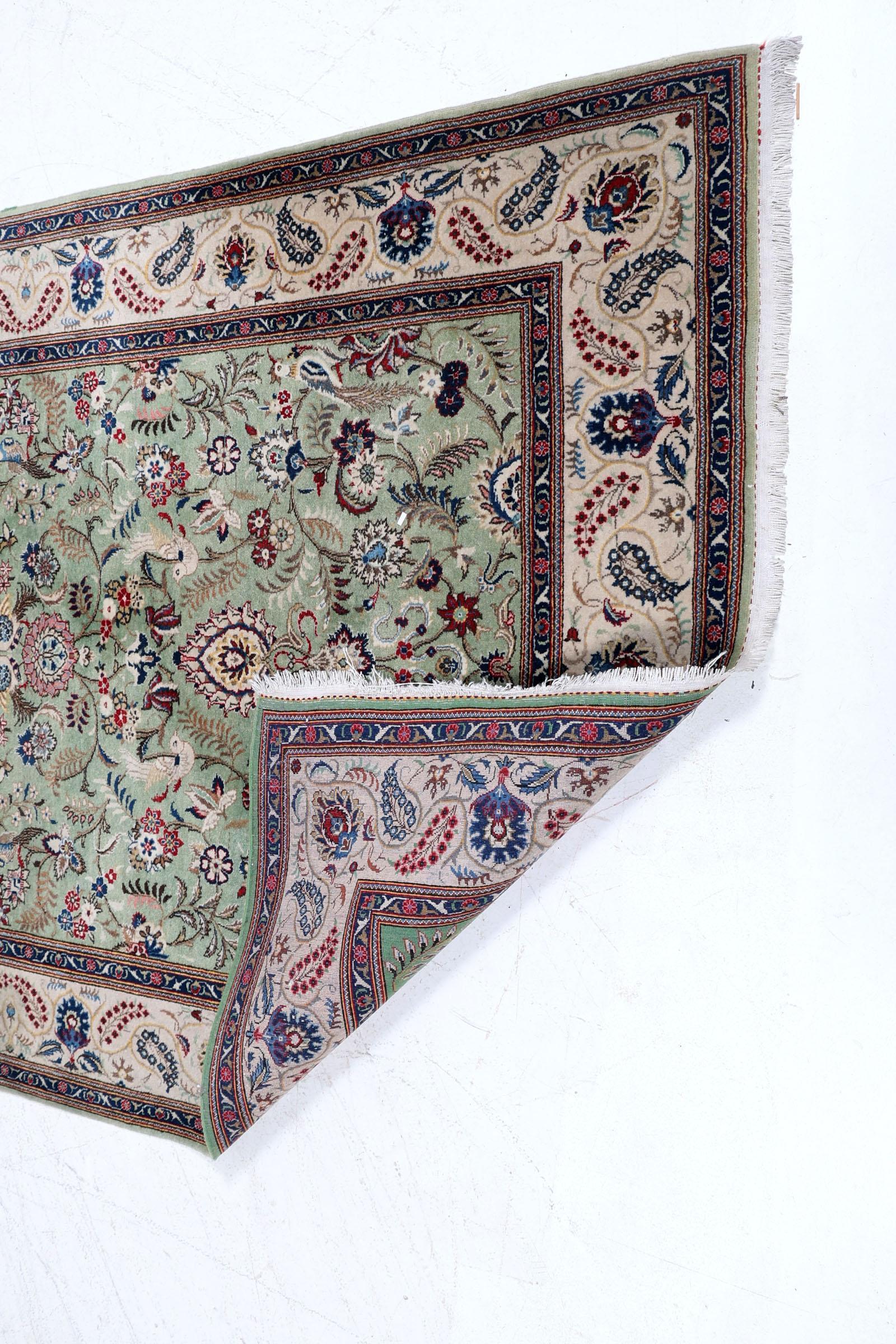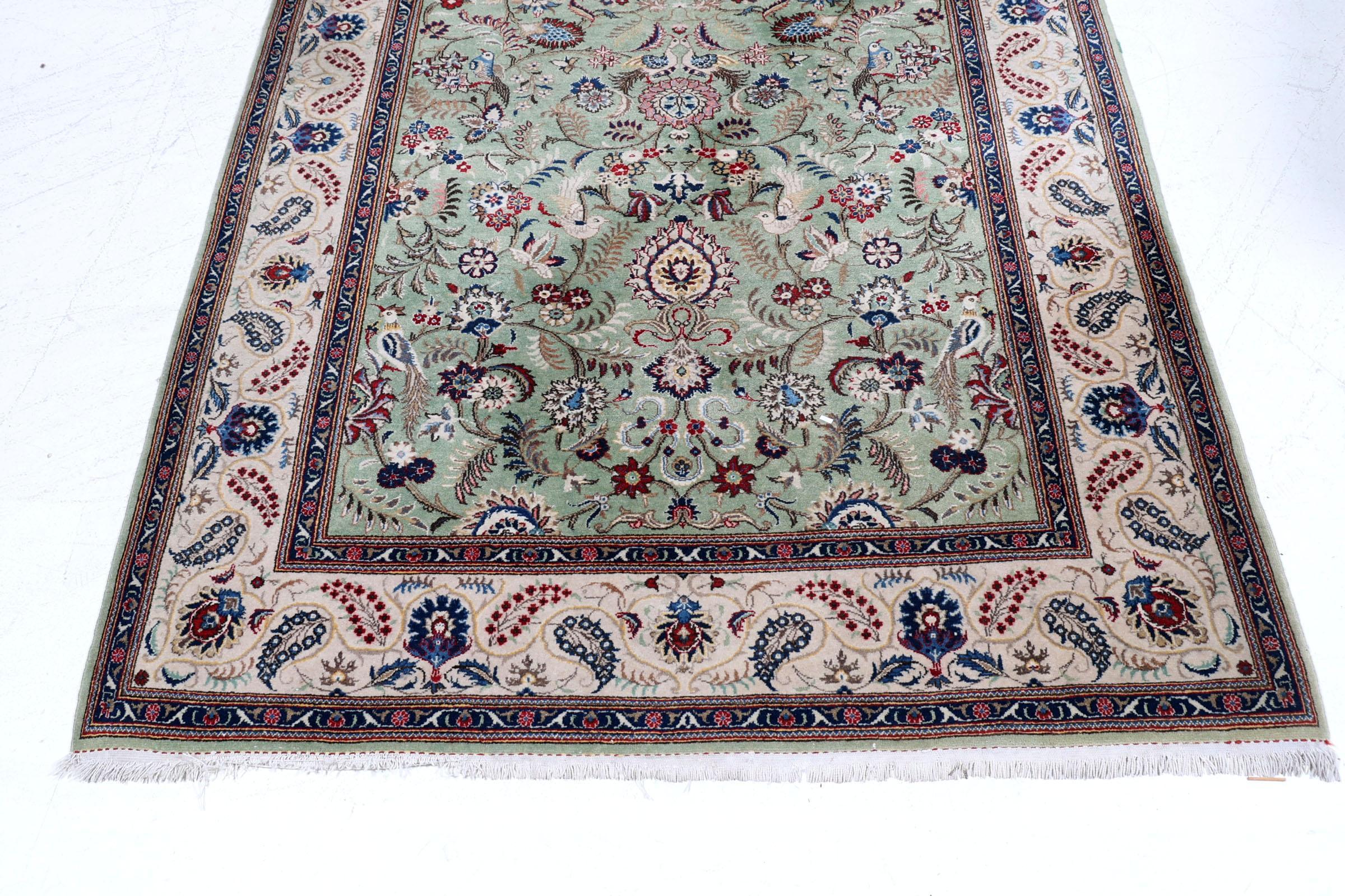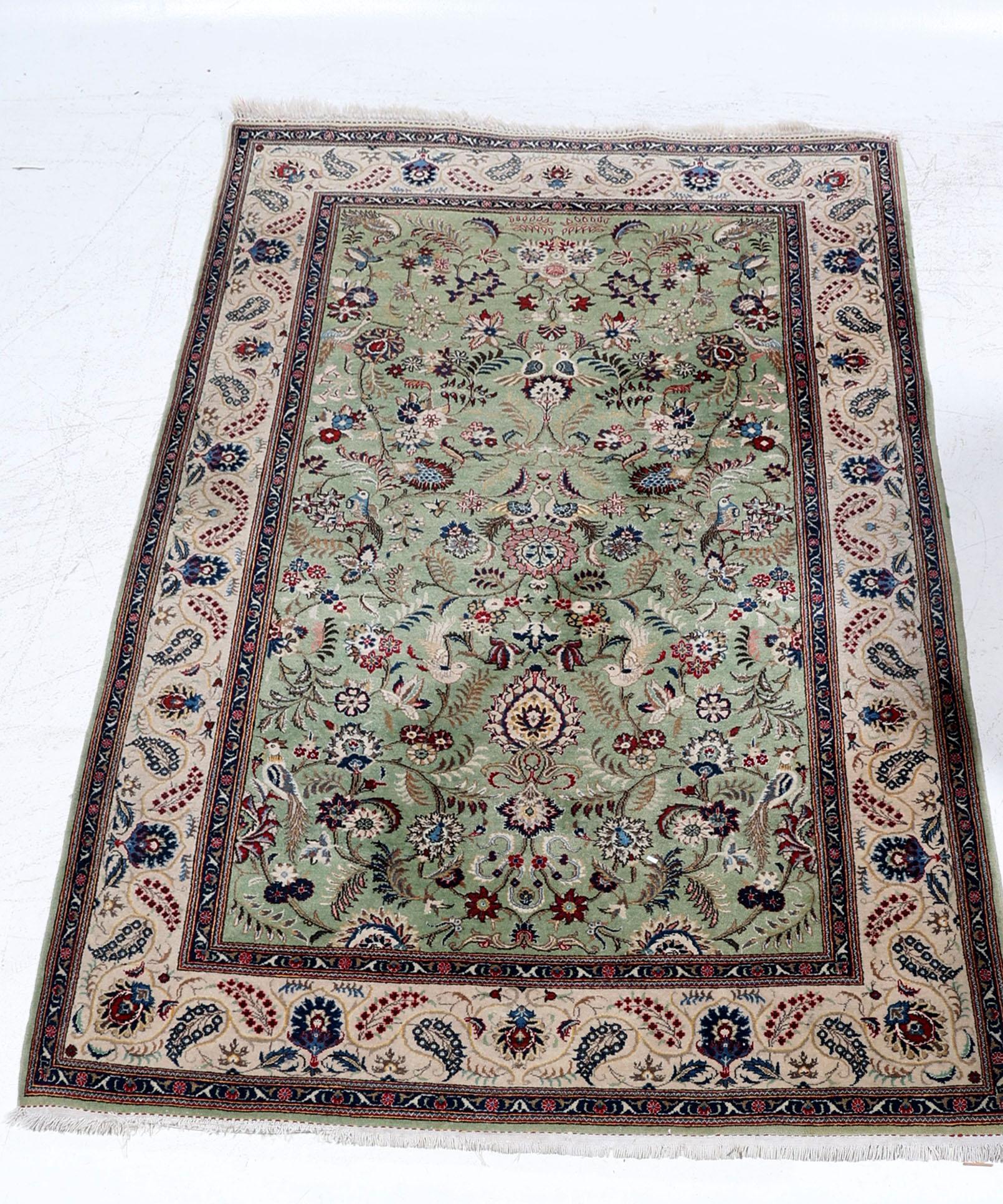 Handgeknoopt kleed met groen font vogel en bloemendecoraties, 212 x 134 cm.