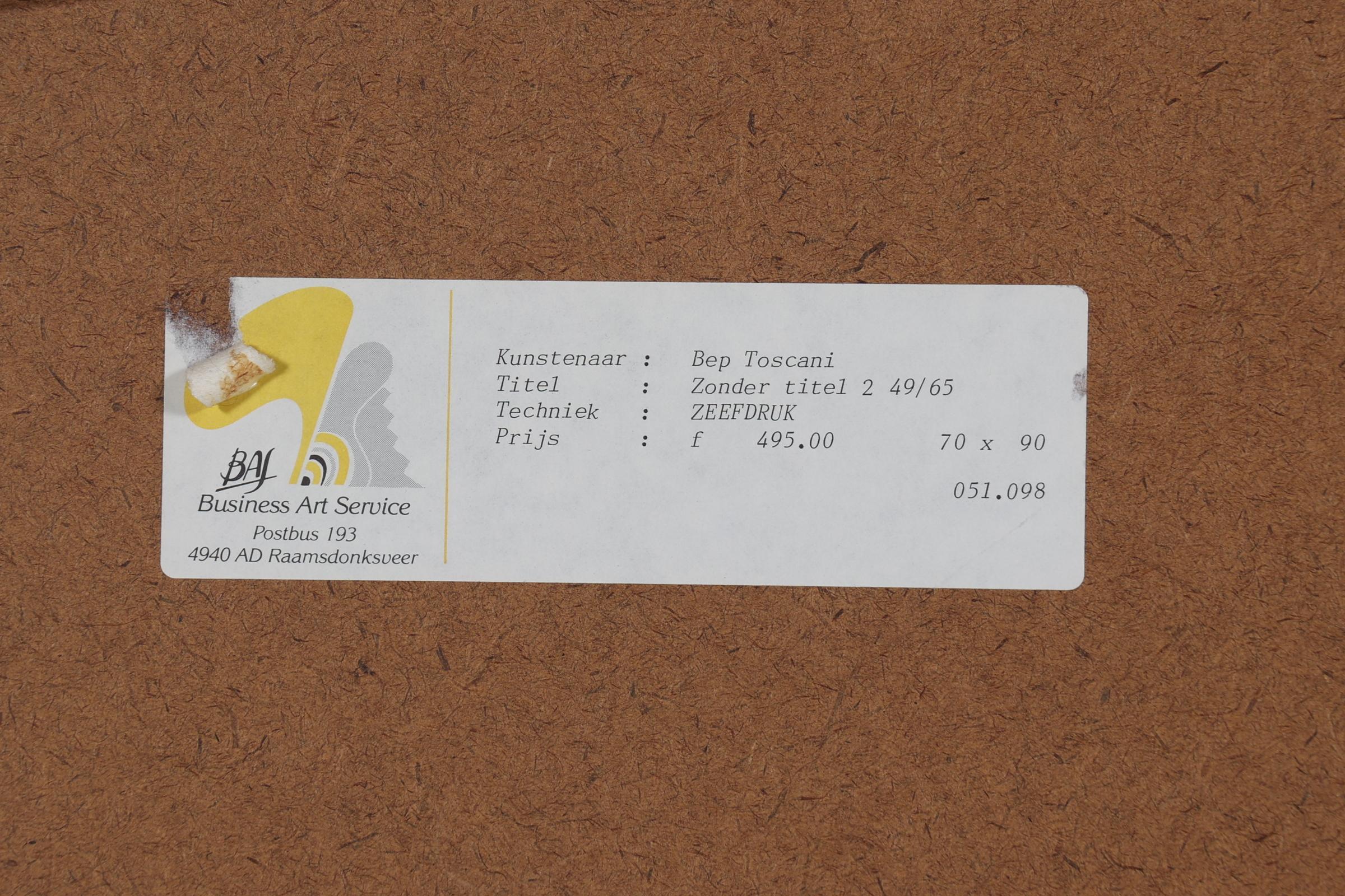 Bep Toscani, Zonder titel 2, handgesigneerde zeefdruk, genummerd 49/65, gedateerd 1990, 70 x 90 cm.