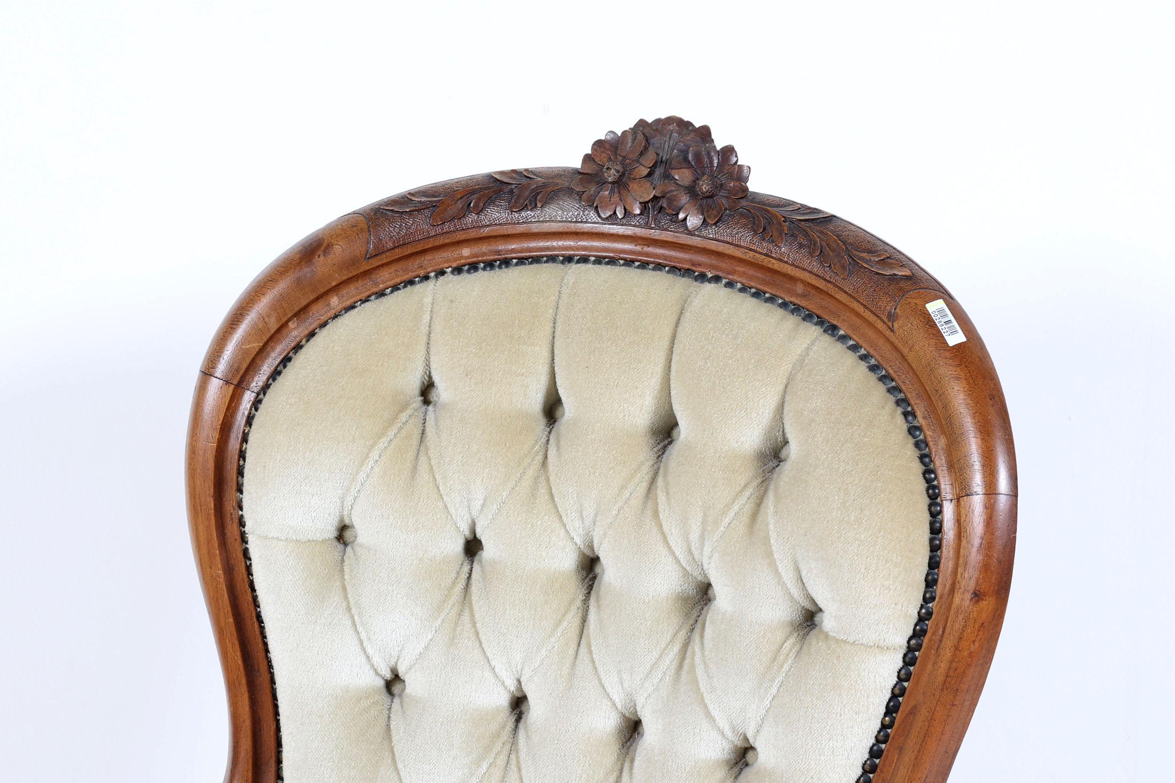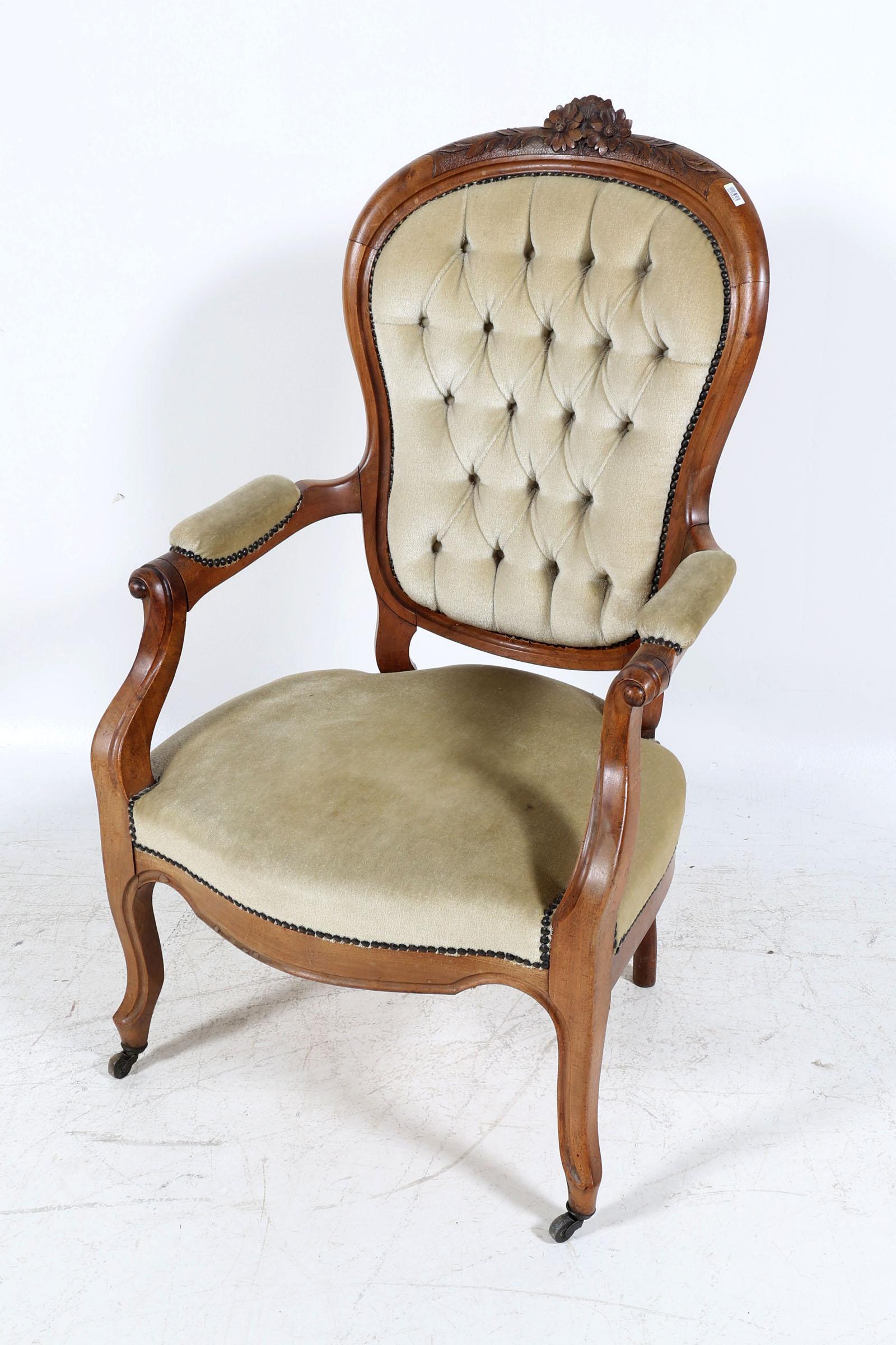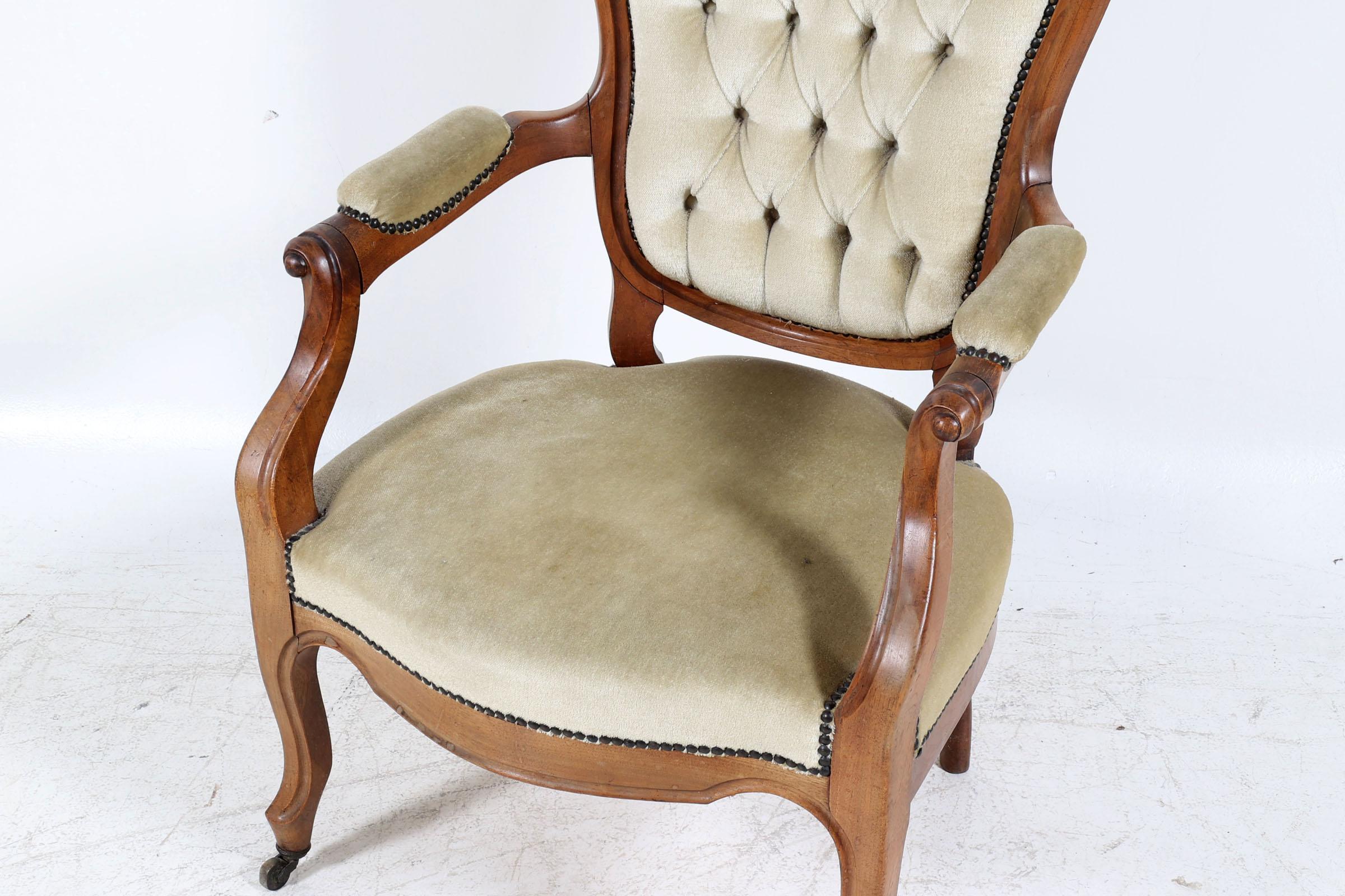 Antieke mahoniehouten armstoel met geel velours bekleed