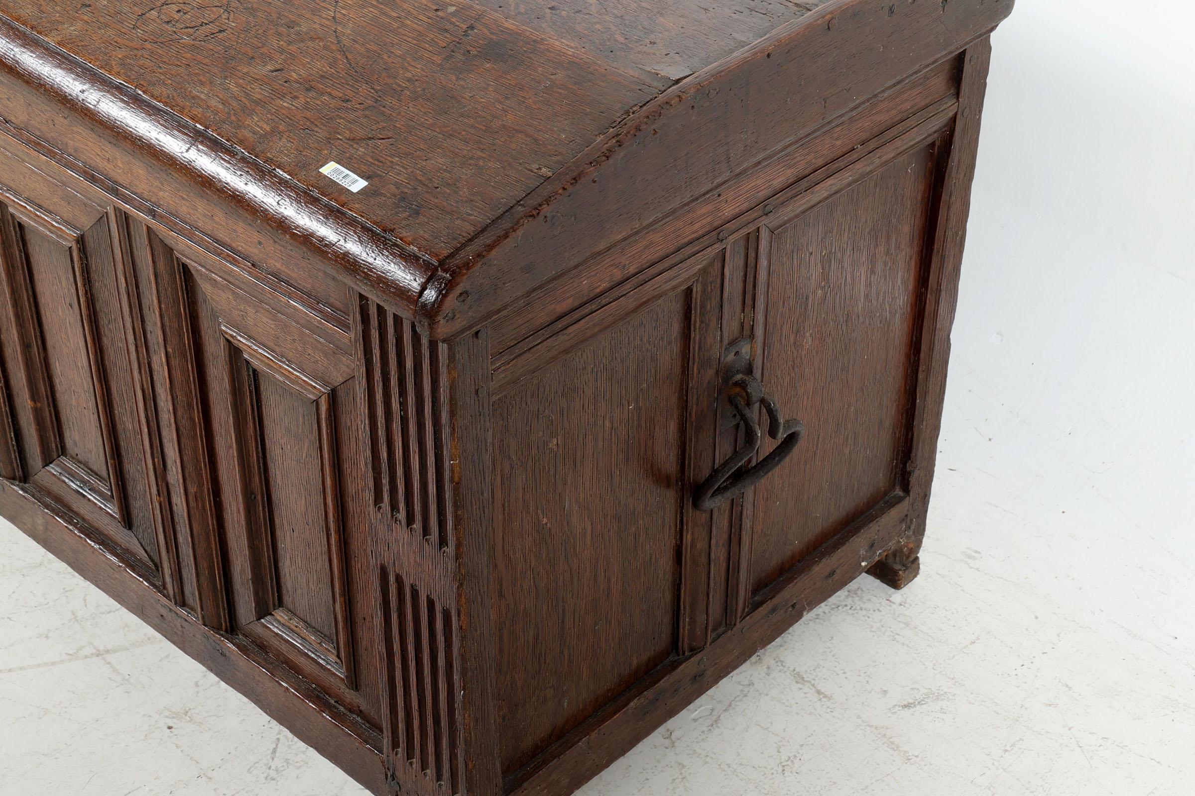 Antieke eikenhouten dekenkist, h.60 x b.? x d.54 cm.