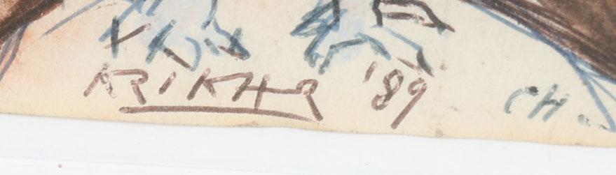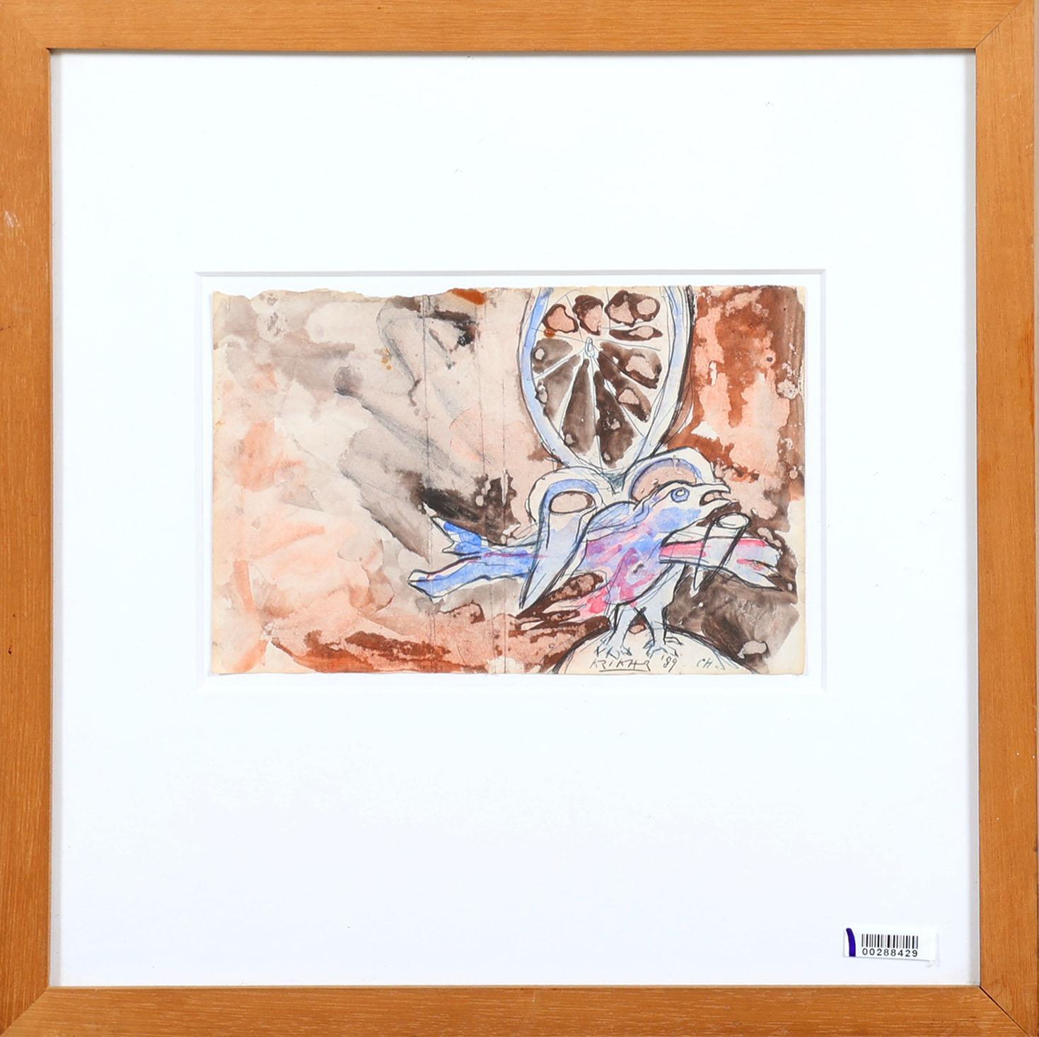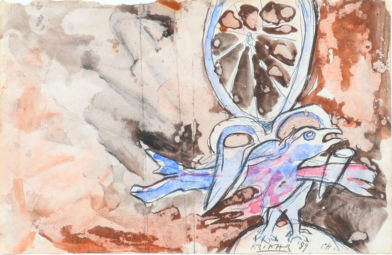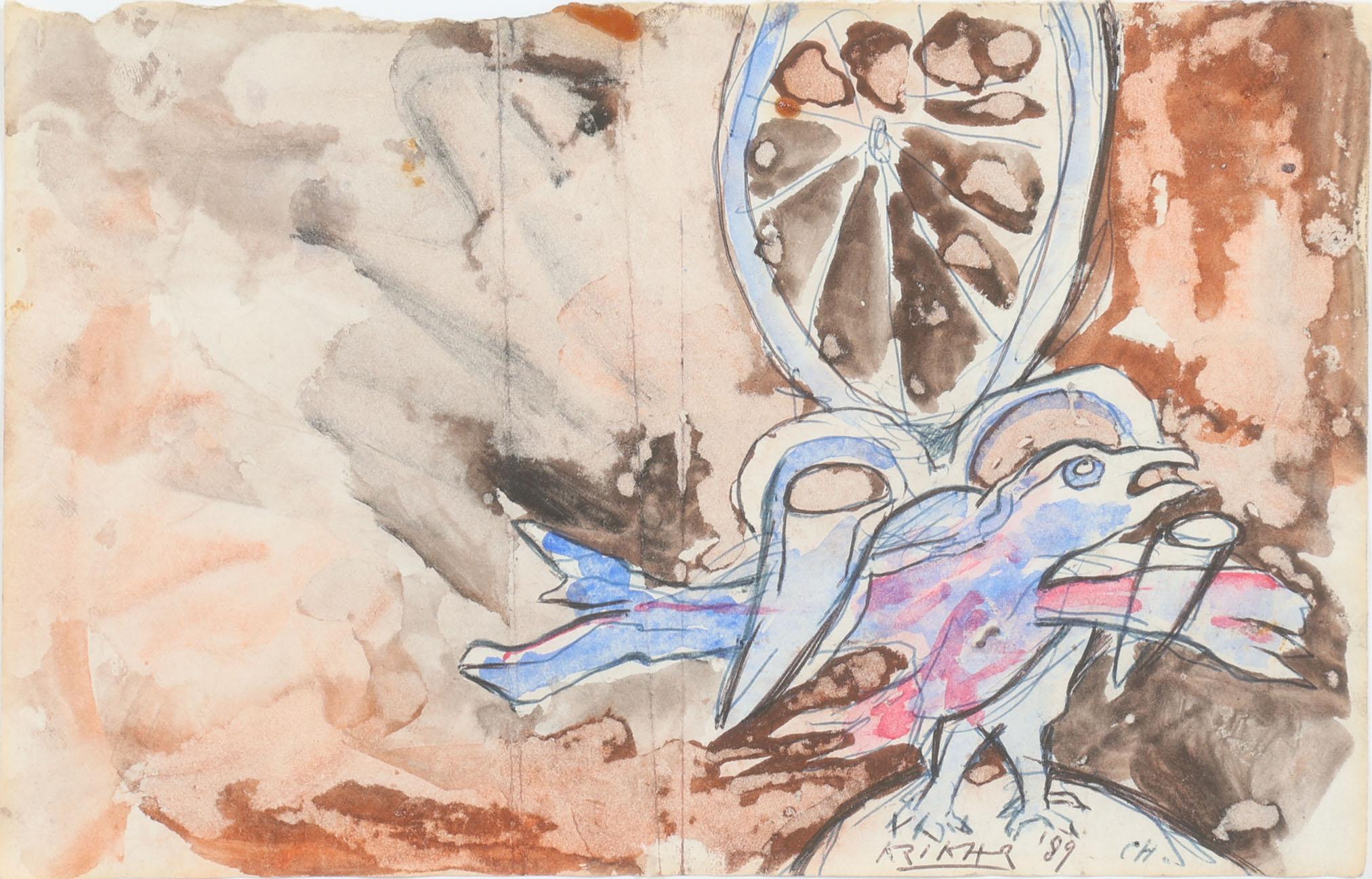 Herman Krikhaar (1930-2010), Vogel en fruit, gemengde techniek op papier, 14 x 21 cm.