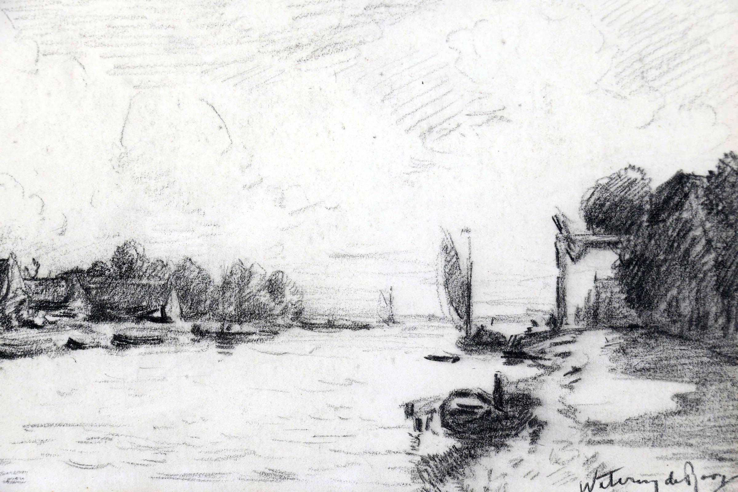 Johannes Embrosius van de Wetering de Rooij (1877-1972), Huisjes langs de waterkant, houtskooltekening, 16 x 23,5 cm.