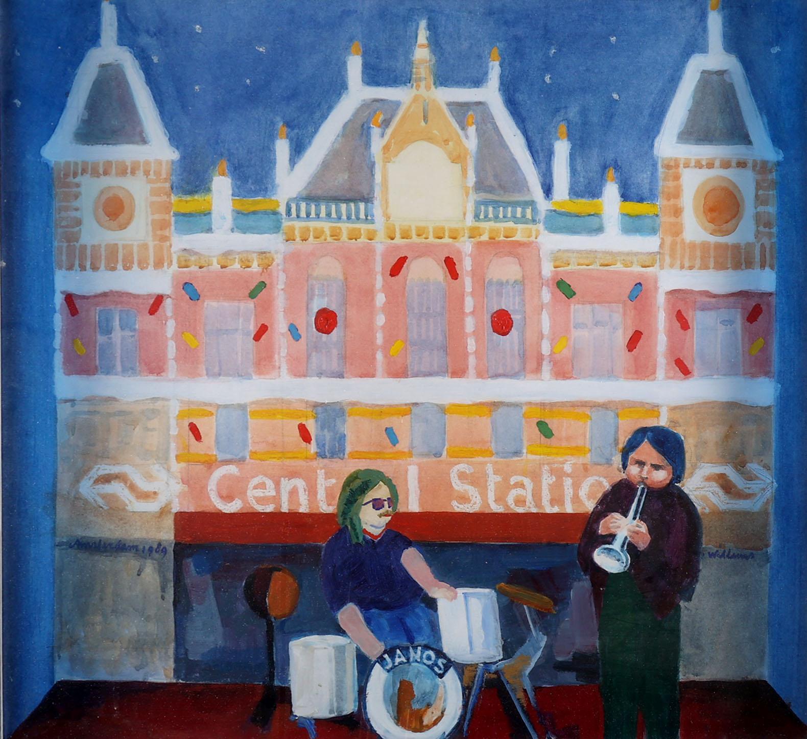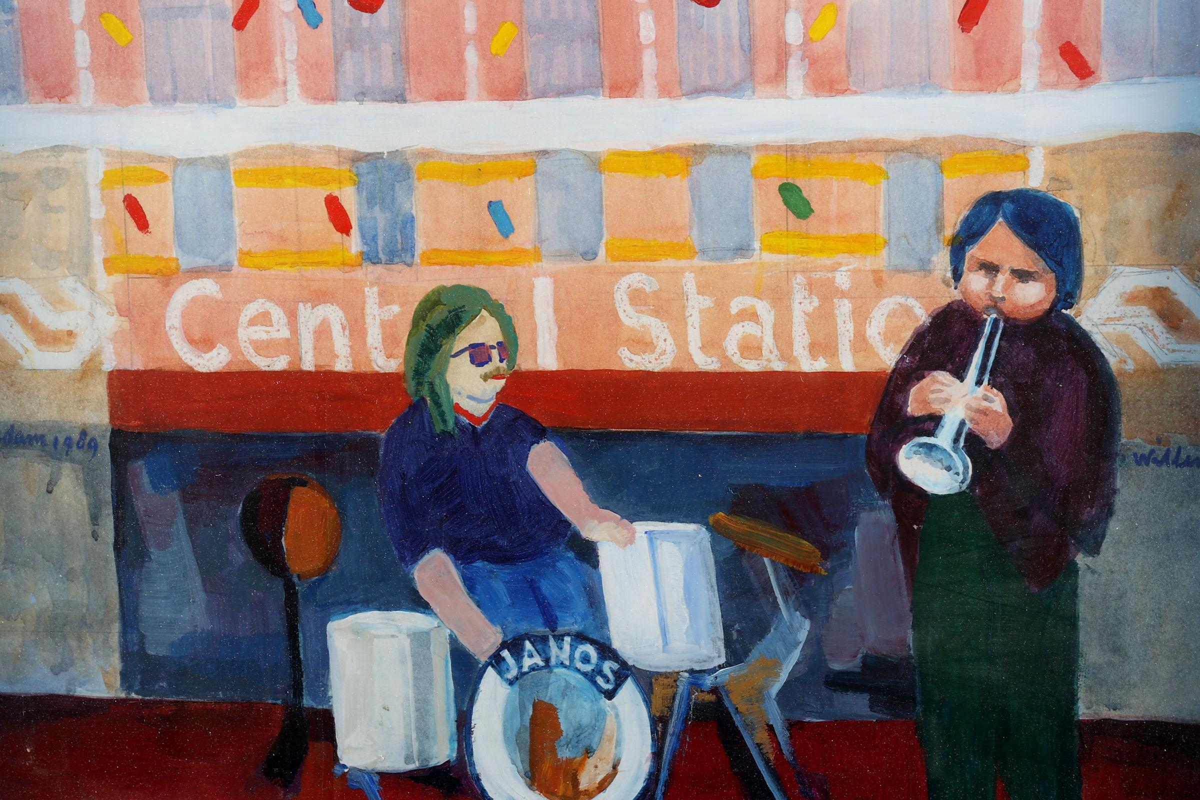 Joop Willems (1915-1989), Muzikanten op het Centraal Station, gouache op papier, gedateerd 1989, 64 x 68,5 cm.
