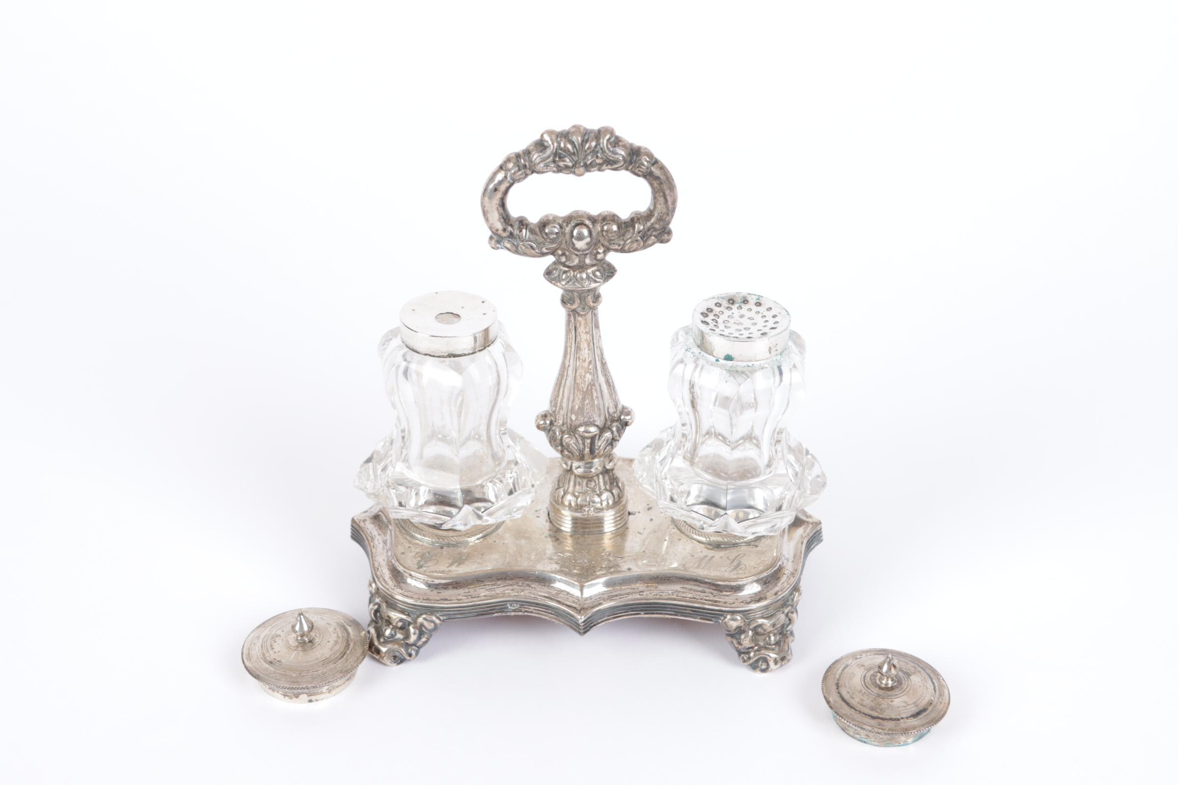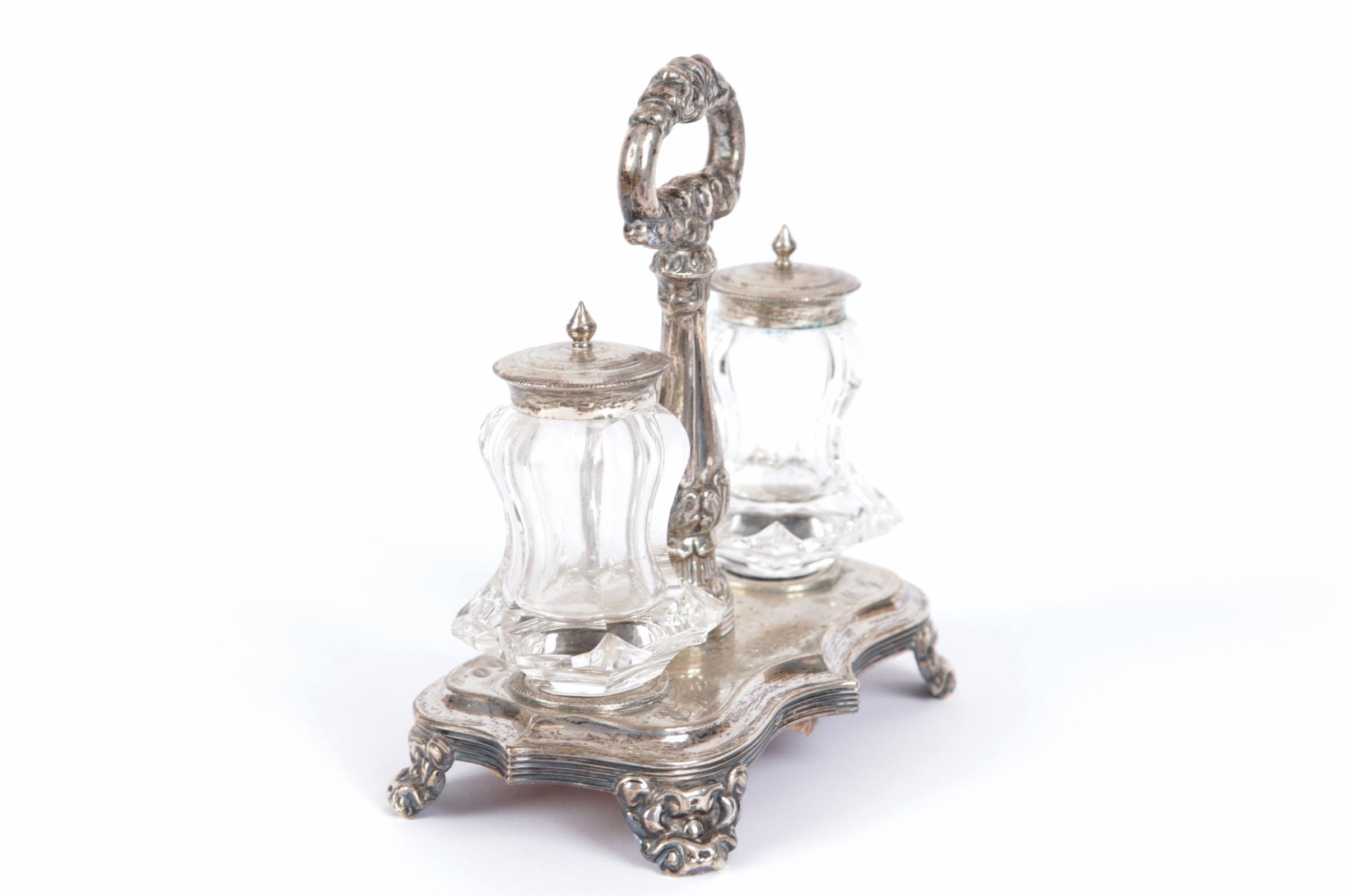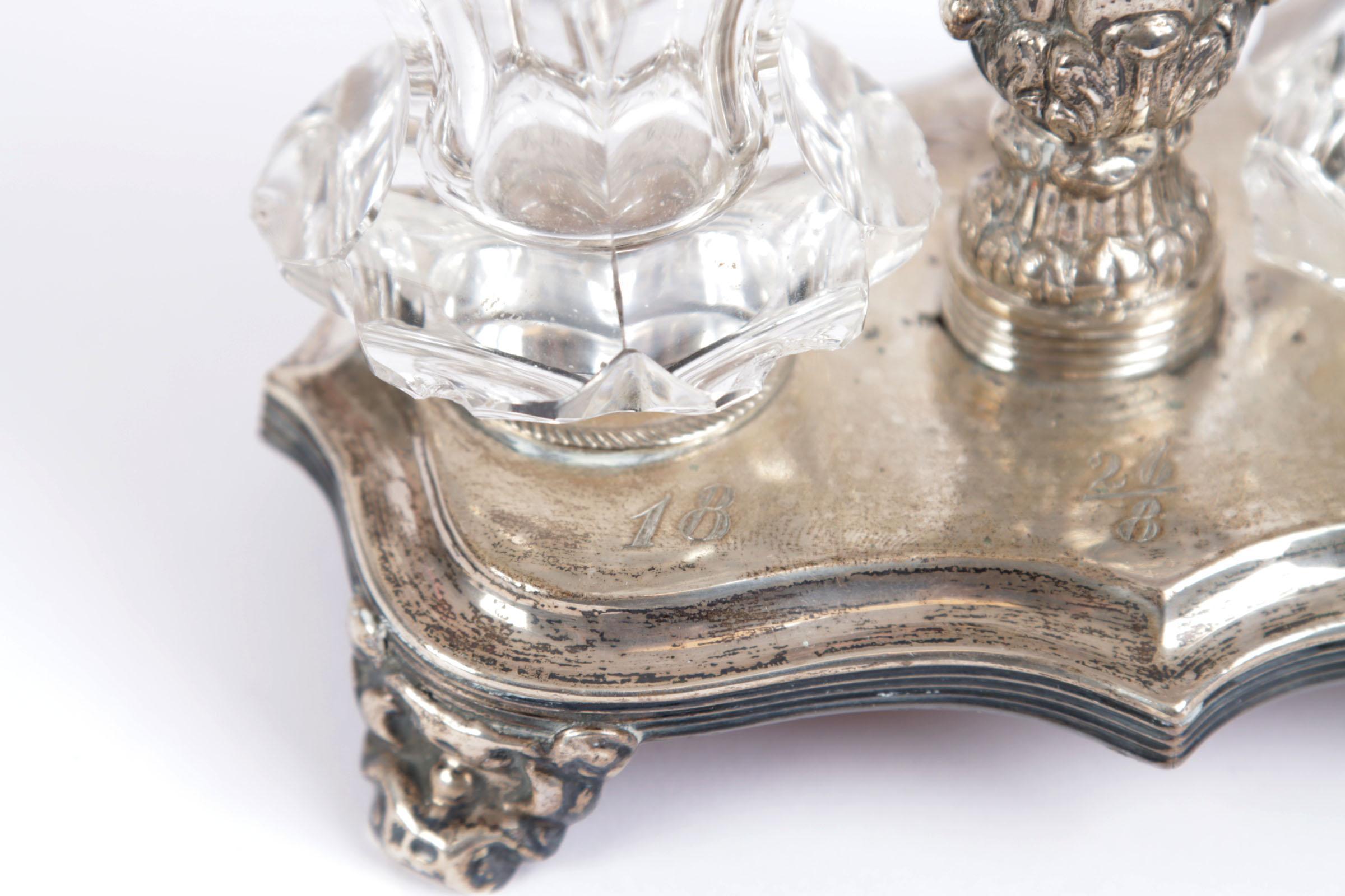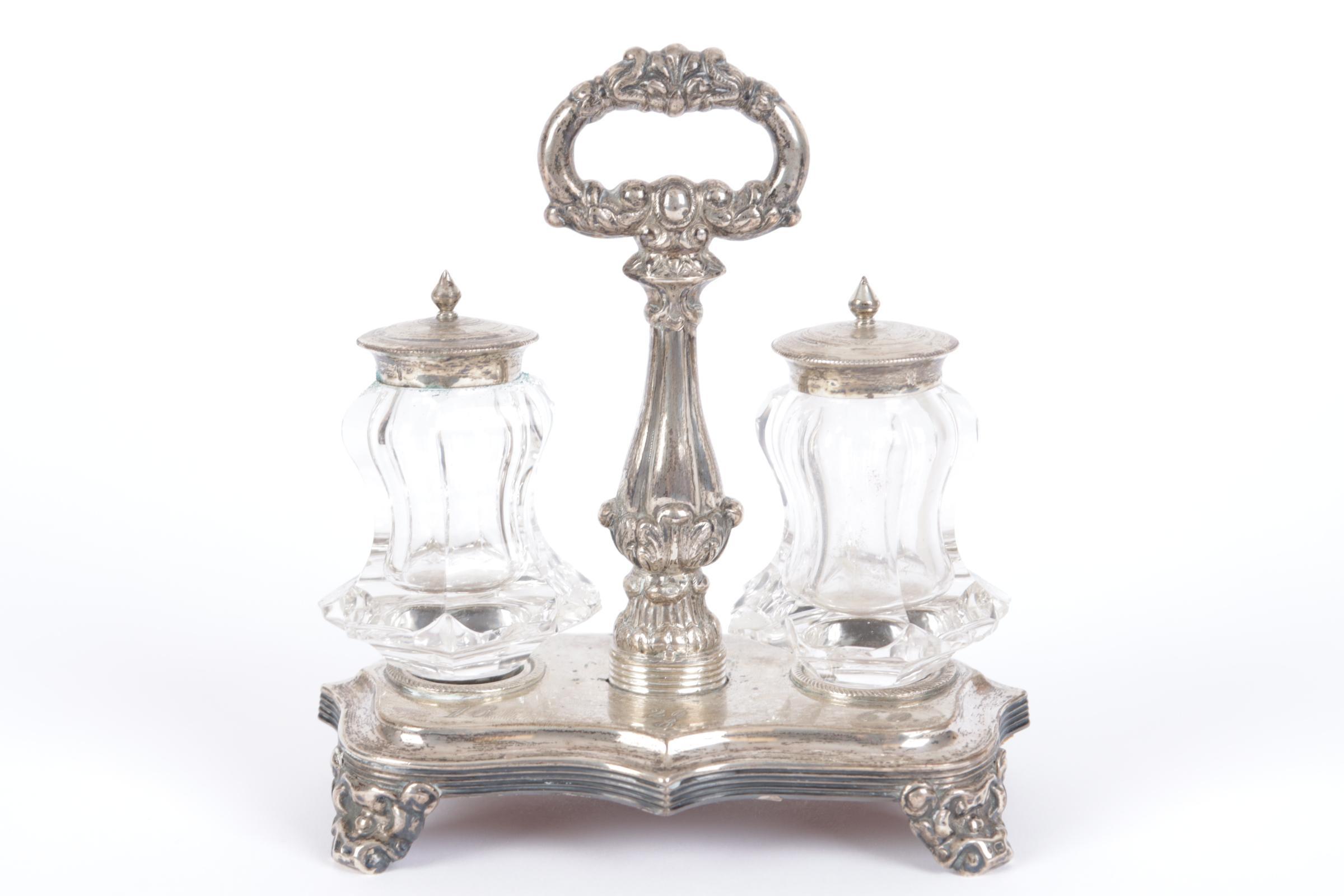 Zilveren inktstel met kristallen potjes, h.14 cm.