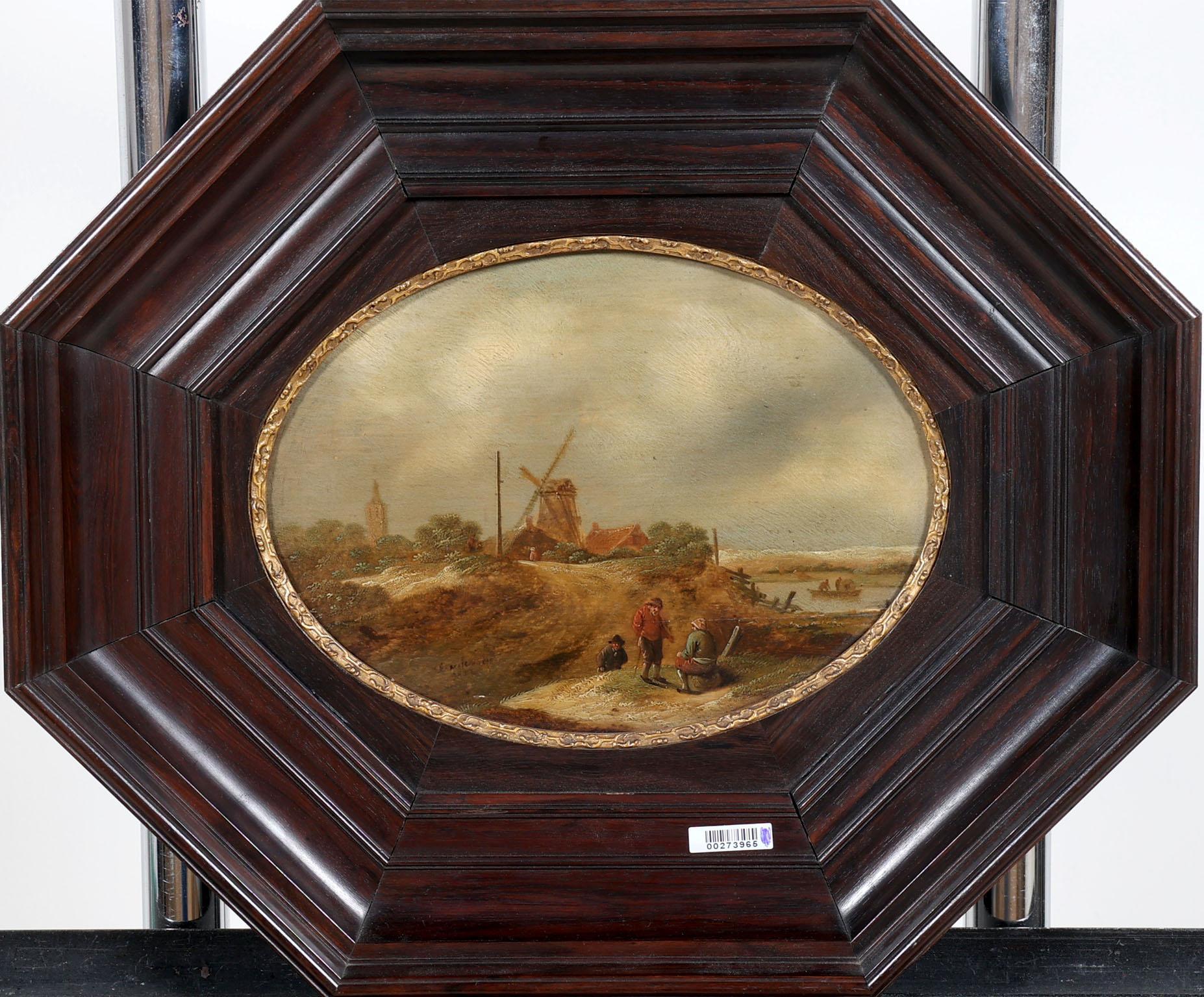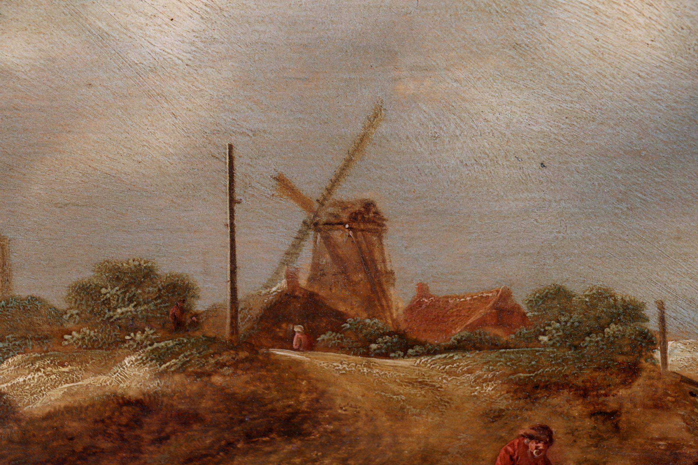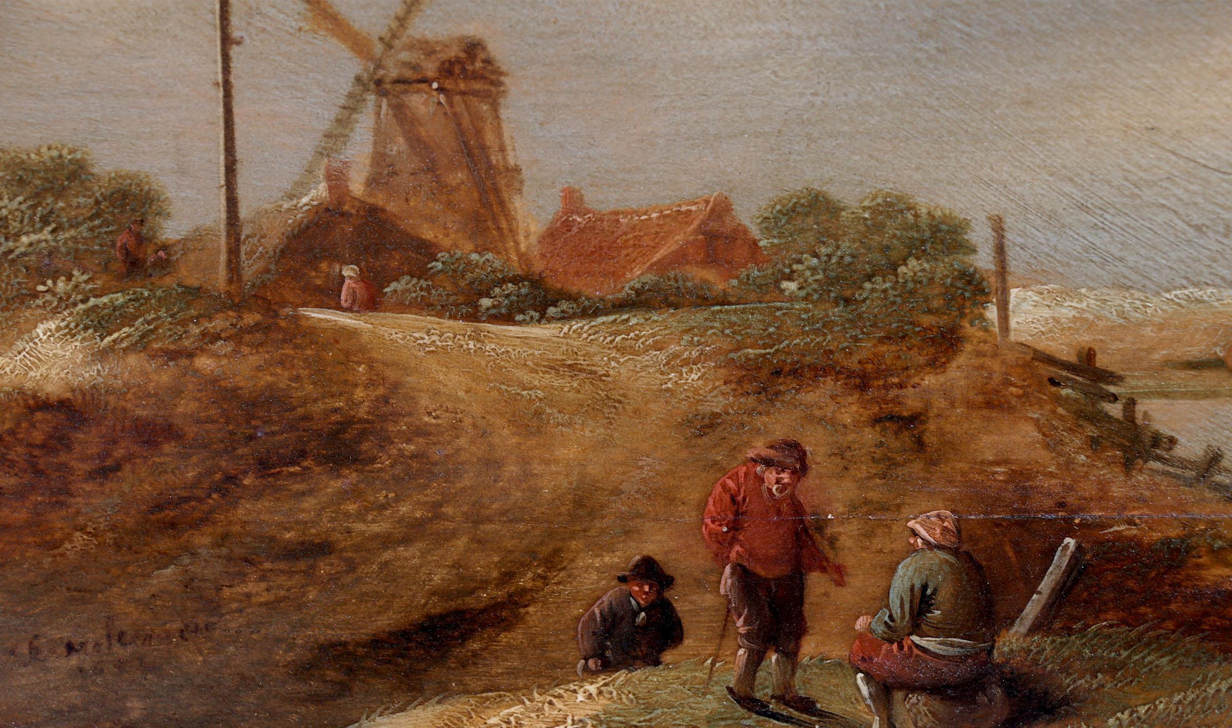 Nicolaes Molenaer (1630-1676), Personen in landschap met op de achtergrond een molen, olieverf op paneel, 19,5 x 26,5 cm.
