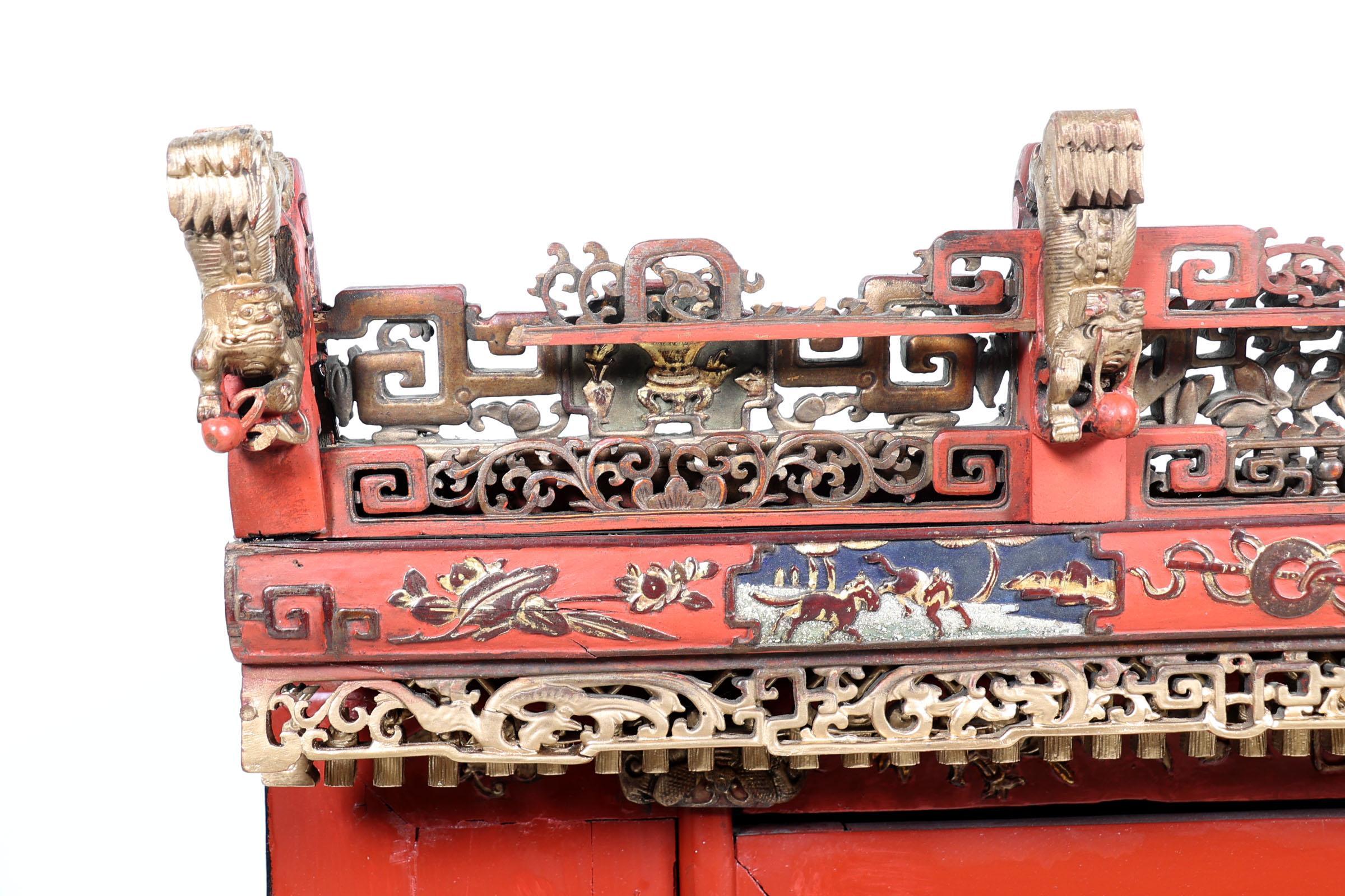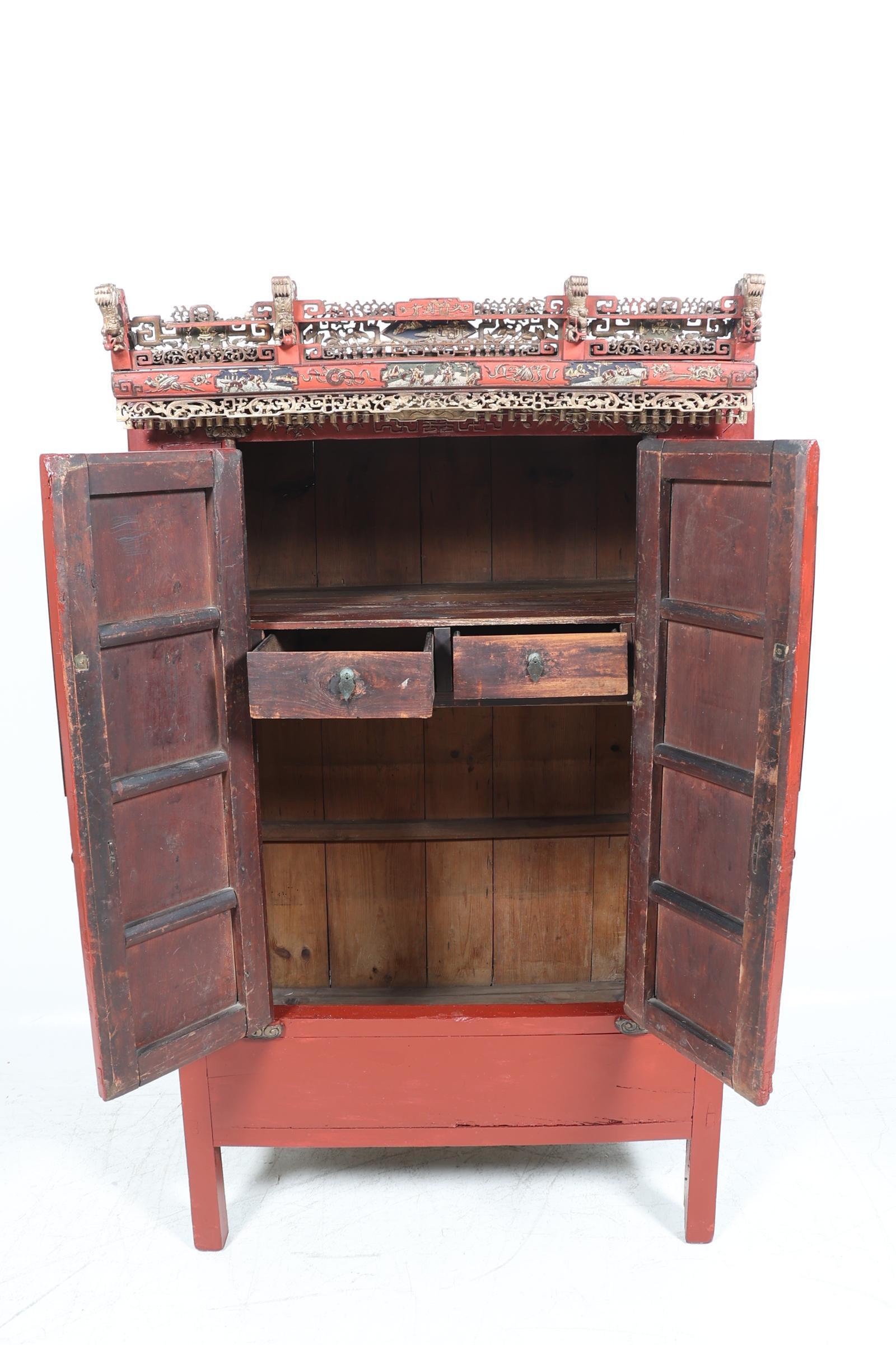 Rood gelakte Chinese houten bruidskast met rijkbewerkte bovenzijde en koperen beslag, h.180 x b.103 x d.75 cm.