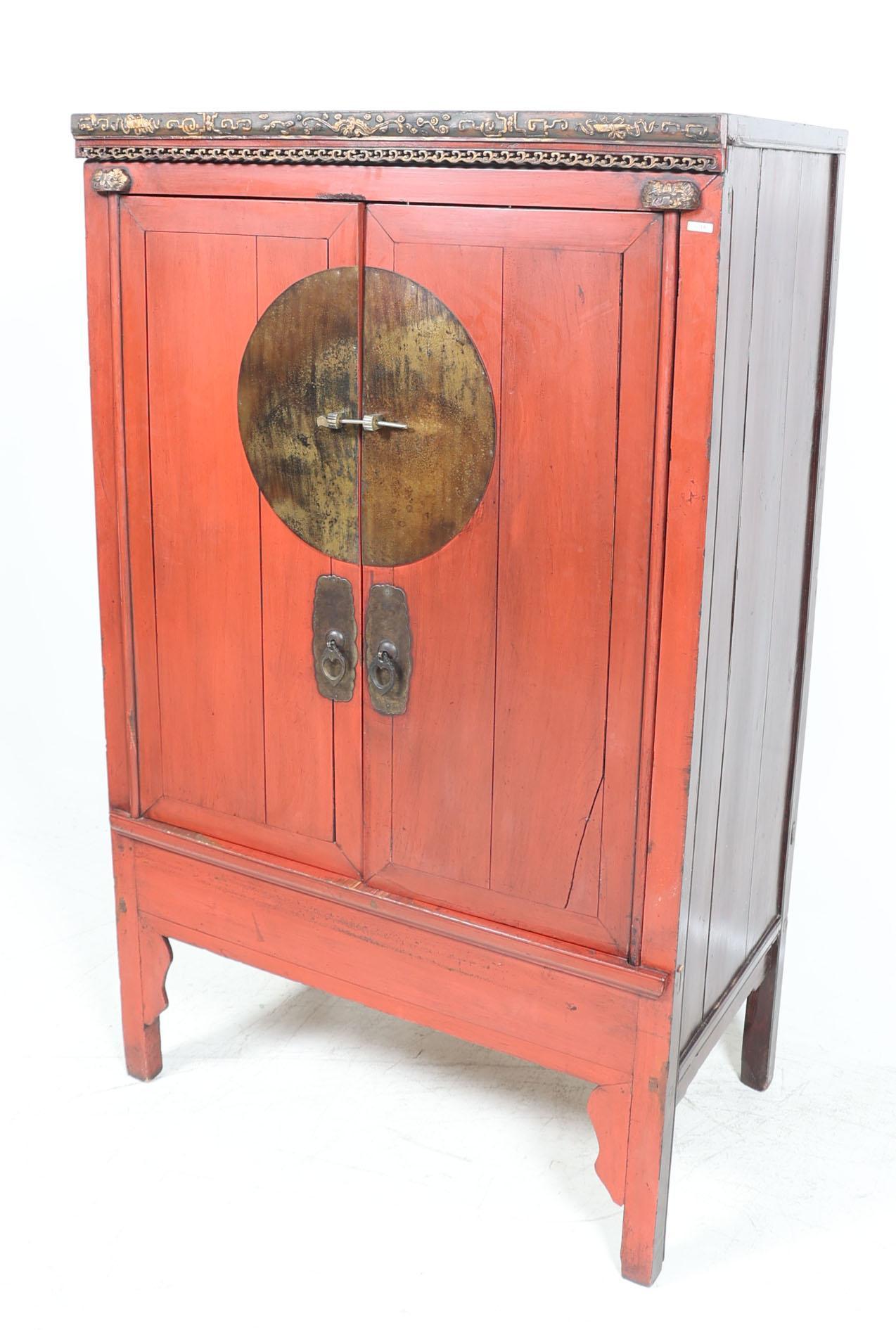 Rood gelakte Chinese houten bruidskast met bewerkte bovenzijde en koperen beslag, h.174 x b.106 x d.64 cm.