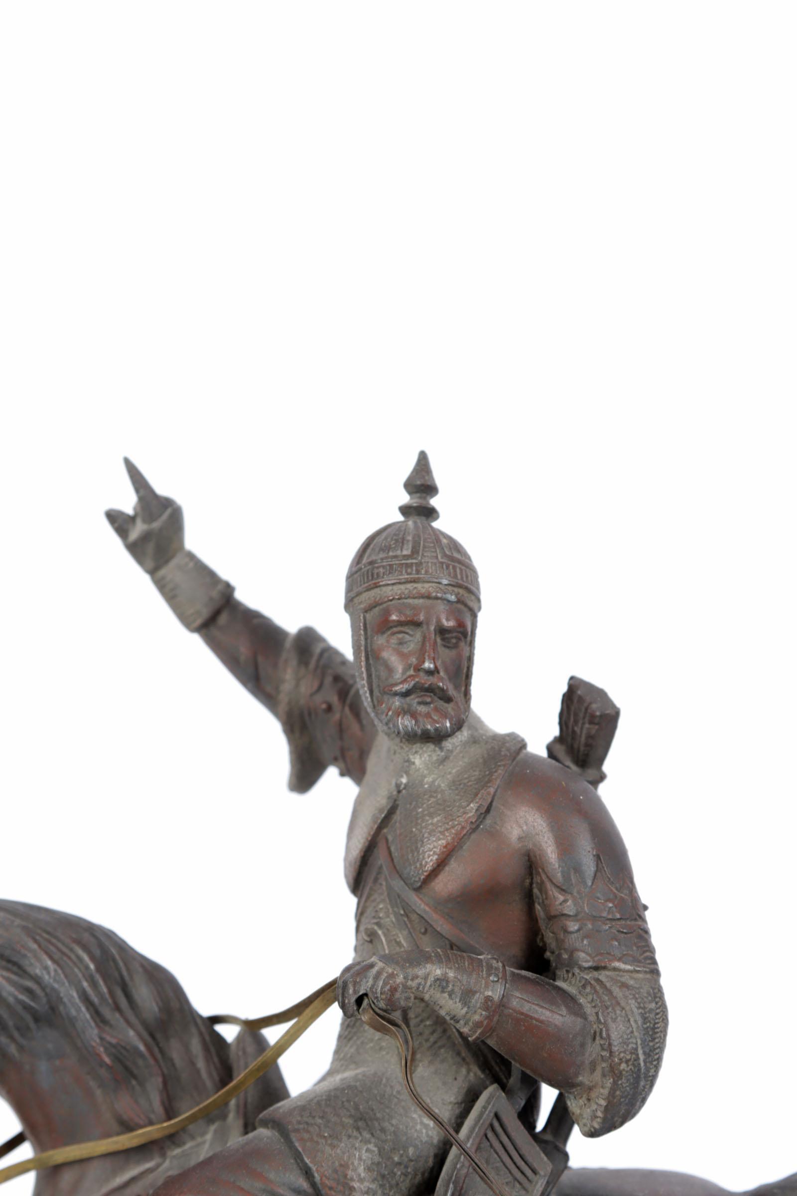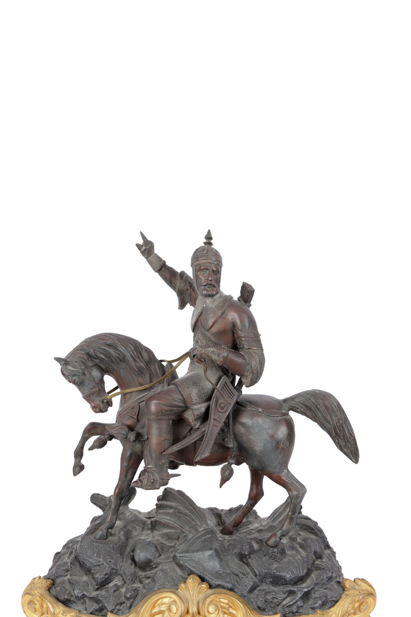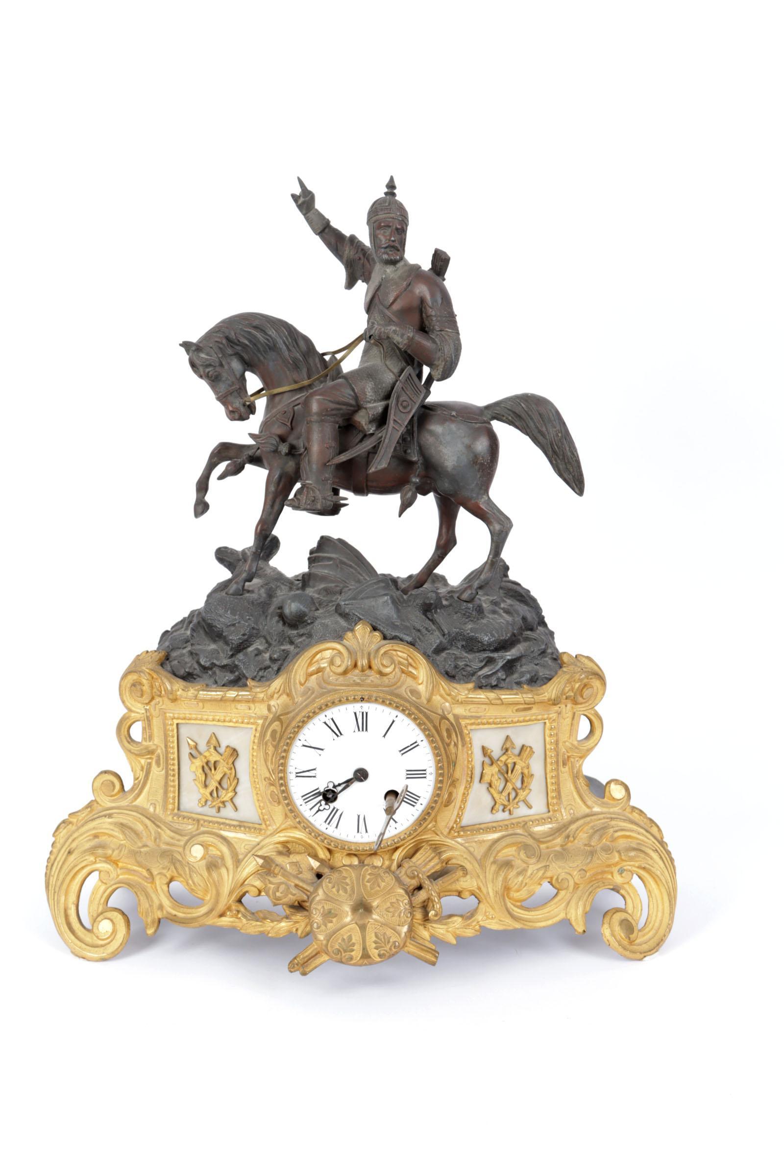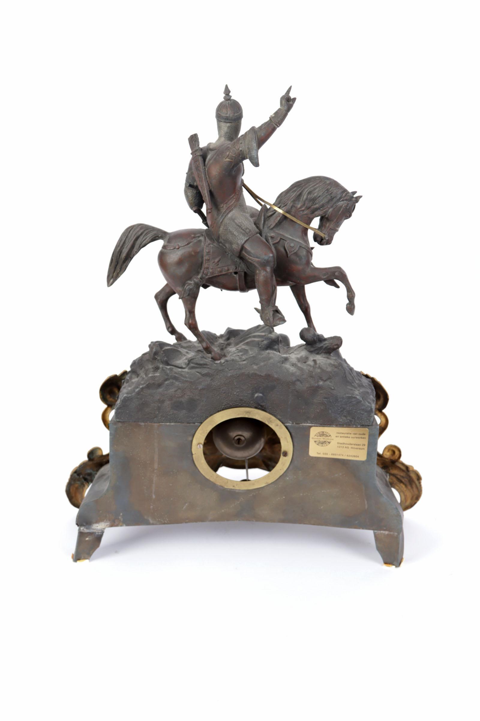 Antieke legering pendule met voorstelling van een soldaat te paard, h.48 cm.