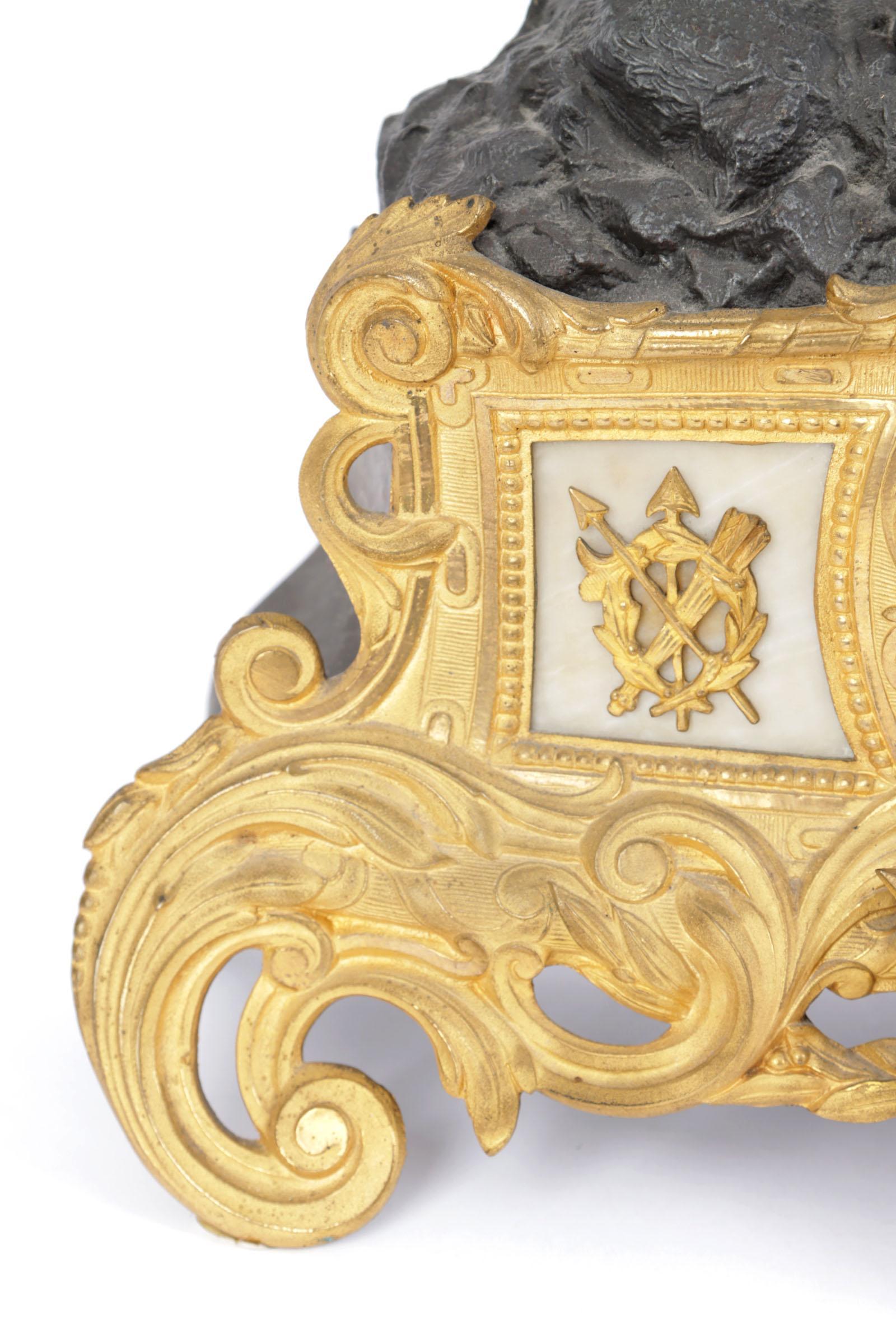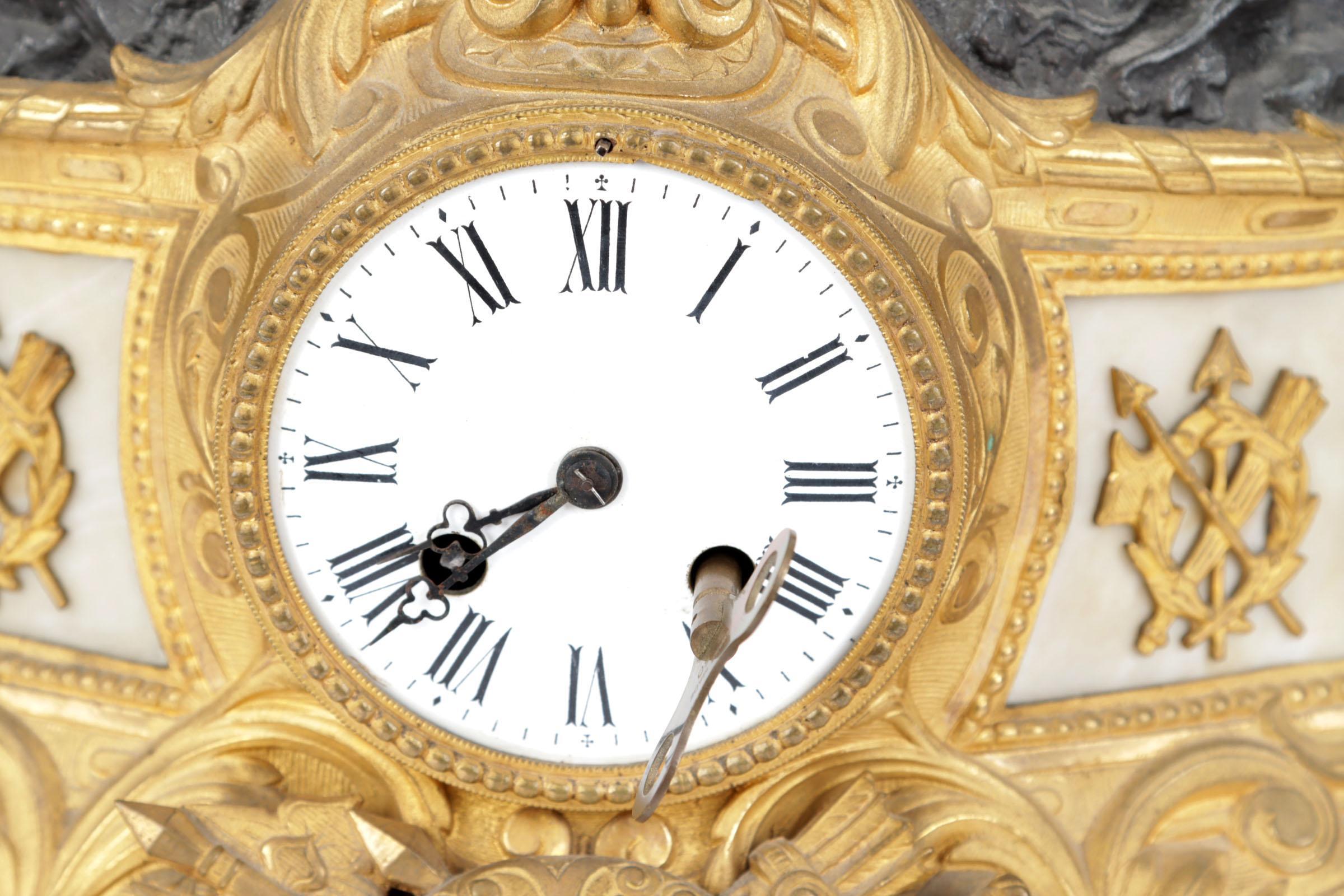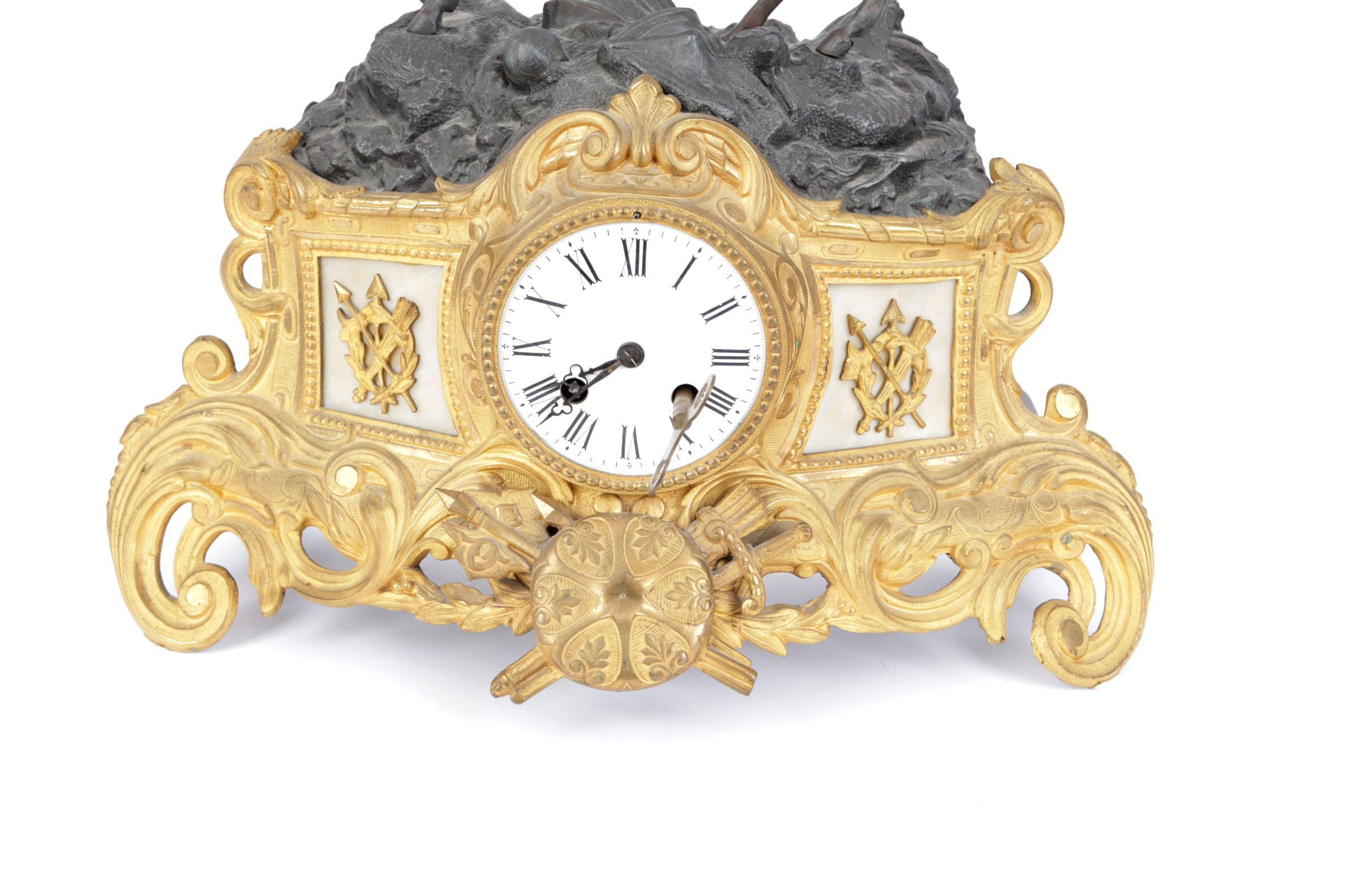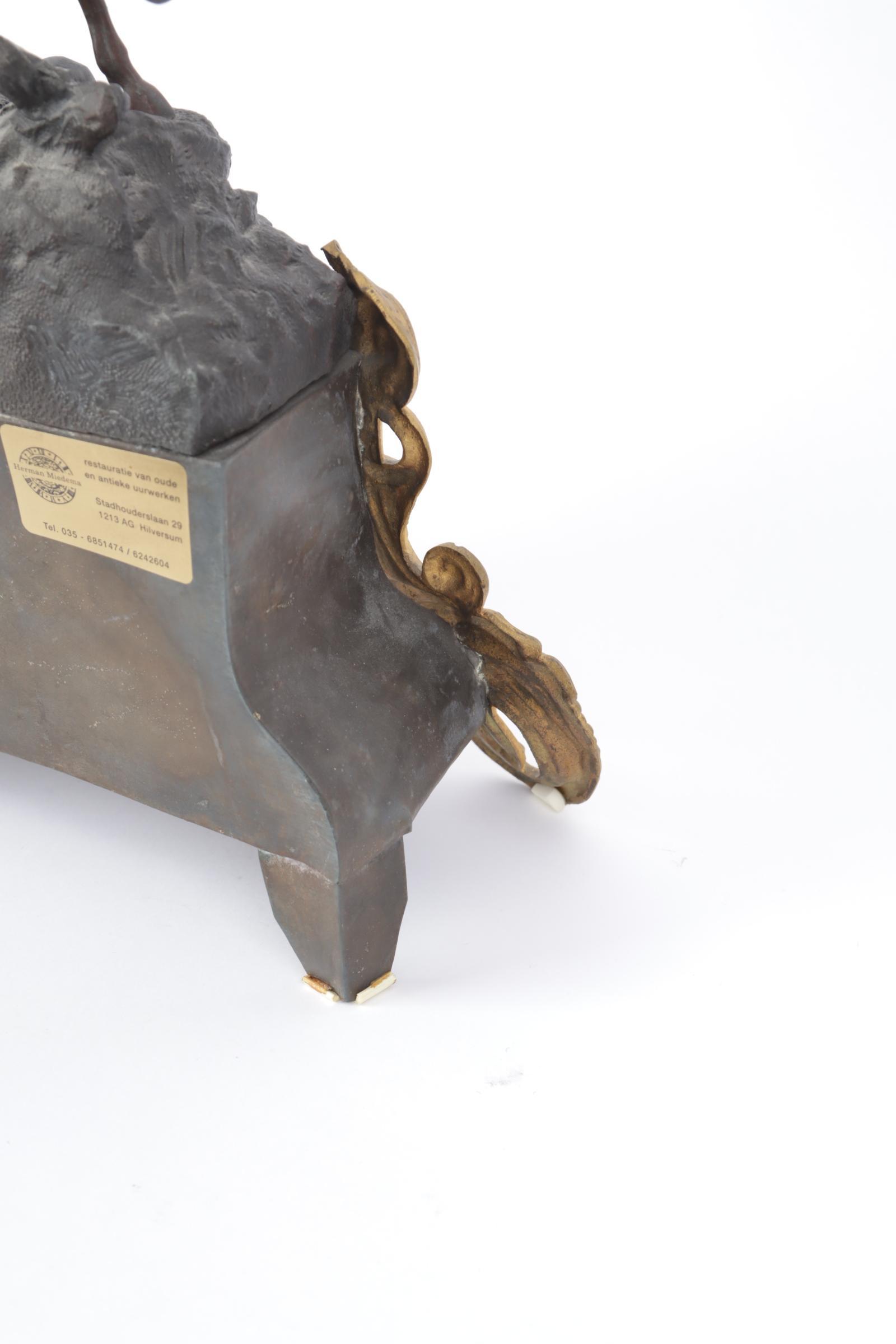 Antieke legering pendule met voorstelling van een soldaat te paard, h.48 cm.