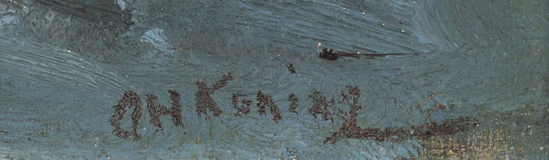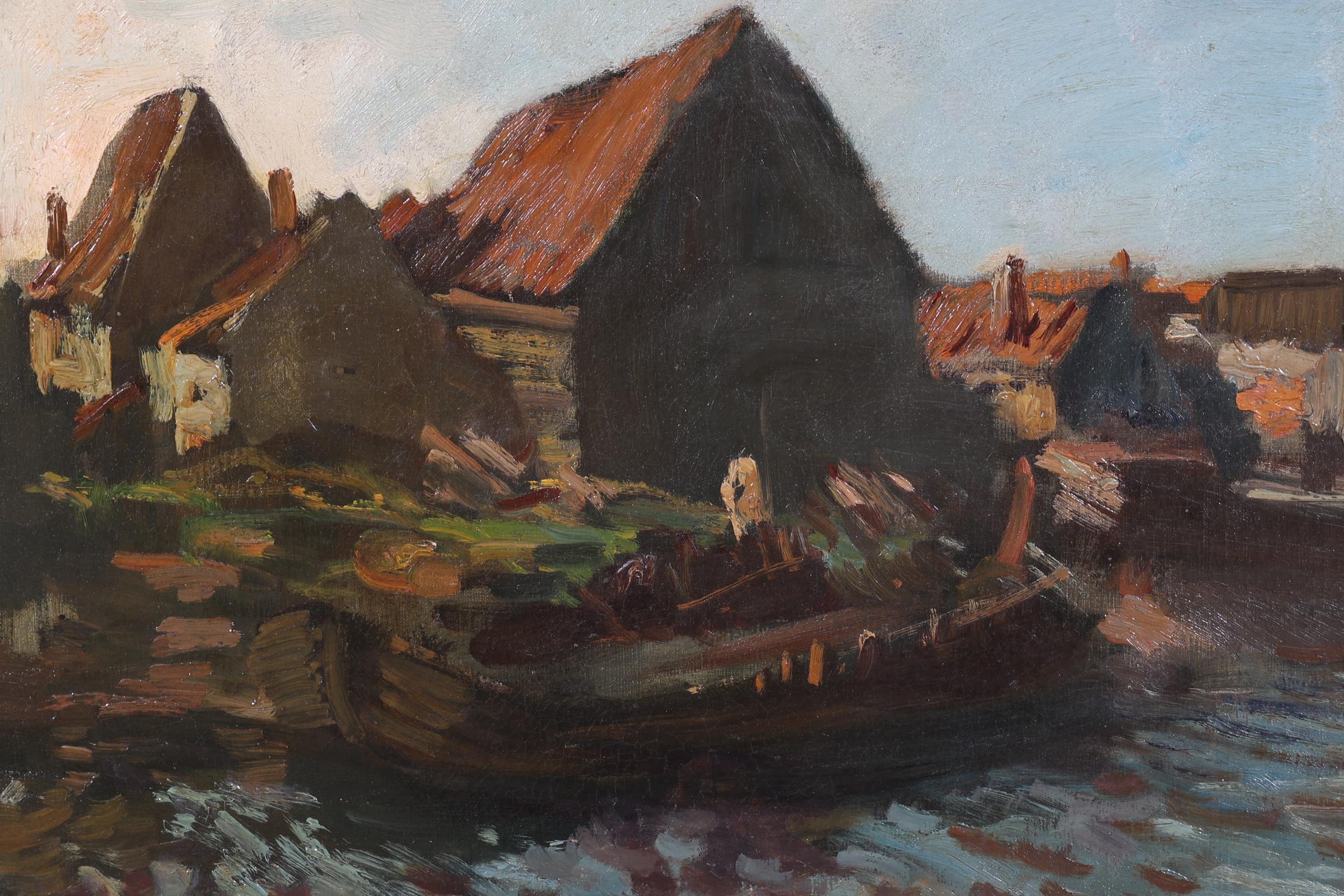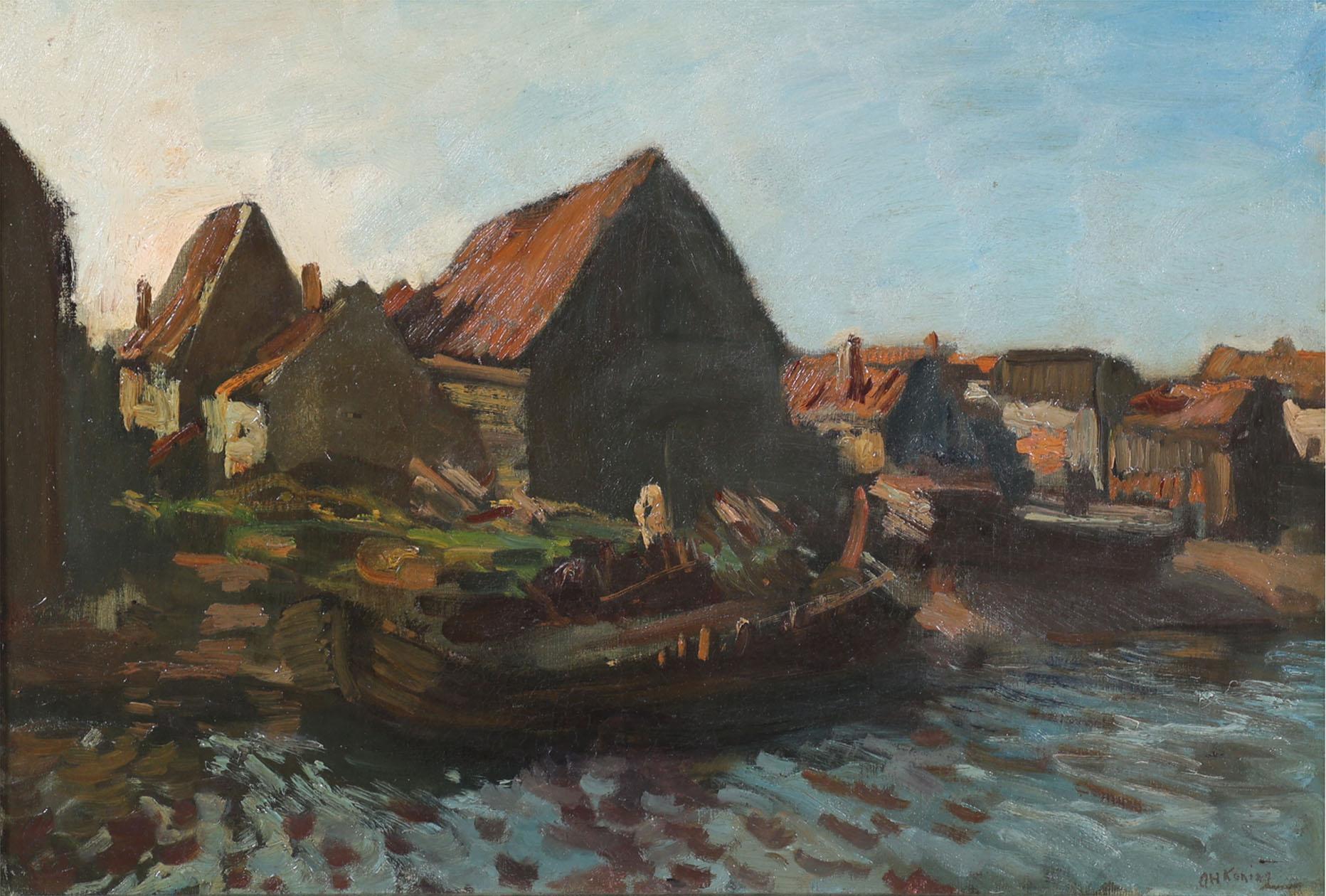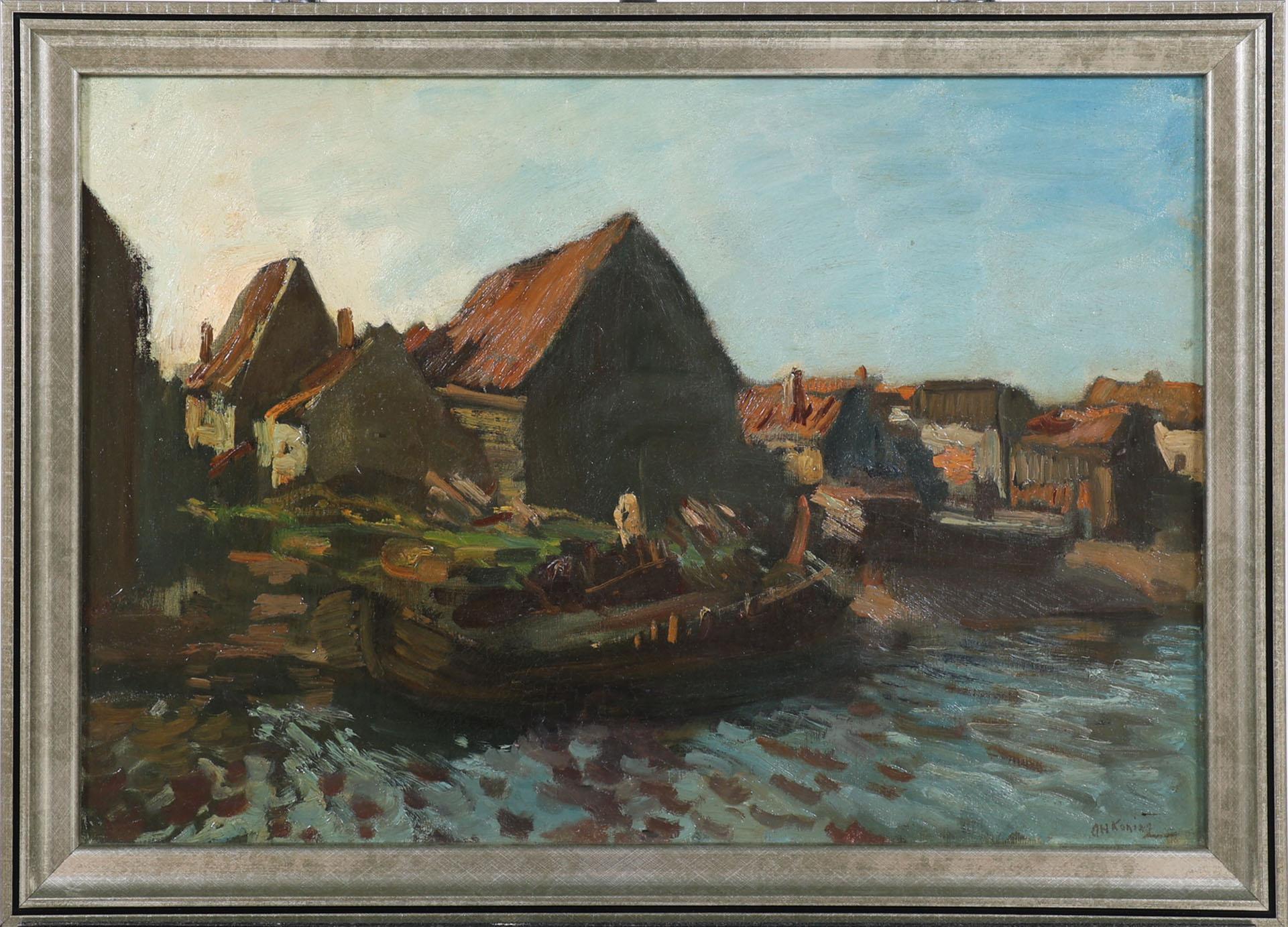 'Arnold' Hendrik Koning (1860-1945), Huisjes aan het water, olieverf op doek, 36,5 x 53 cm.