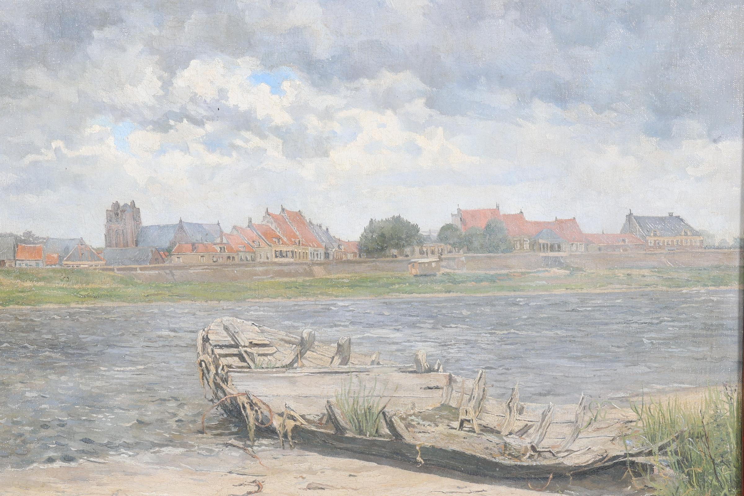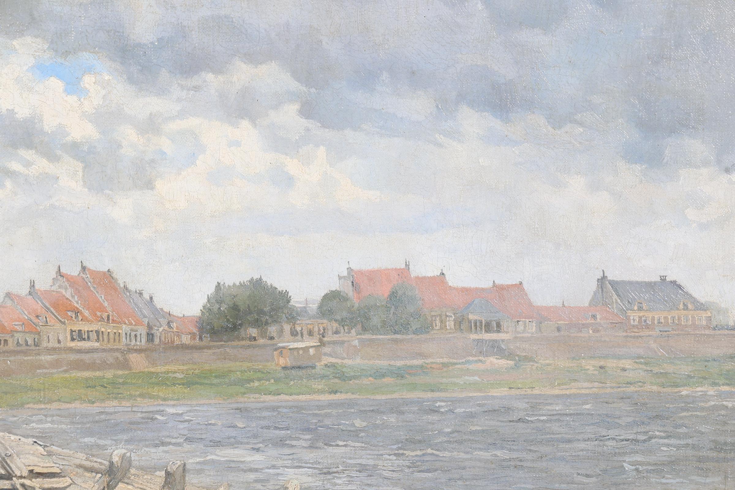 Jaap van Nijendaal (1916-1990), Stadsgezicht aan het water met scheepswrak, olieverf op doek, gedateerd 1945, 49 x 58 cm.
