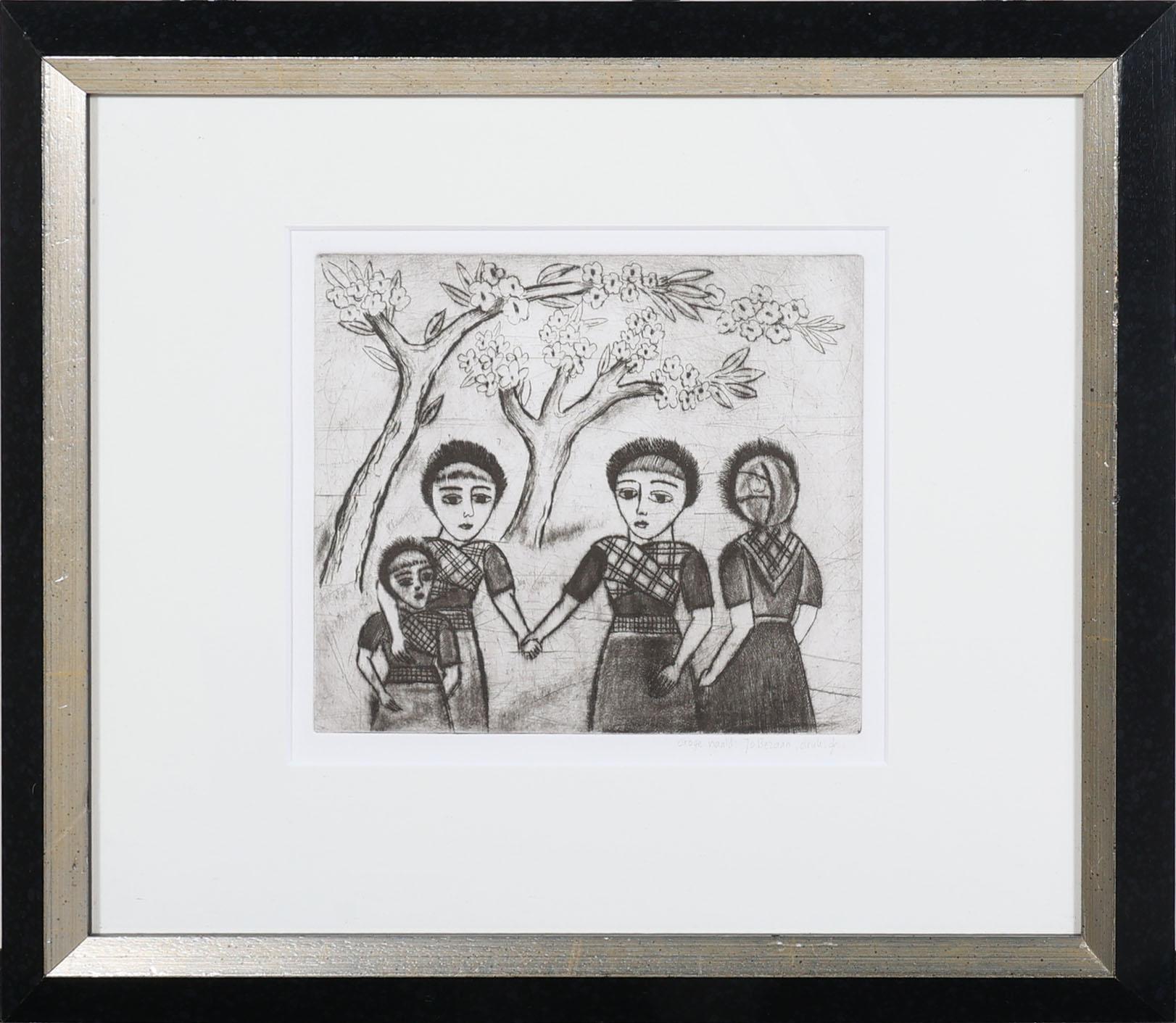 Johan 'Jo' Bezaan (1894-1952), Bloesembomen met personen, handgesigneerde ets, 19 x 21,5 cm.