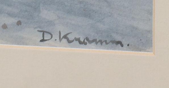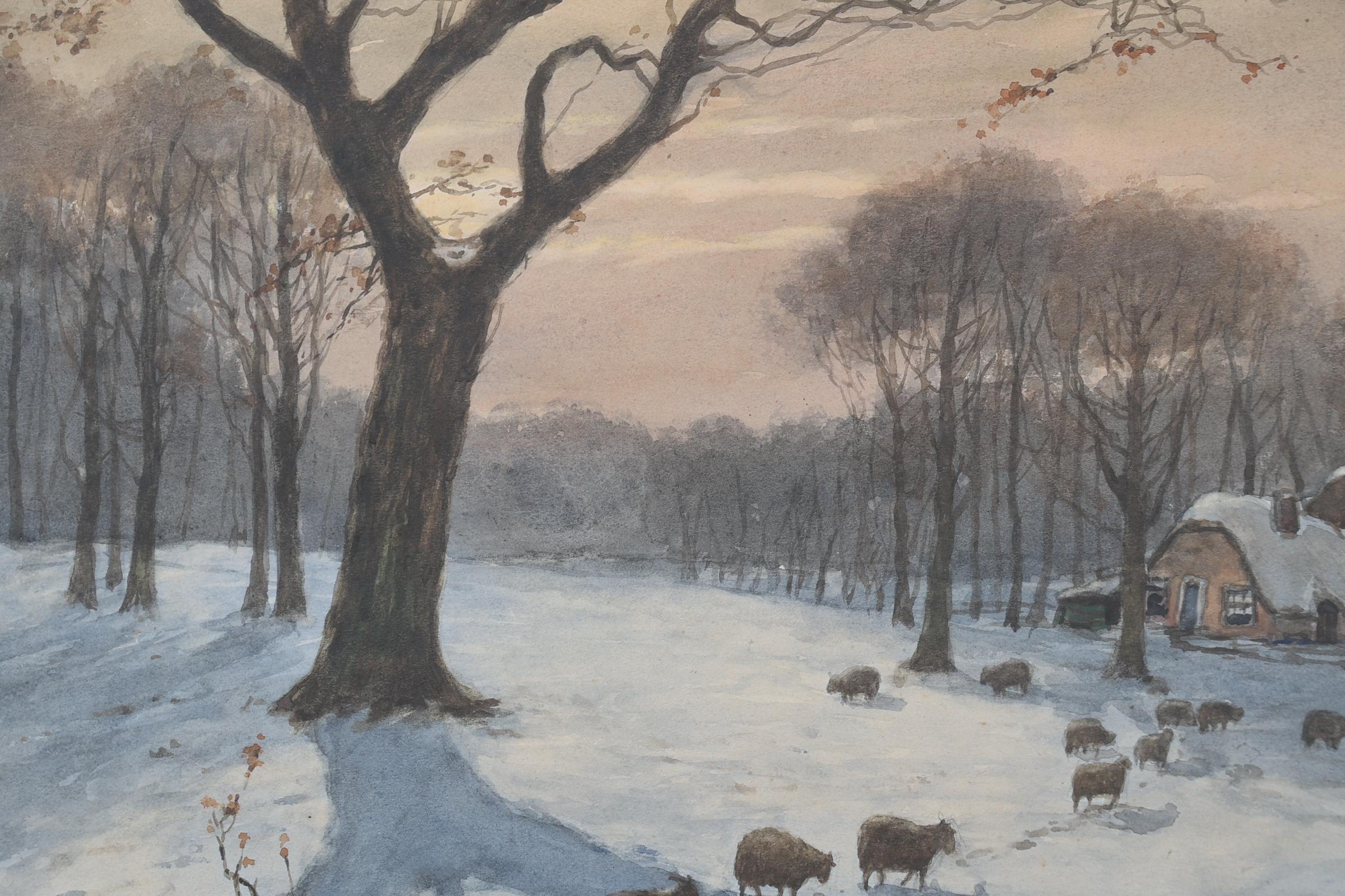 D. Kromm, Schaapskudde voor boerderij in de winter, aquarel op papier, 34 x 50 cm.
