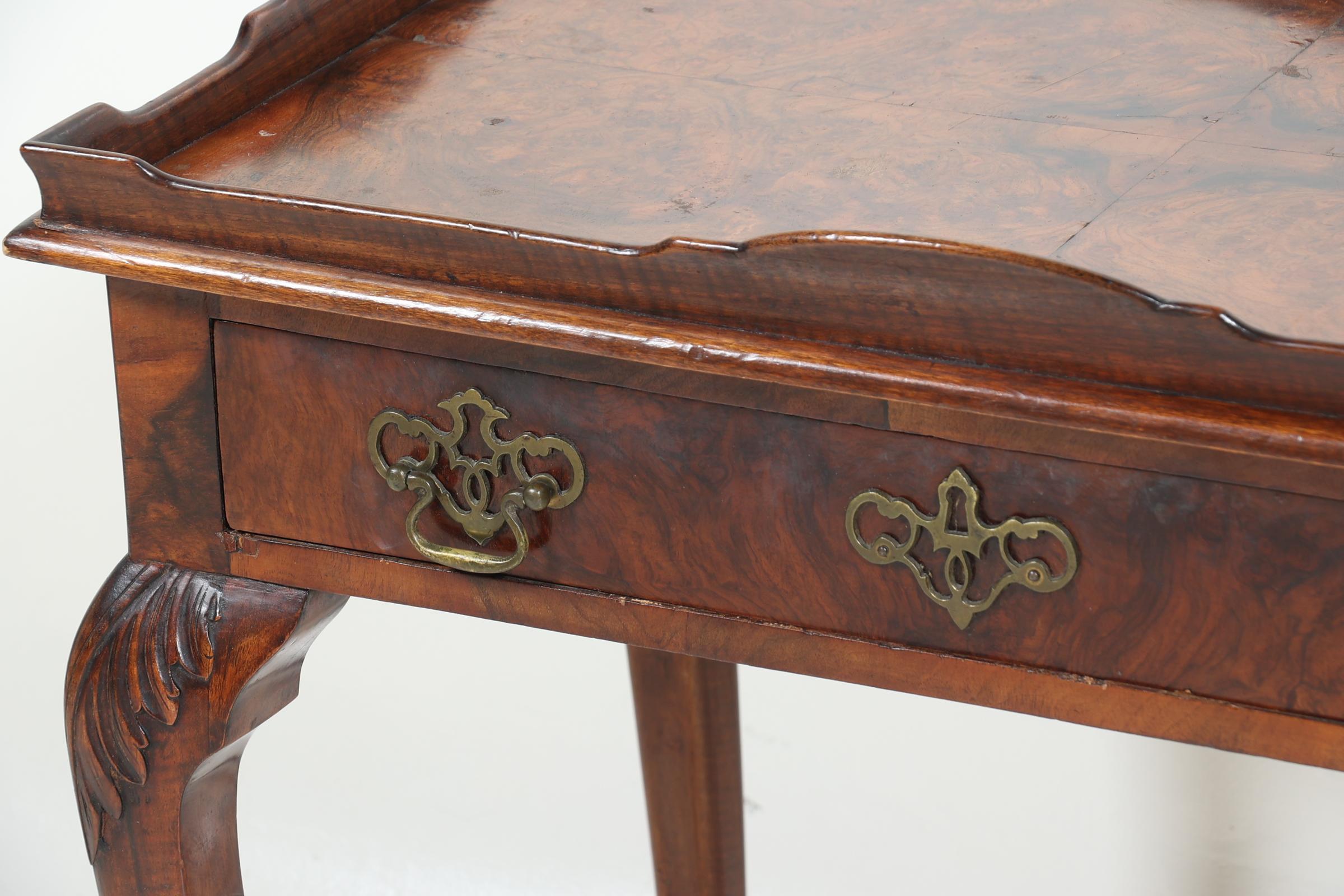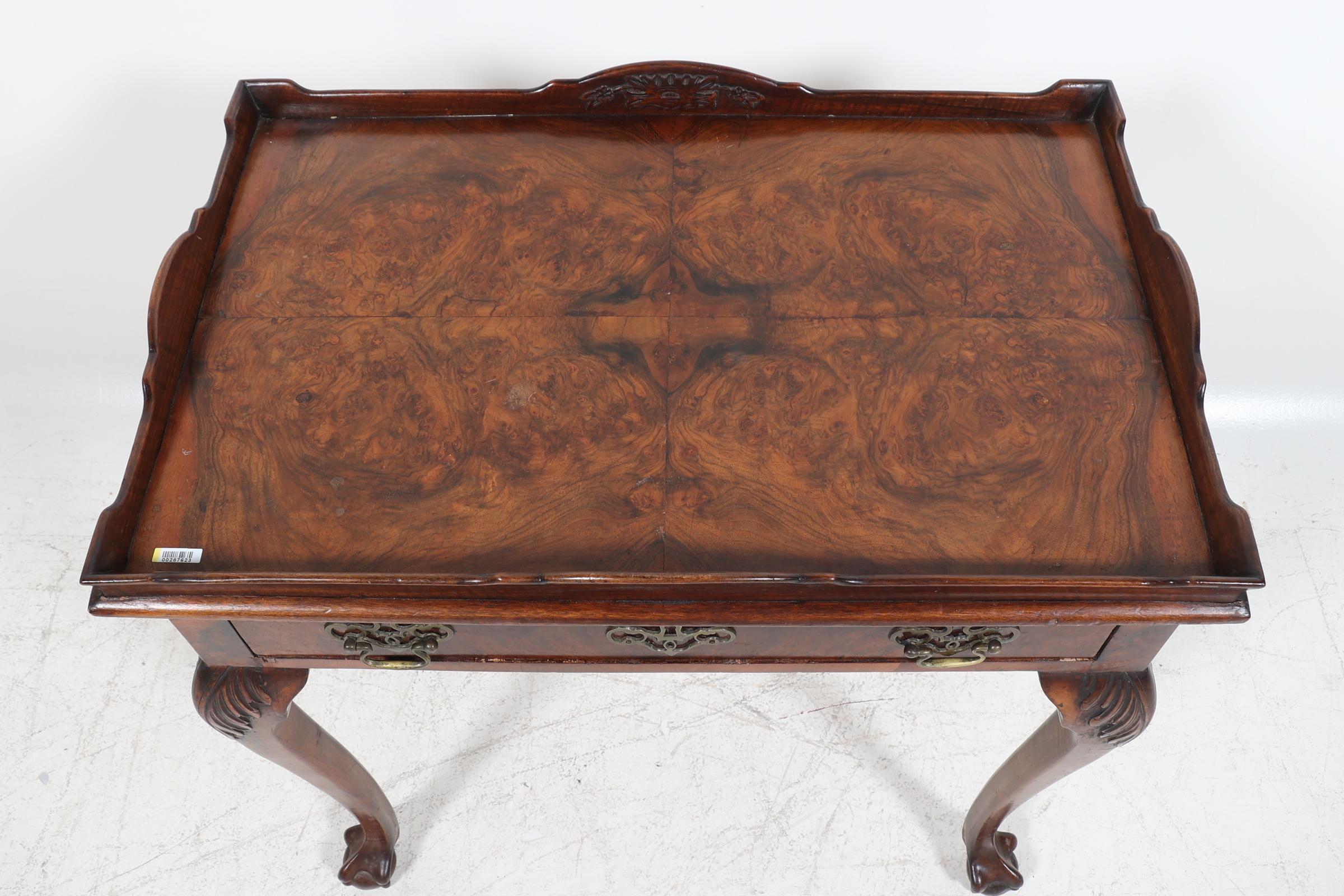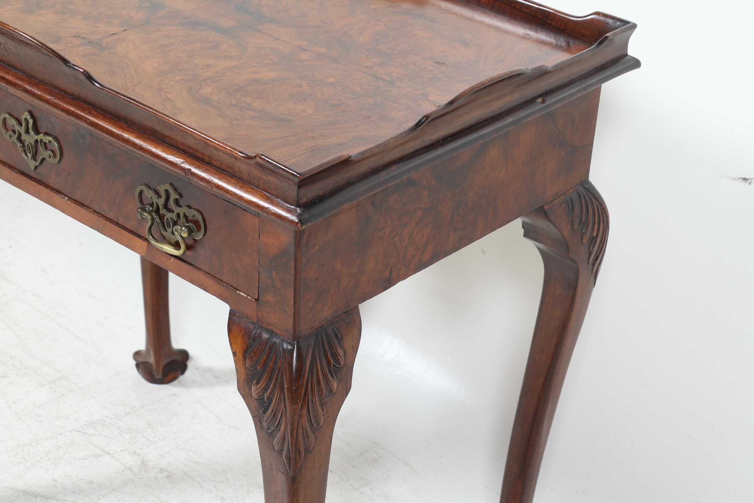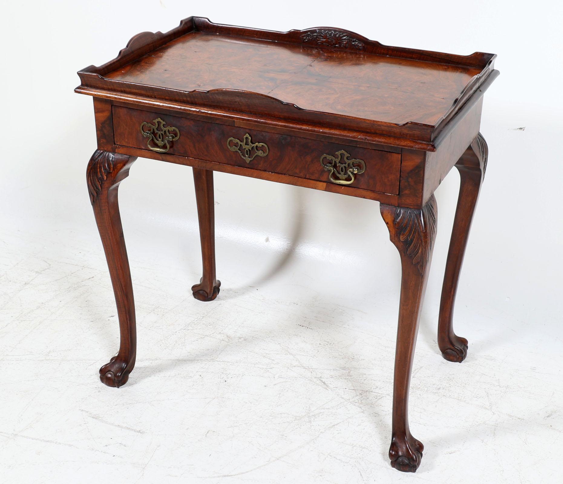 Oude wortelnotenhouten theetafel met lade, rustend op klauwpoten, h.75 x b.75 x d.48 cm.