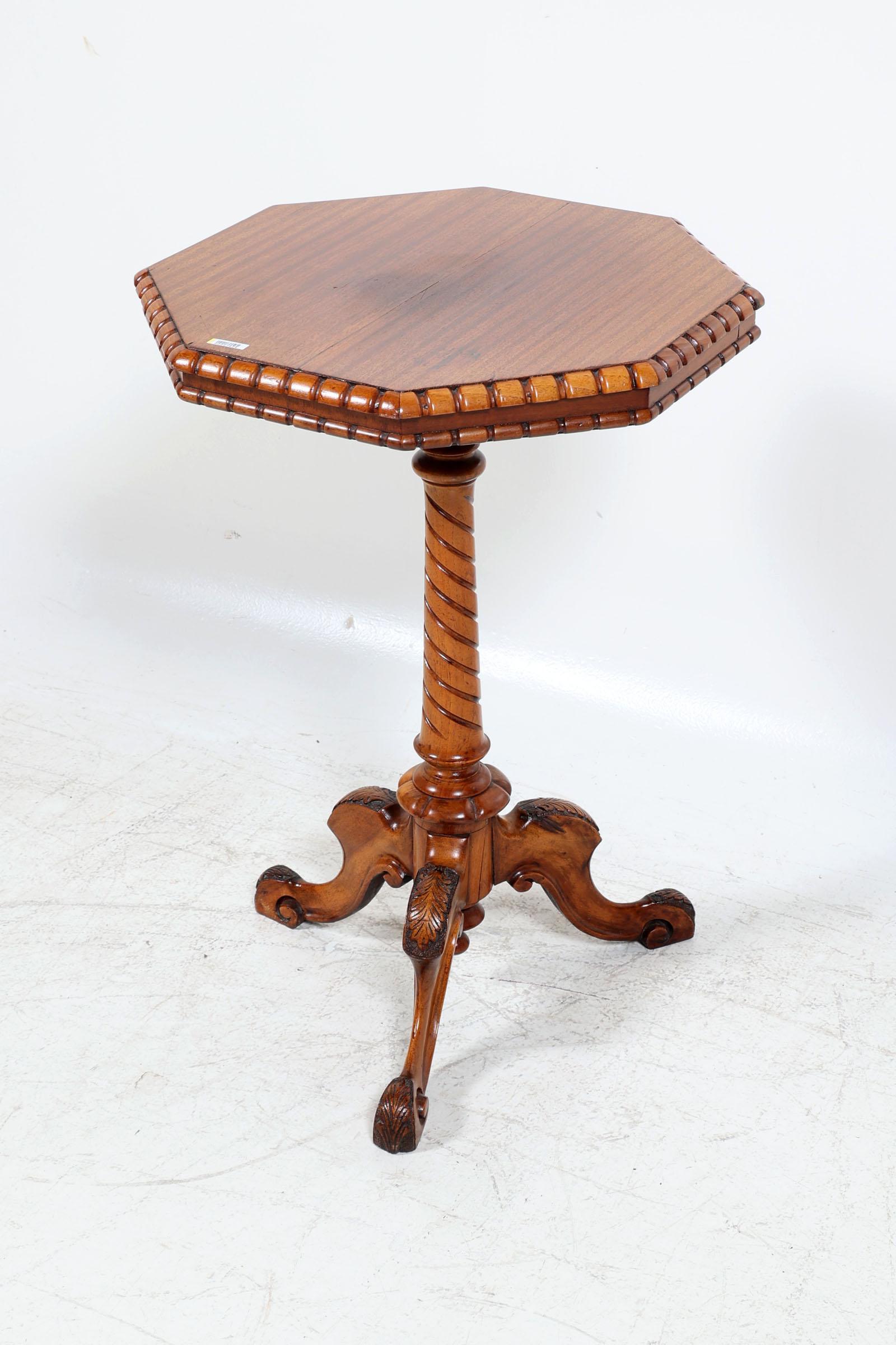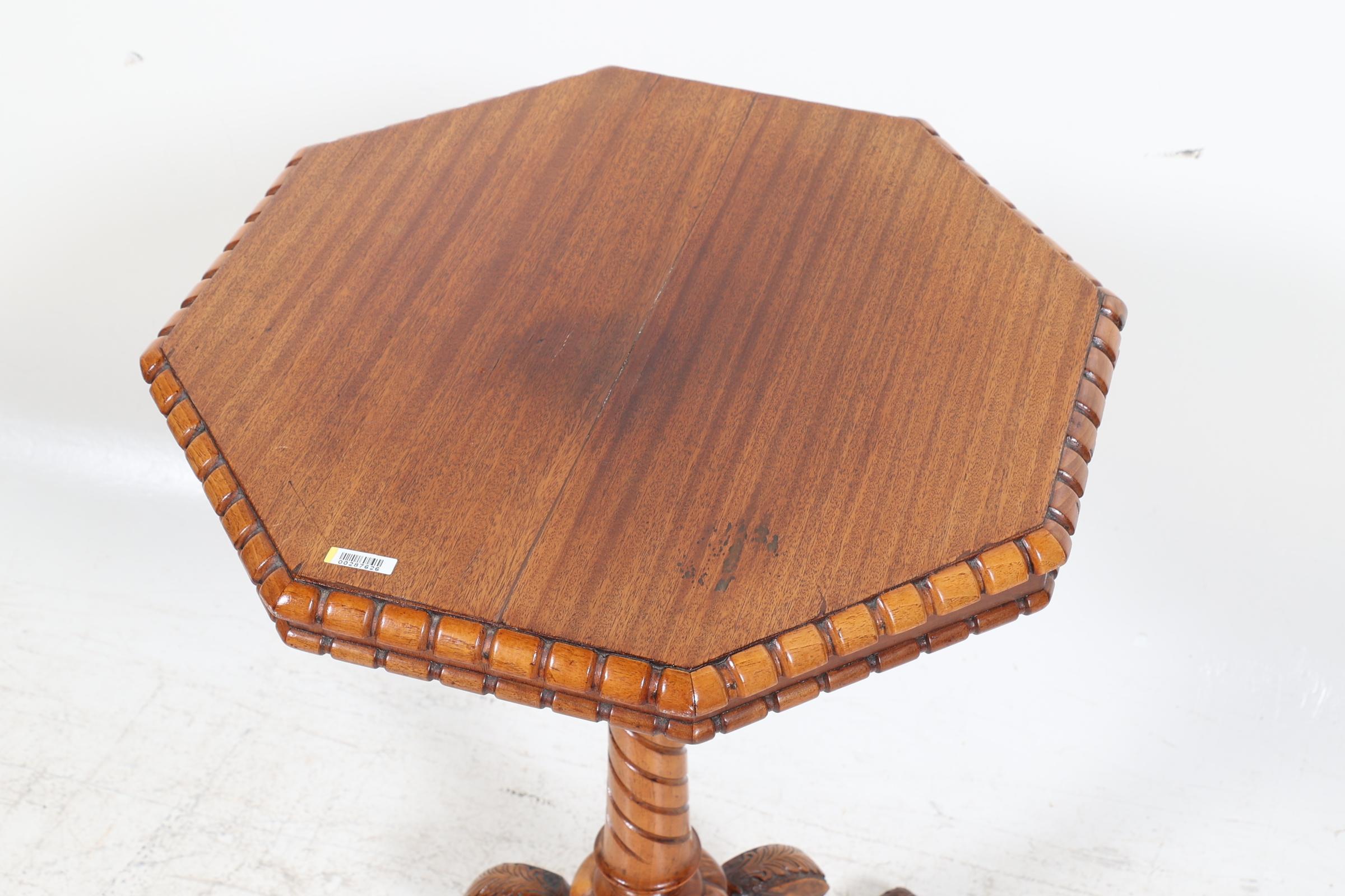 Oude notenhouten 8-kantige bijzettafel, h.71 x b.48 x d.48 cm.