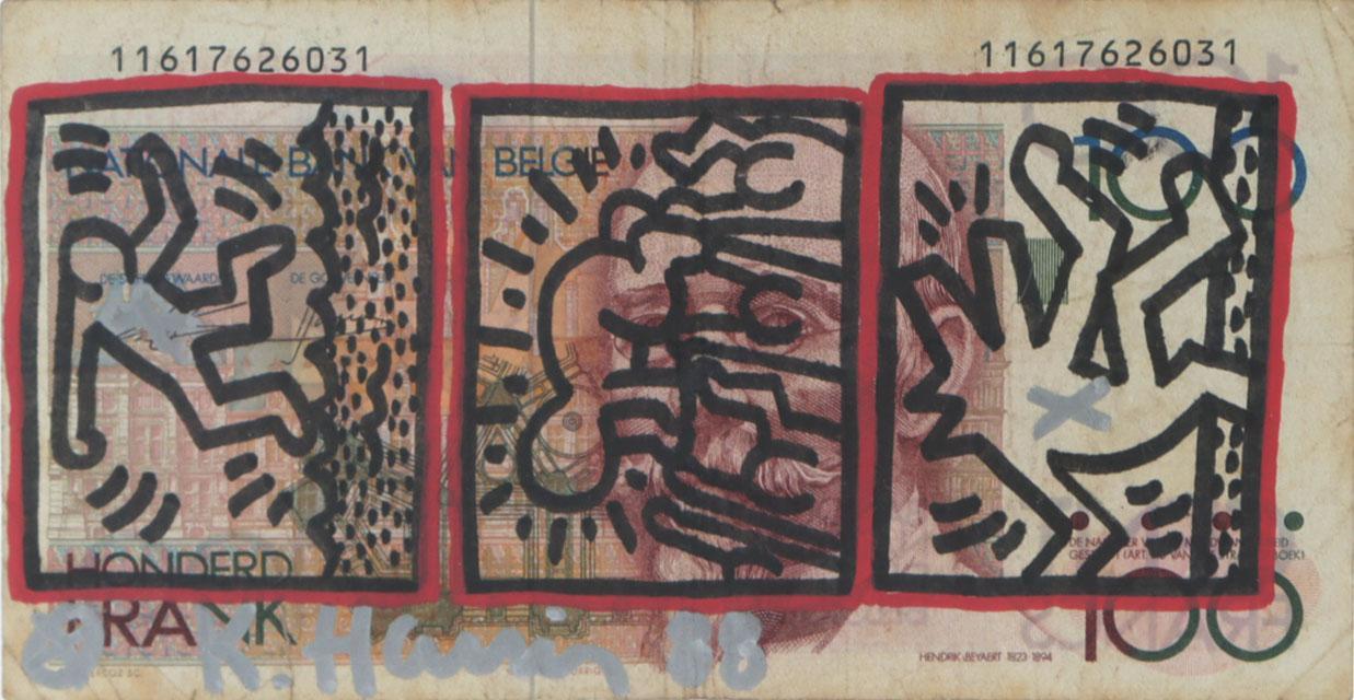 Keith Haring (1958-1990), 100 Frank biljet met originele tekening, gesigneerd en gedateerd '88, in plexiglazen houder, 13 x 18 x 2 cm.