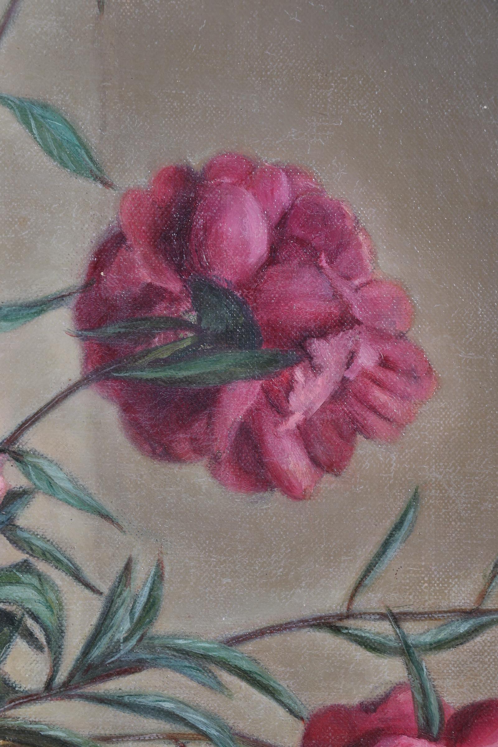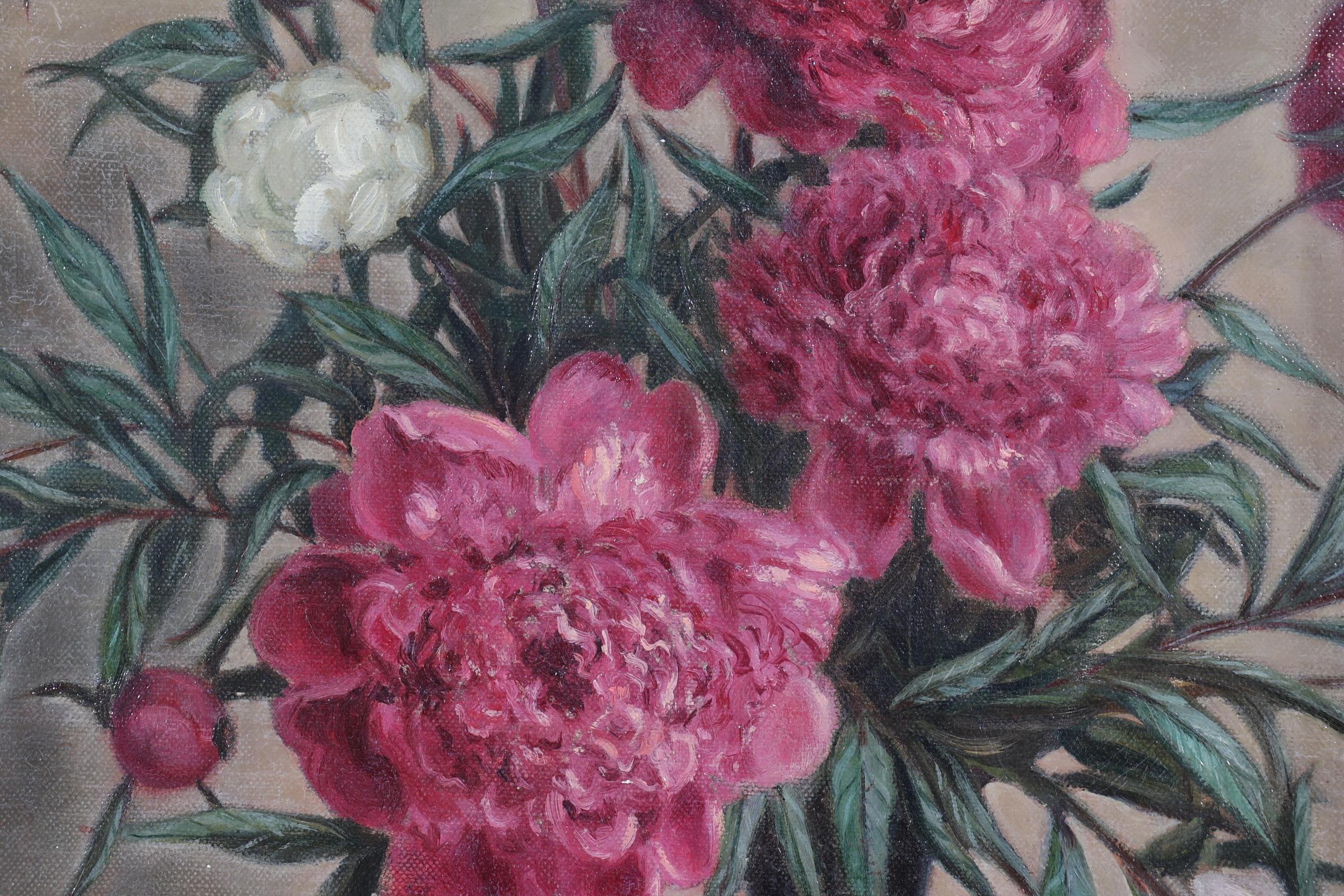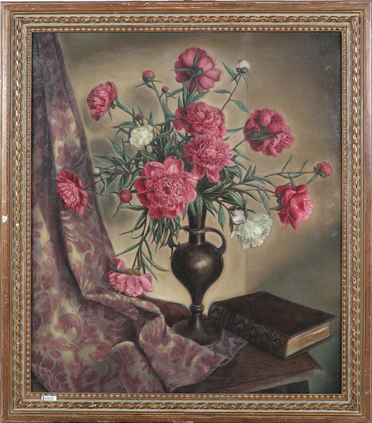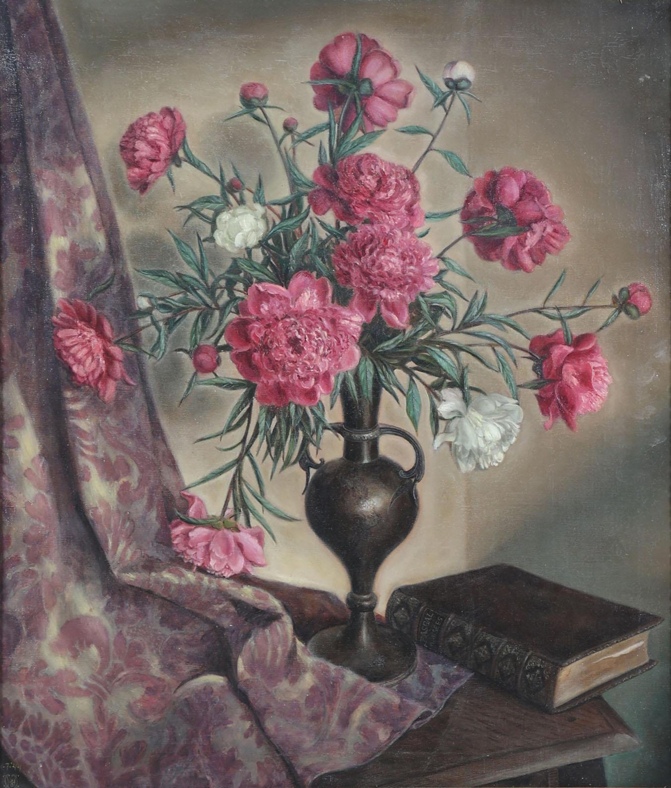 Ond. monogram, Stilleven met pioenrozen, Les Pivoines de Berg en Dal, Baarn, gedateerd 4-7-1944, olieverf op doek, 78 x 67 cm.
