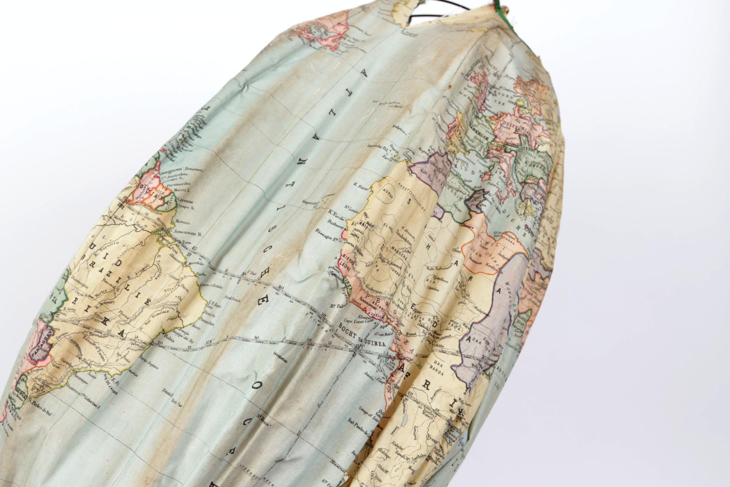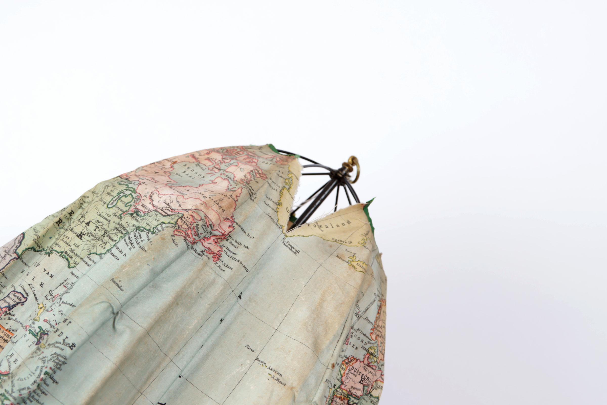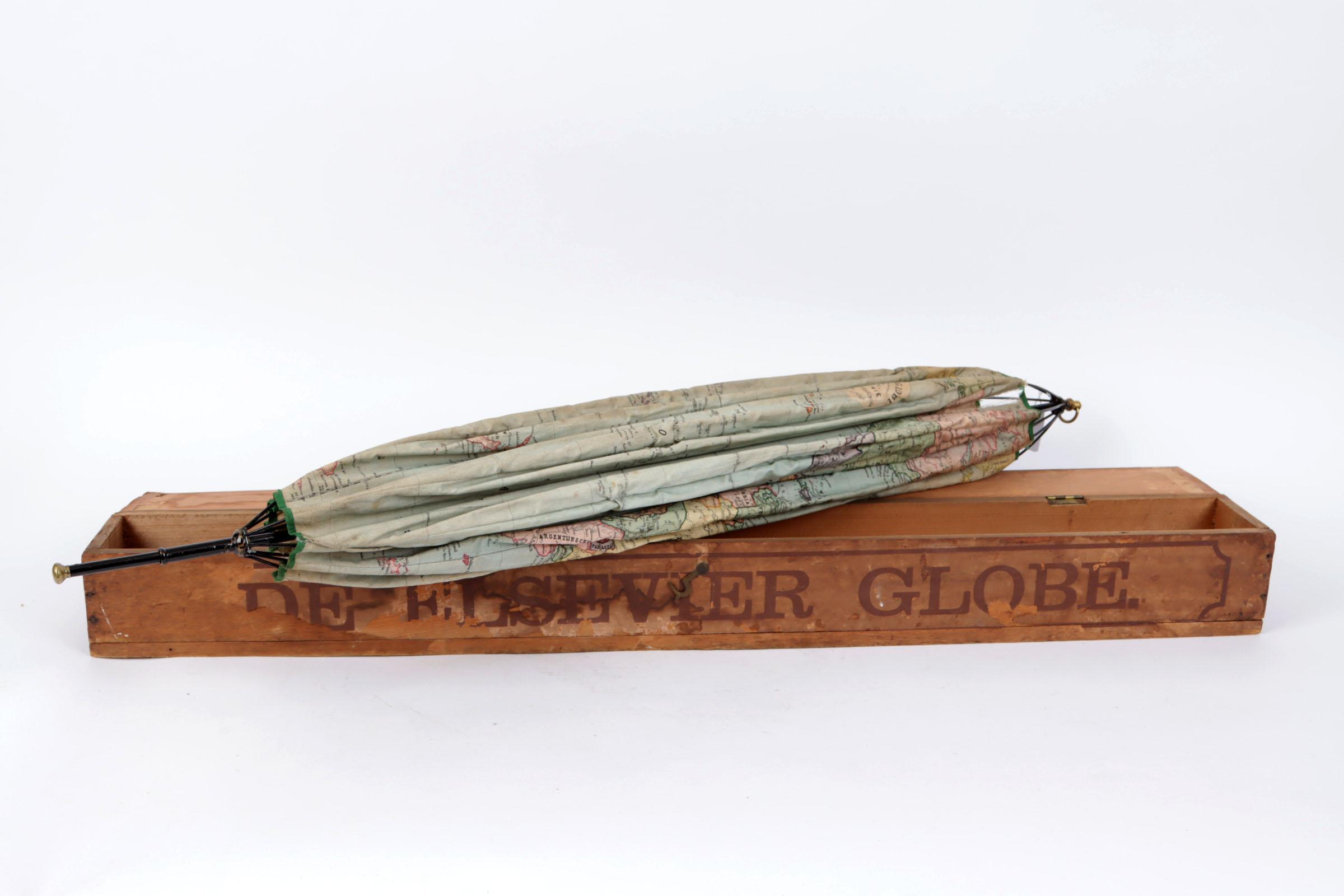 De Elzevier, vintage globe gemaakt van textiel met paraplu-systeem, in authentieke doos, circa 1880