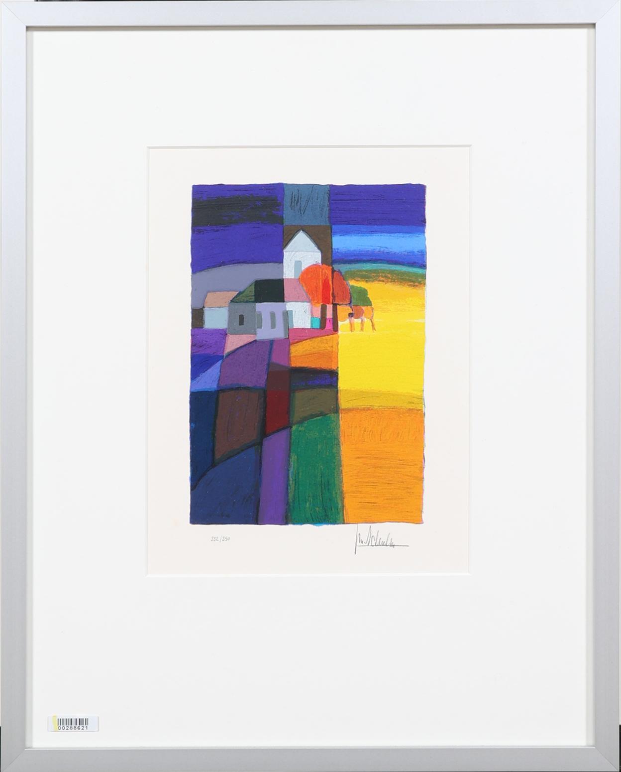 Ton Schulten (1938-2025), Dorp met kerk, handgesigneerde zeefdruk, genummerd 322 / 350, 28 x 21 cm.