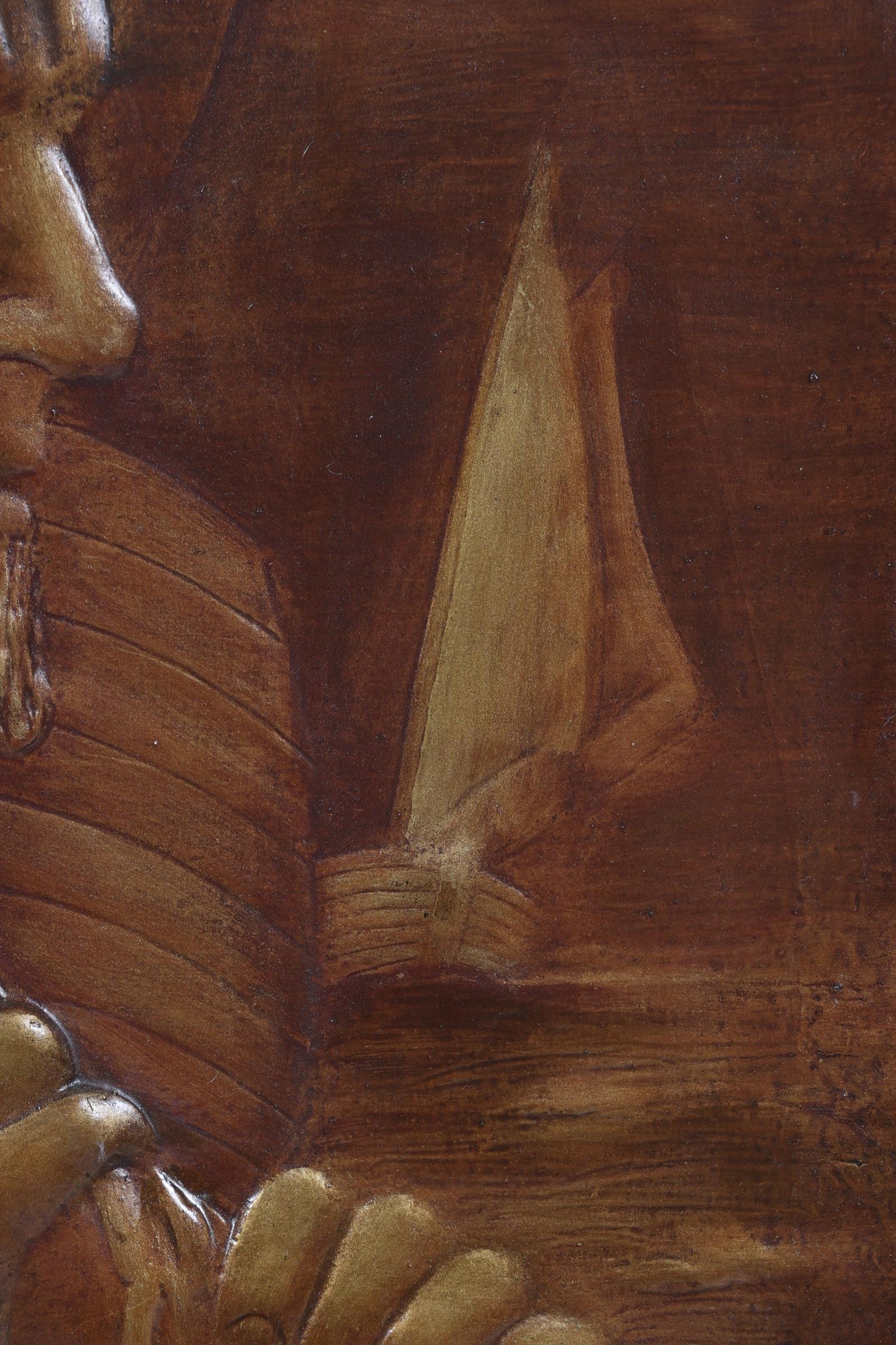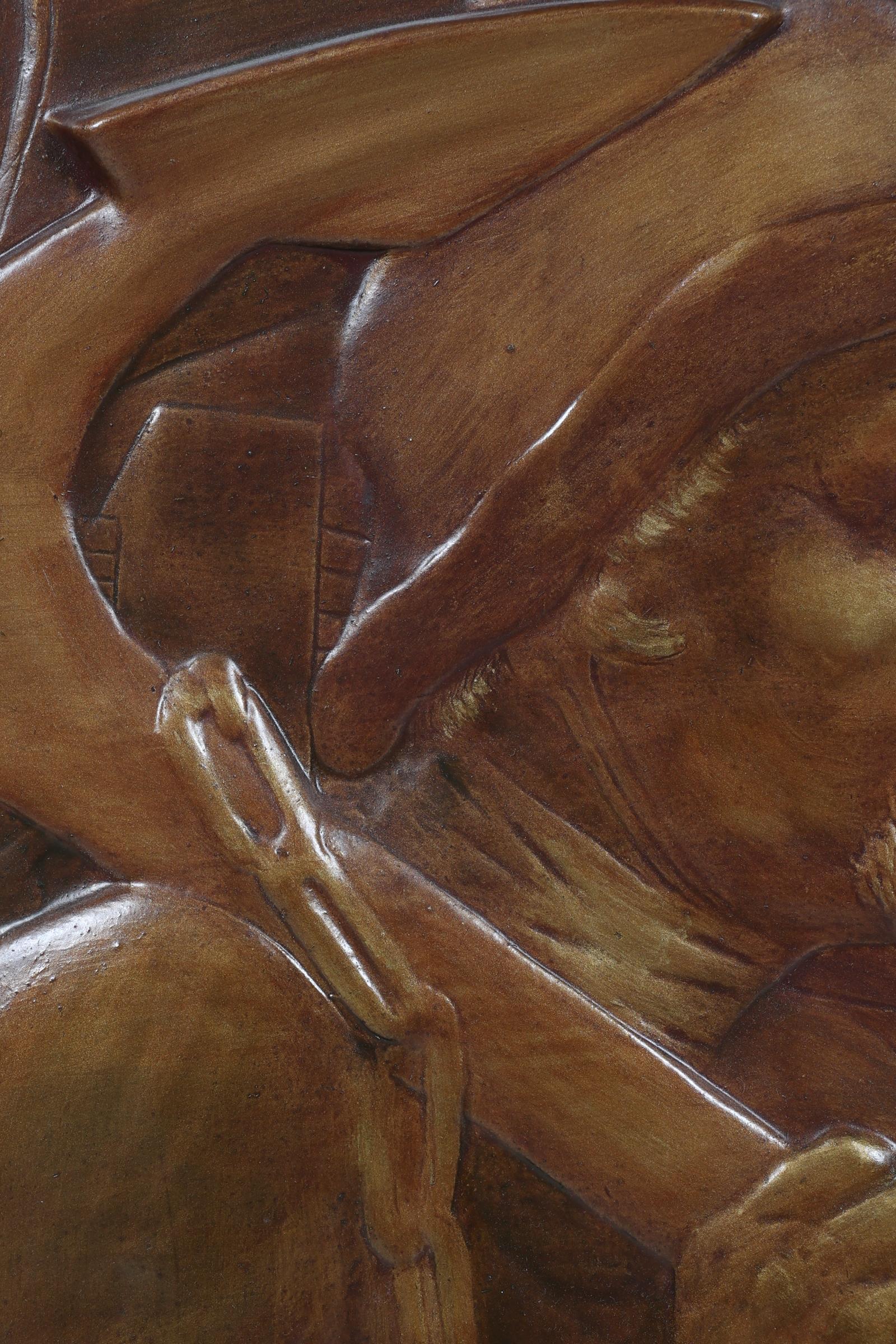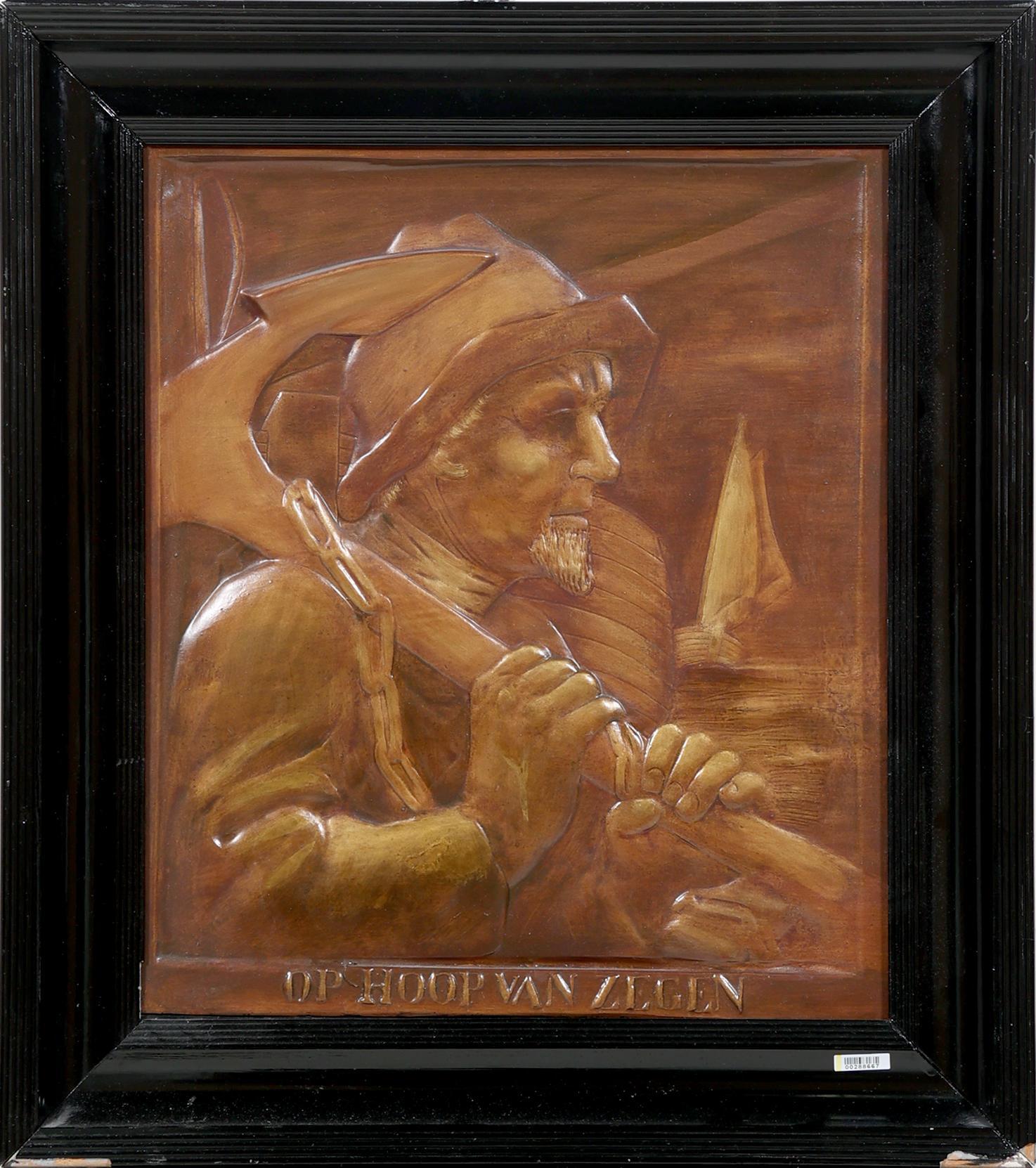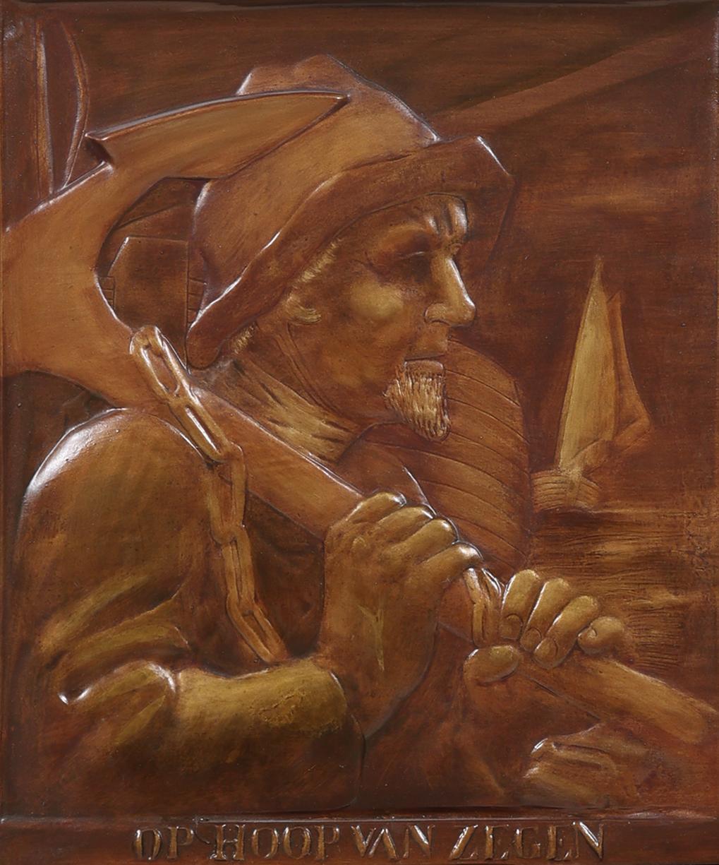 Bronskleurige wandplaquette "Op hoop van zegen", totaal 68 x 60 cm.