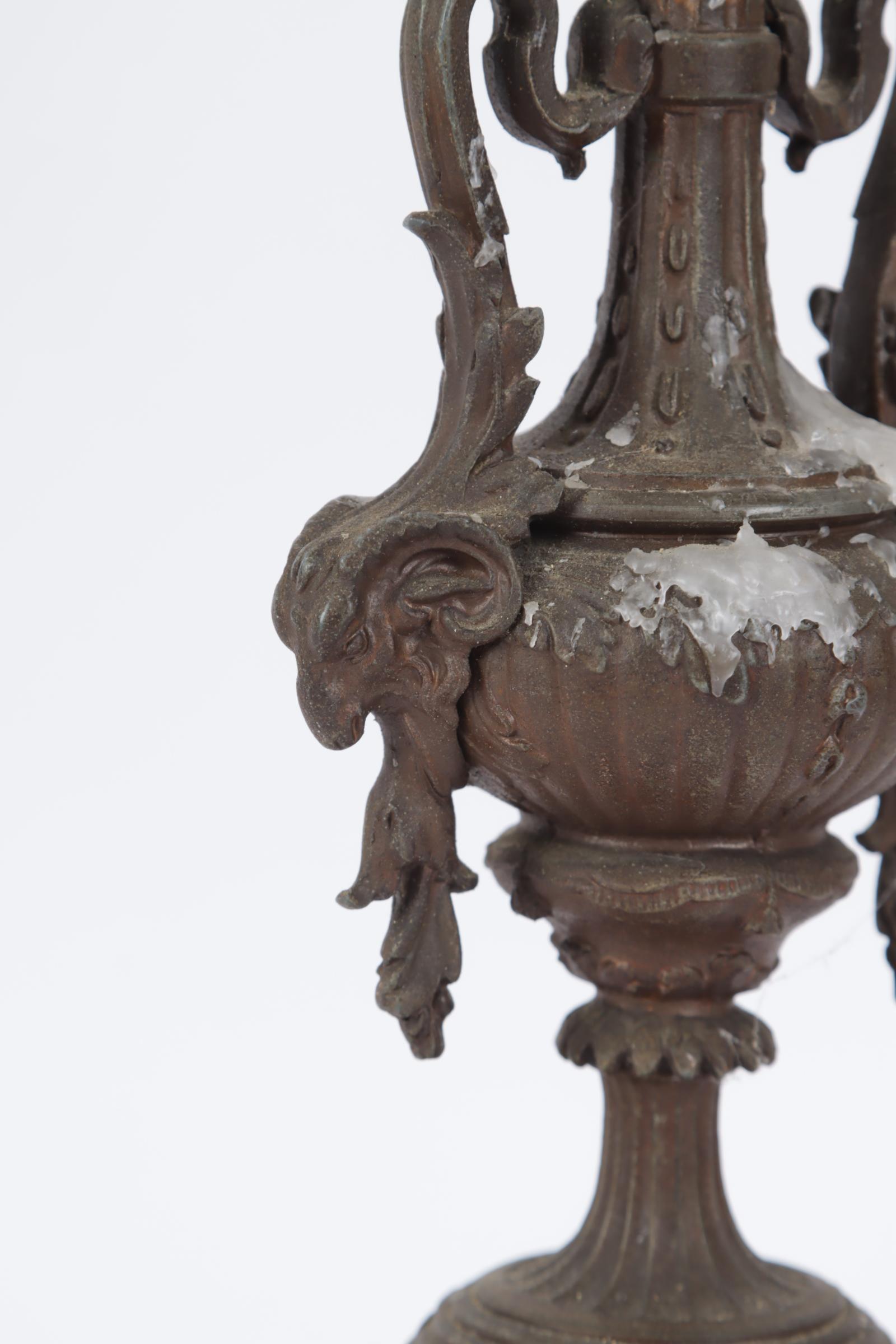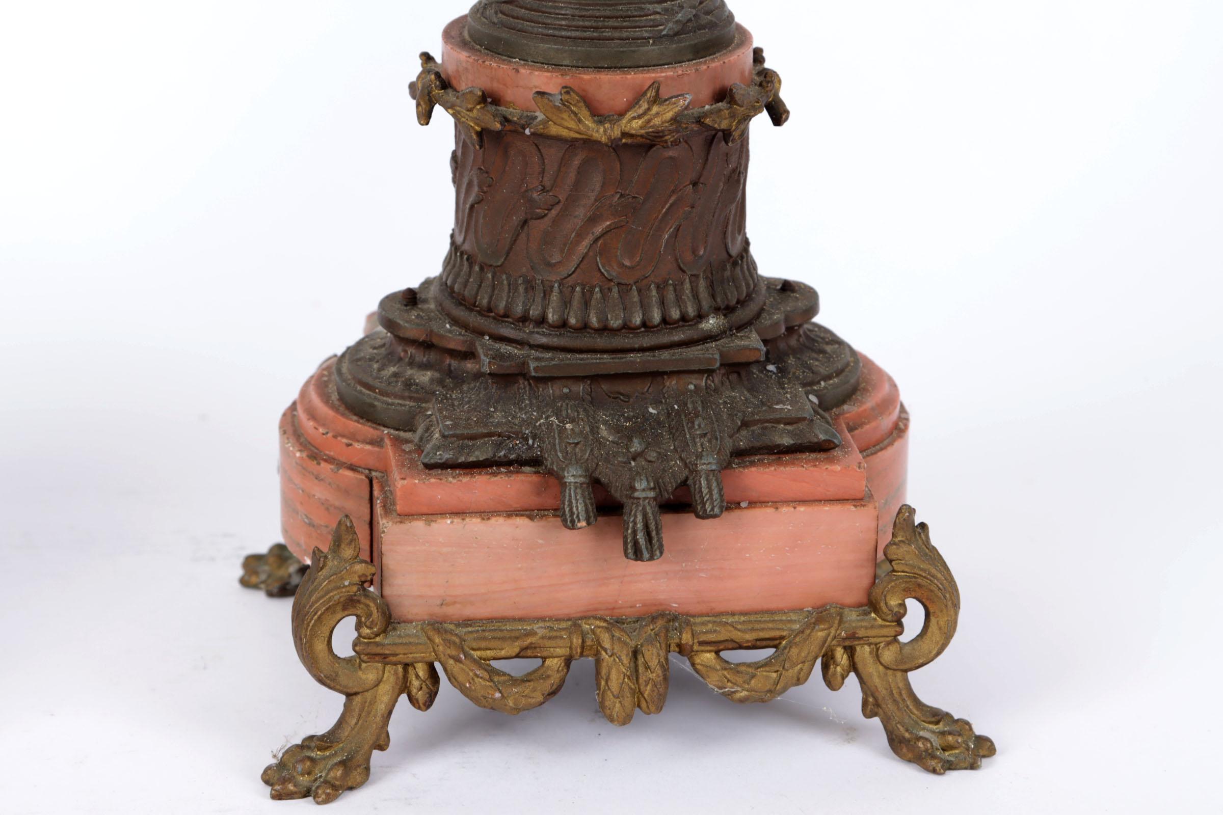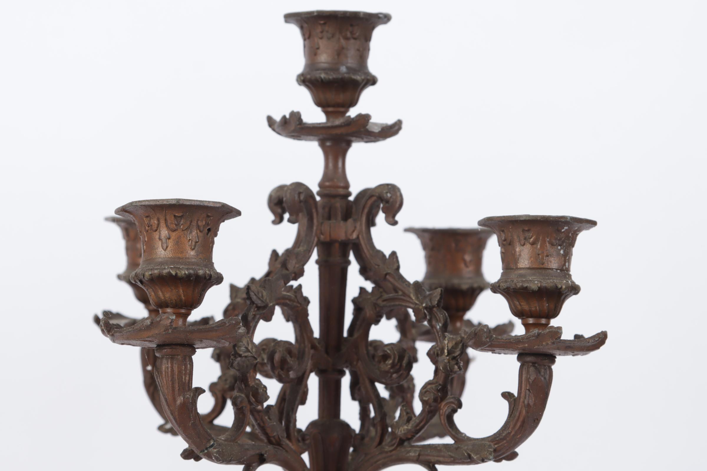Set van 2 legering 5-lichts kandelaars op roze marmeren voetstuk, h.51 cm.