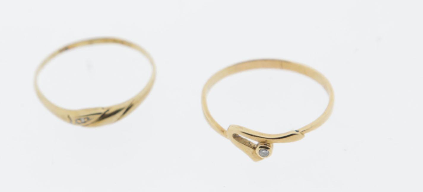 Twee 14 kt. gouden ringen bezet met briljant, diam.17 en 18 mm.