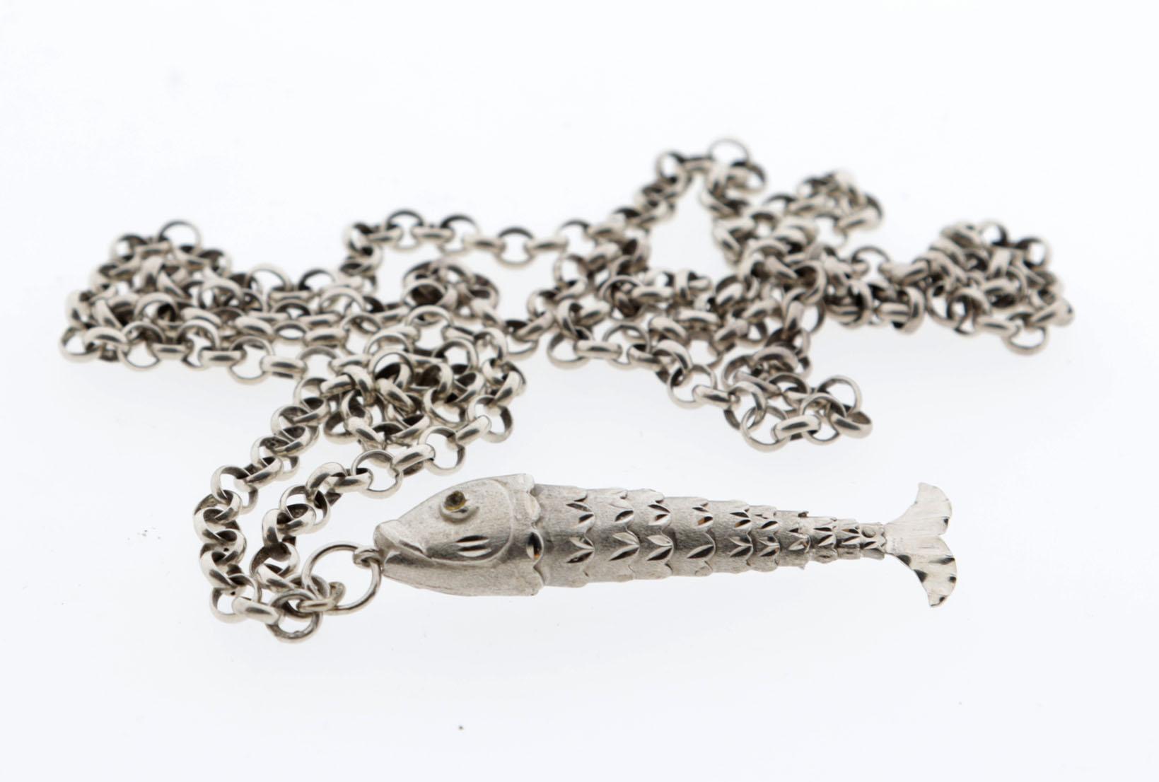 Zilveren beweegbare schubbenvis-hanger aan zilveren jasseron ketting