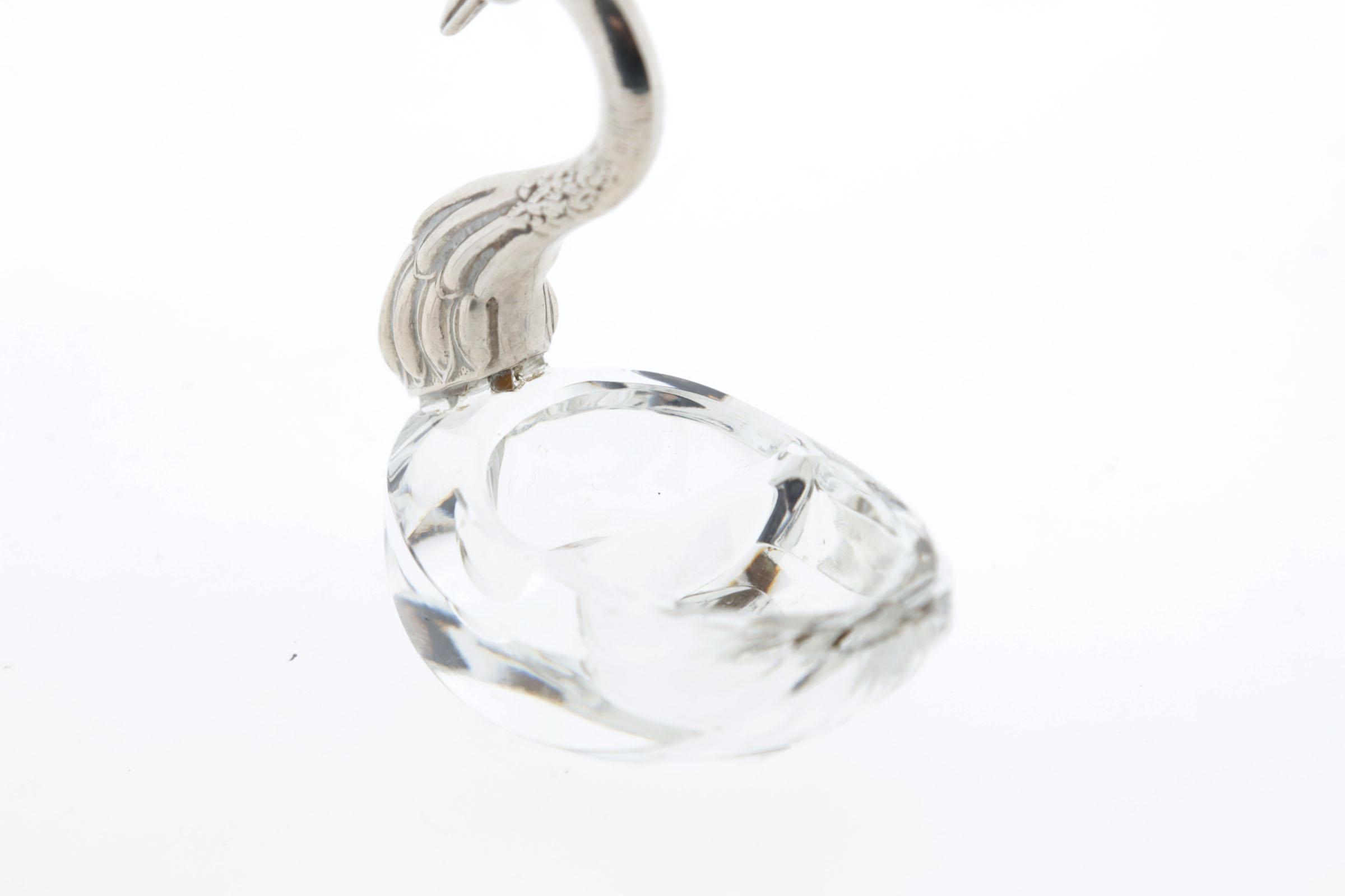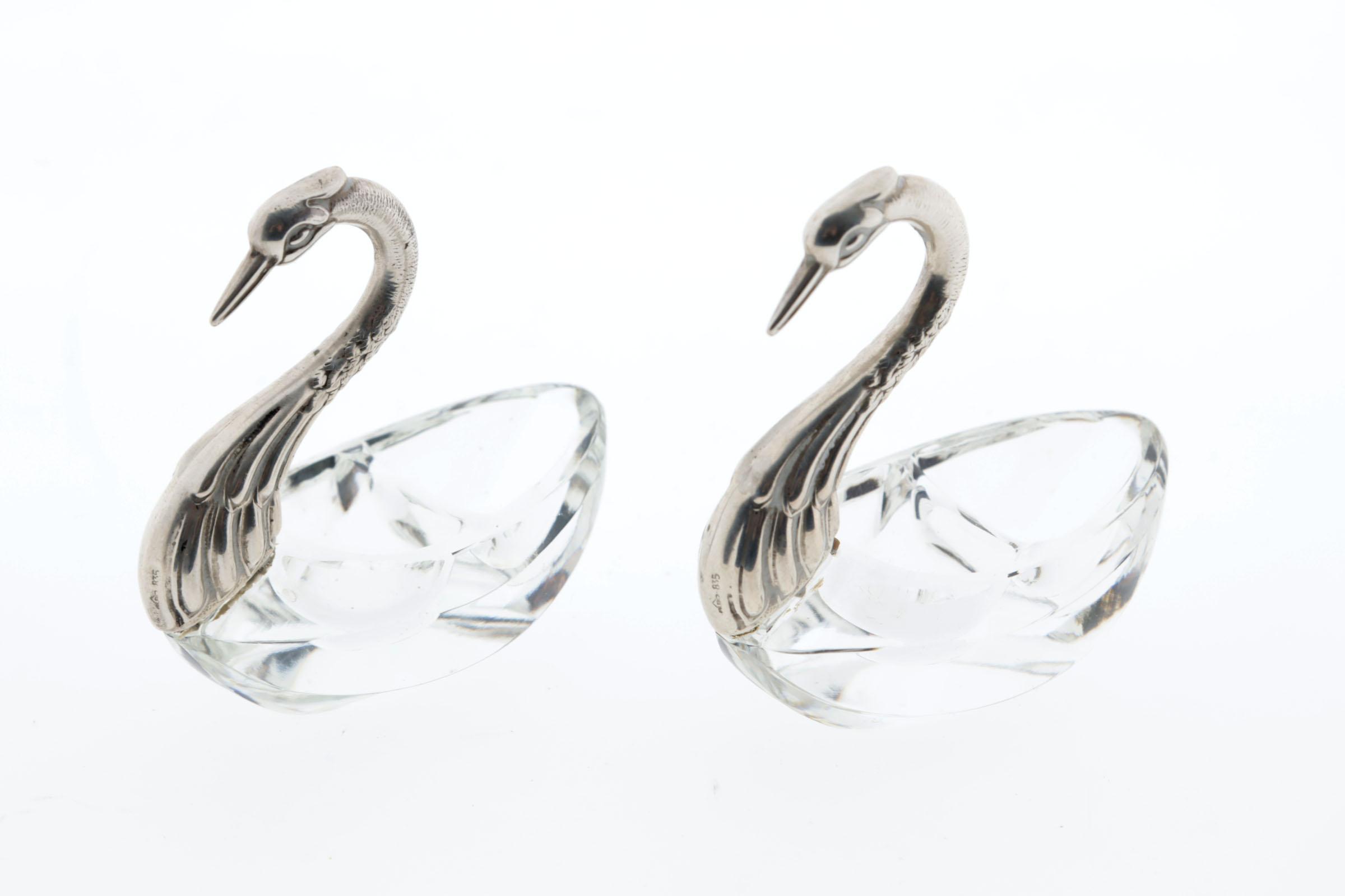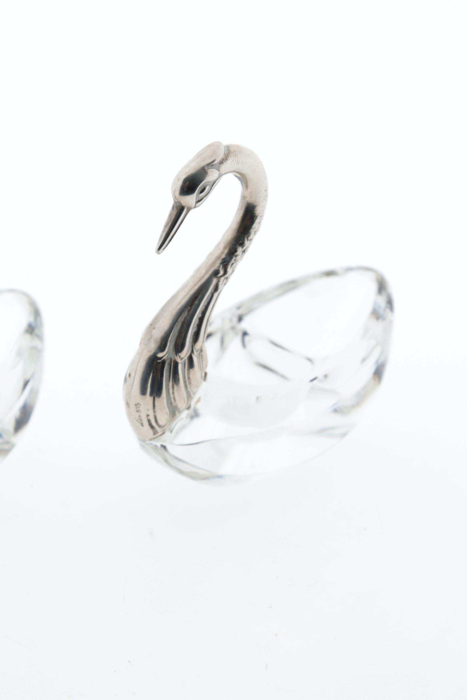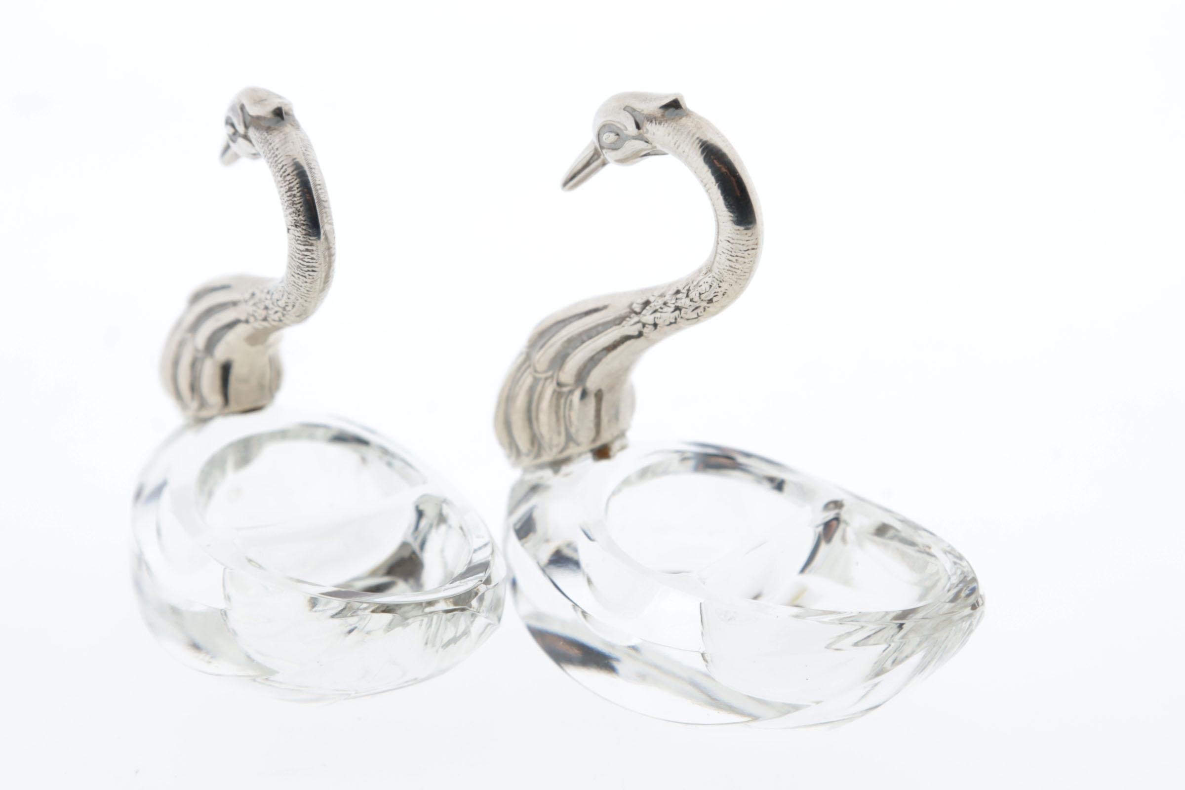 2 Geslepen kristallen zoutvaatjes i.v.v. een zwaan met zilveren montuur