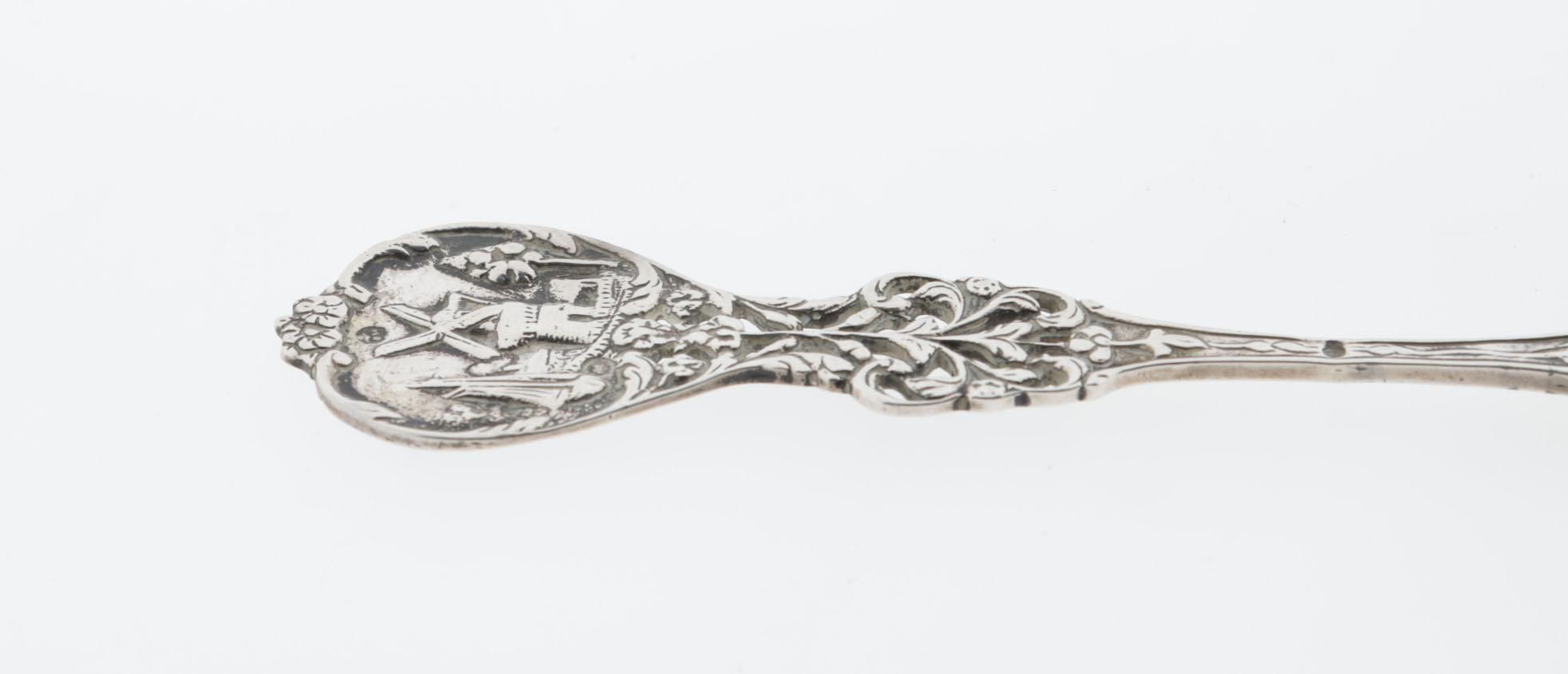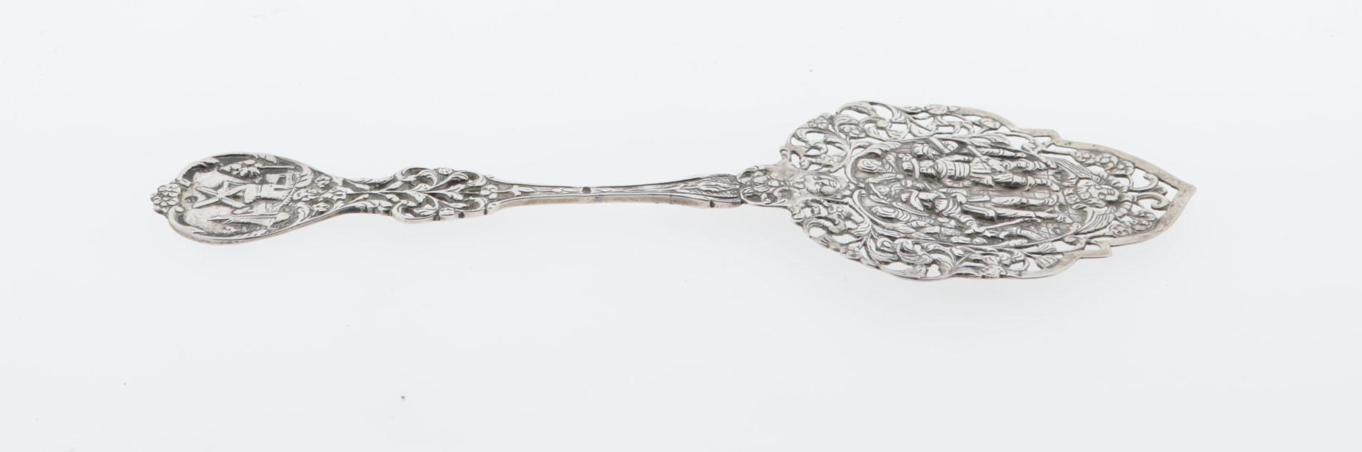 Bewerkt zilveren opdienschep met afbeelding van de Nachtwacht, 25 cm., 84 gram