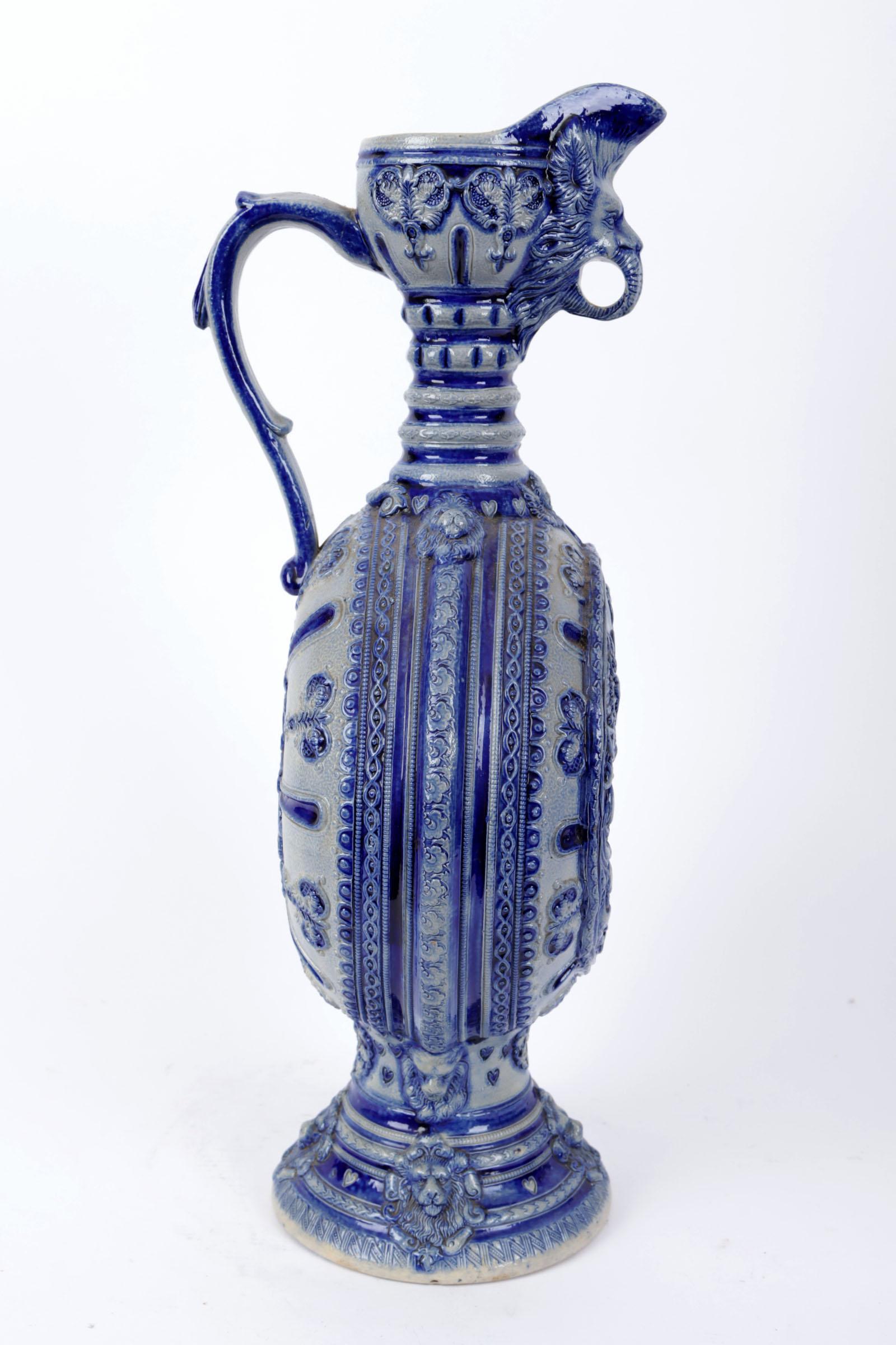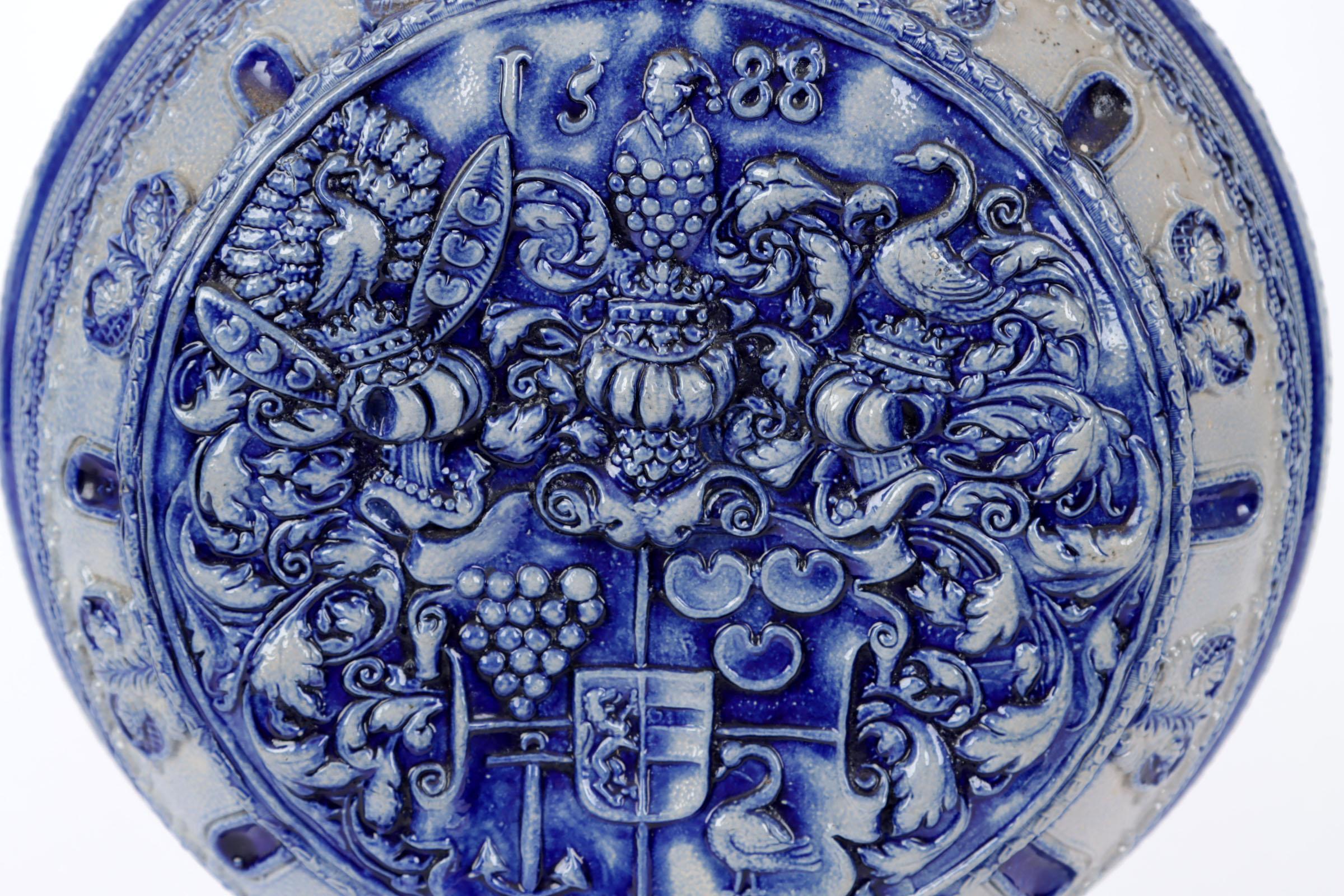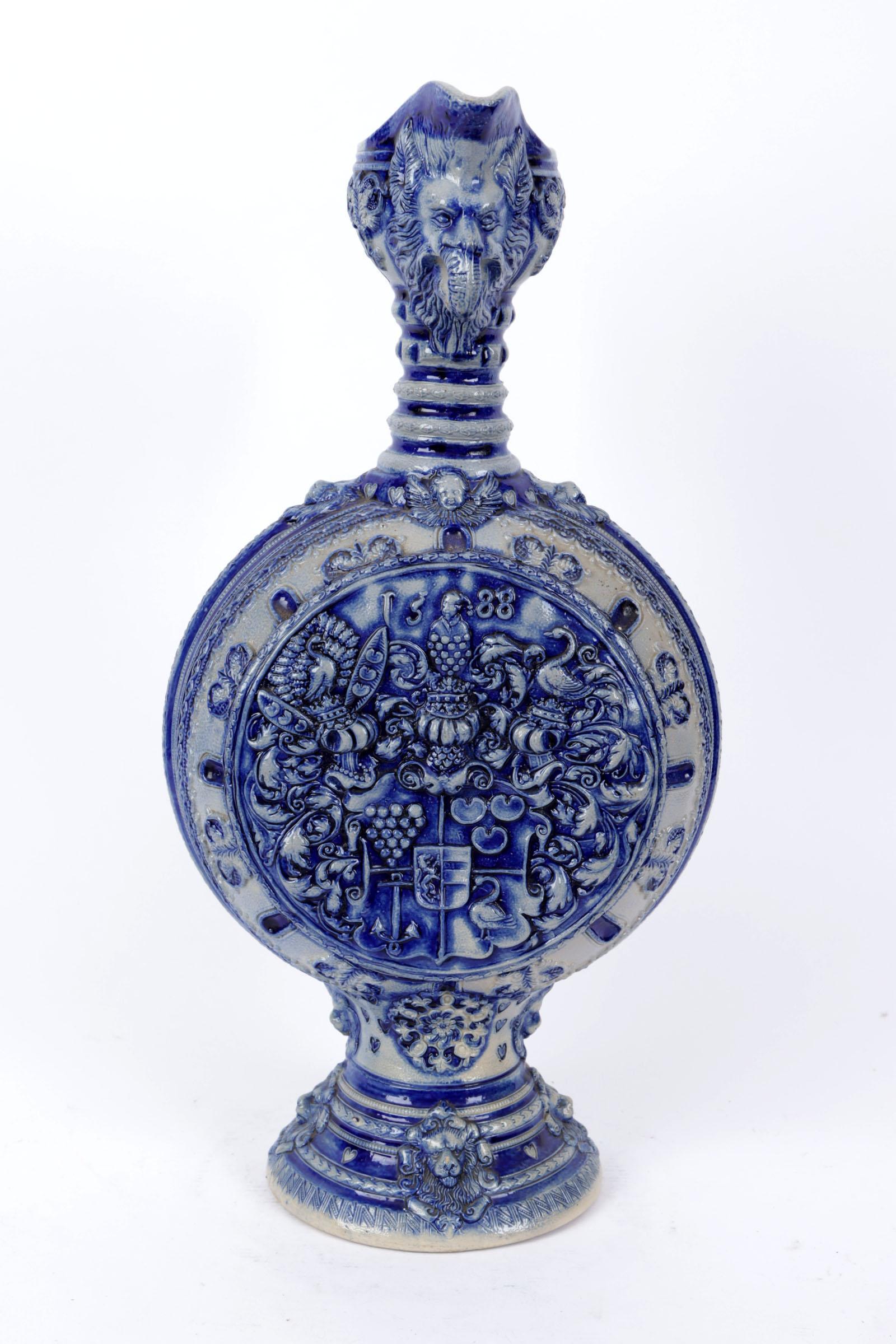 Antieke Westerwald steengoed pelgrimsfles, h.49 cm.