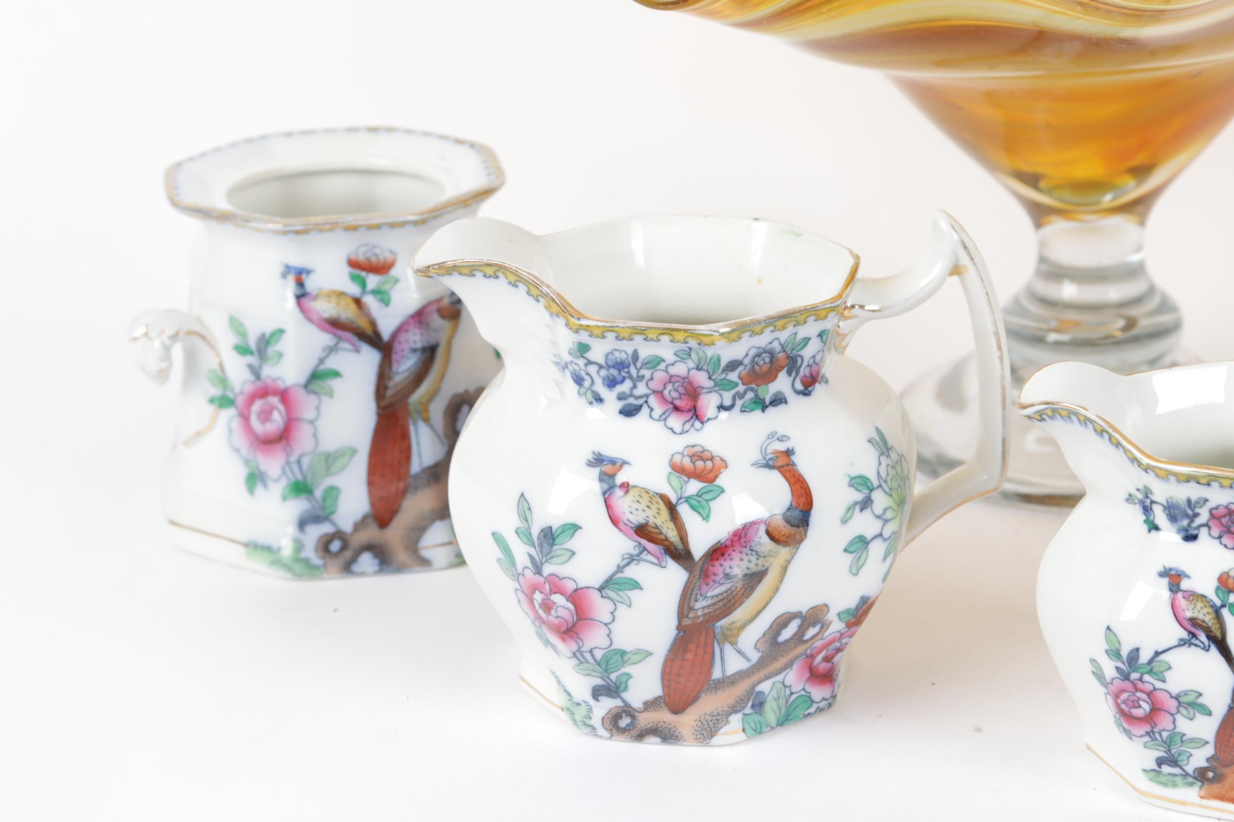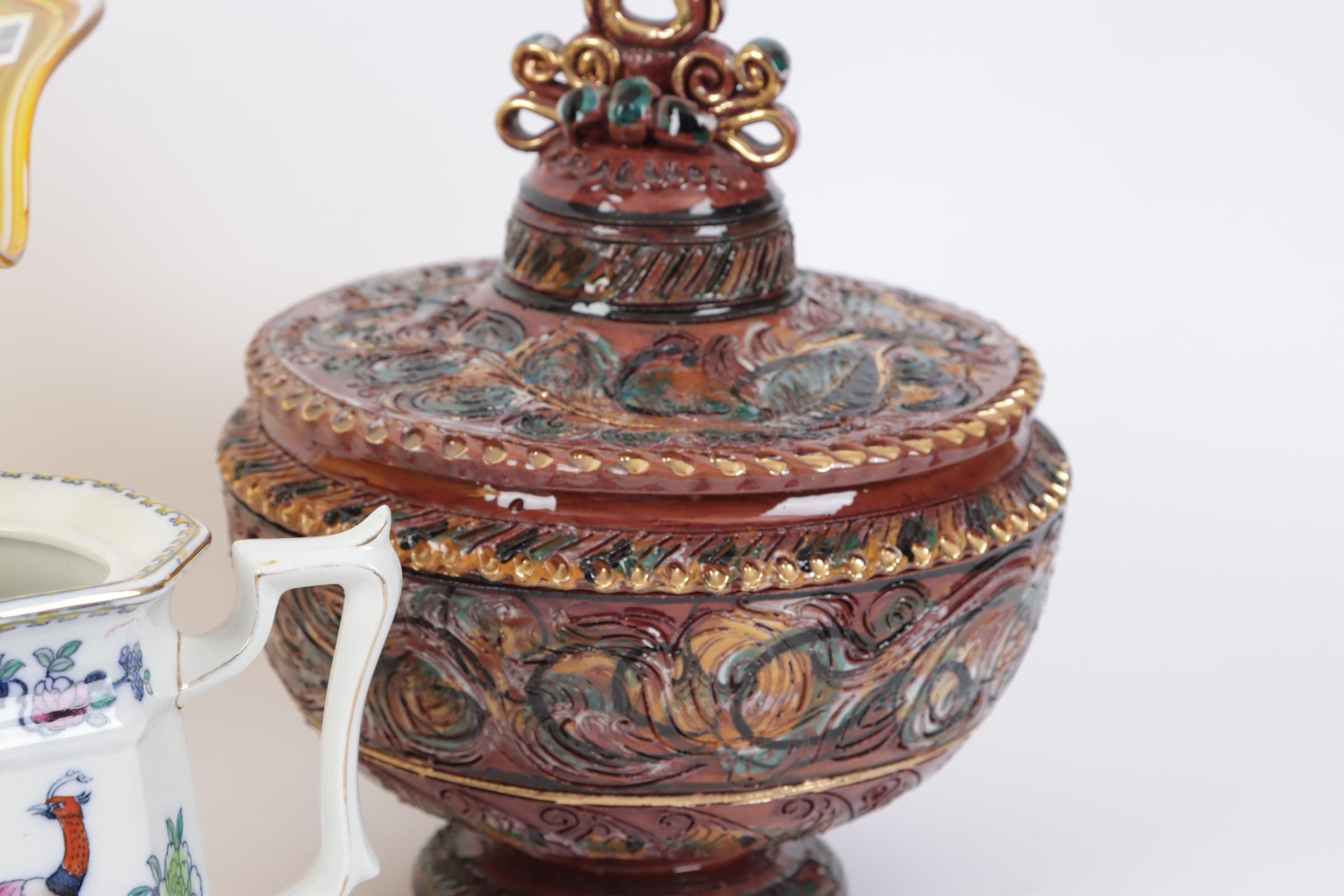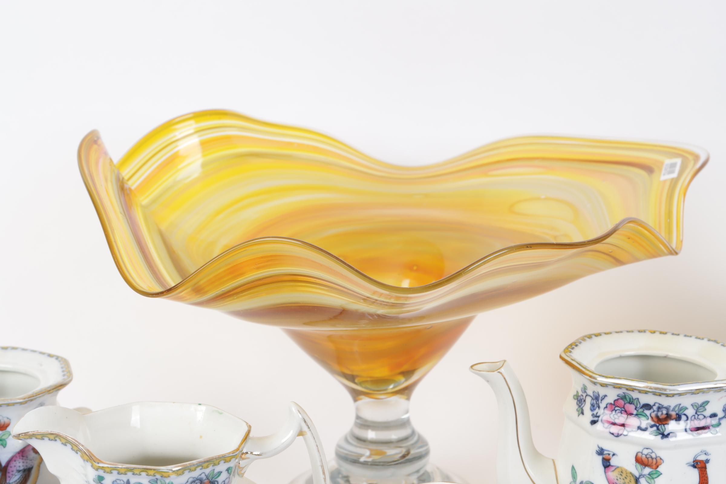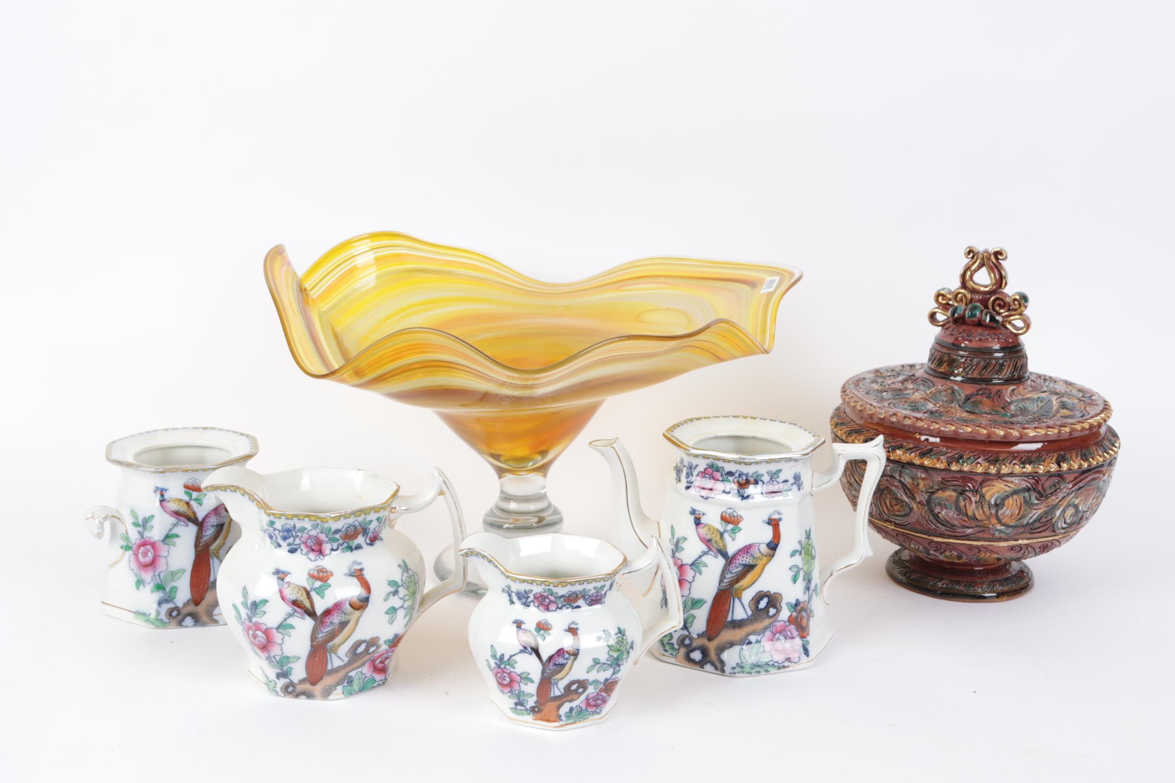 Koop van een grote glazen schaal, aardewerken dekselpot en een serviesdeel