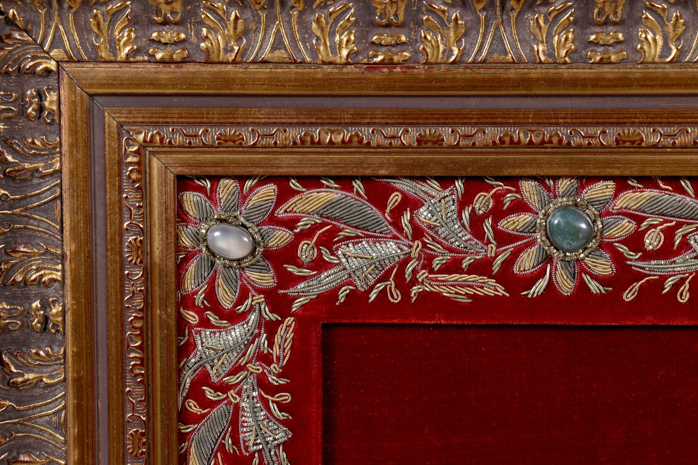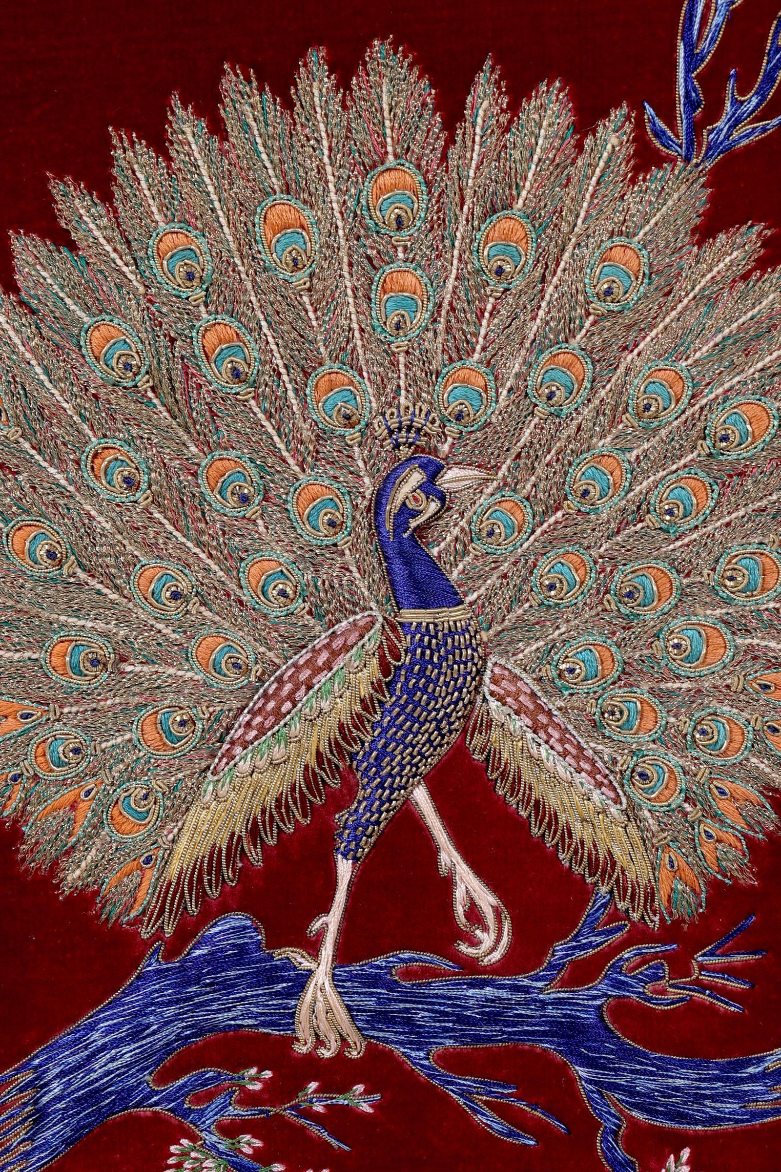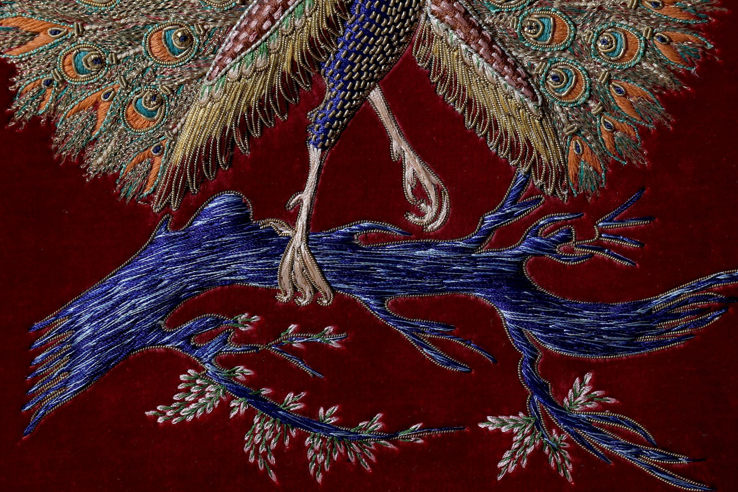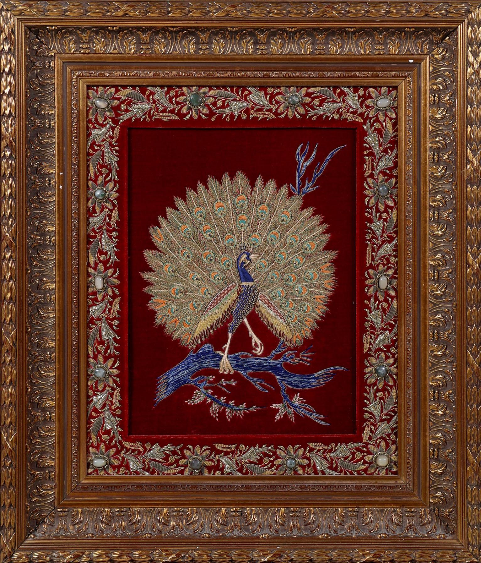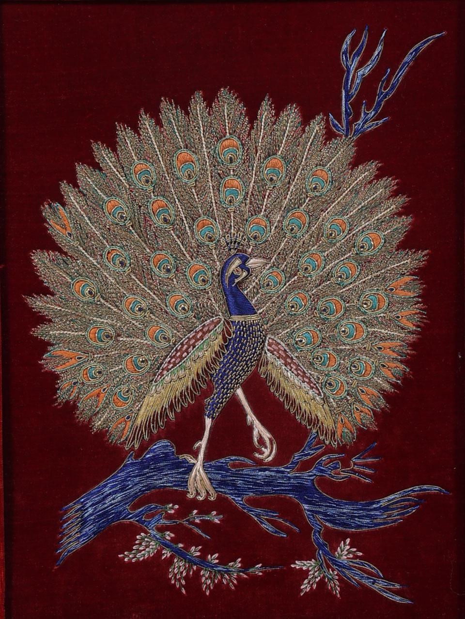 Geborduurde voorstelling van een pauw in goudkleurige lijst, 64 x 55 cm.