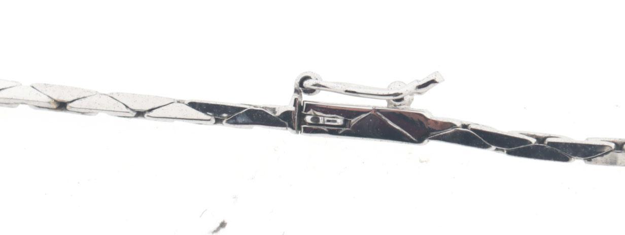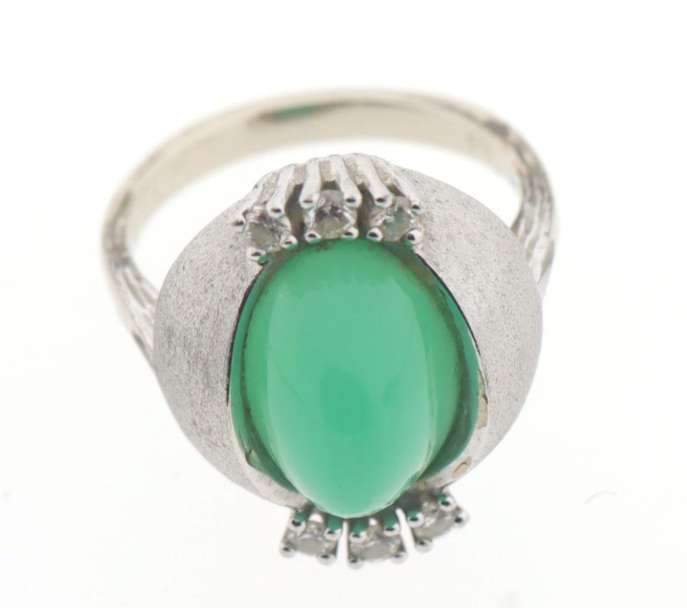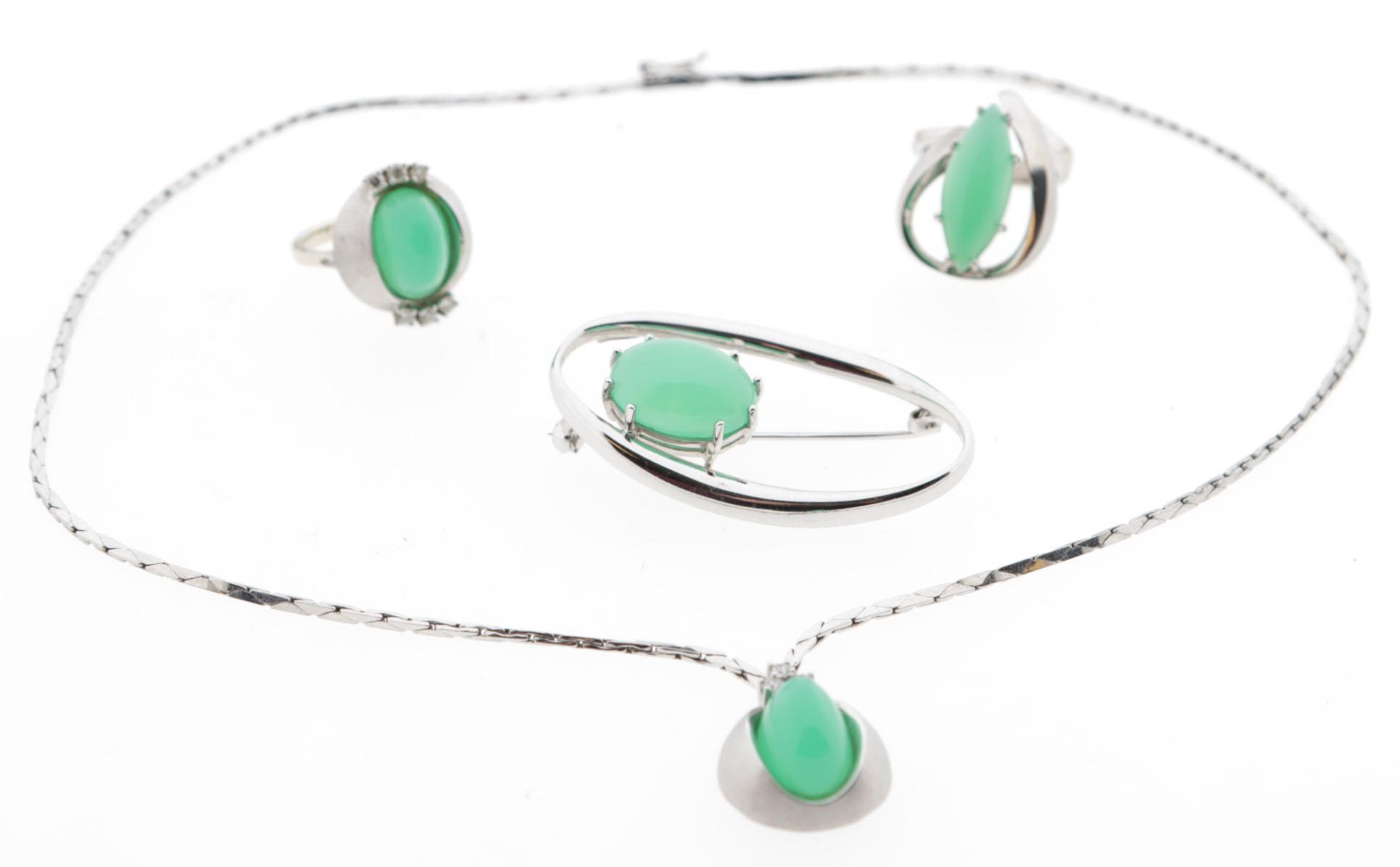 14 Kt. witgouden collier met groene topaas hanger bezet met 3 briljant geslepen diamanten, bijpassende ring bezet 6 briljant geslepen diamanten en groene topaas, 14 kt gouden ring bezet met topaas en bijpassende broche, totaal 39,4 gram