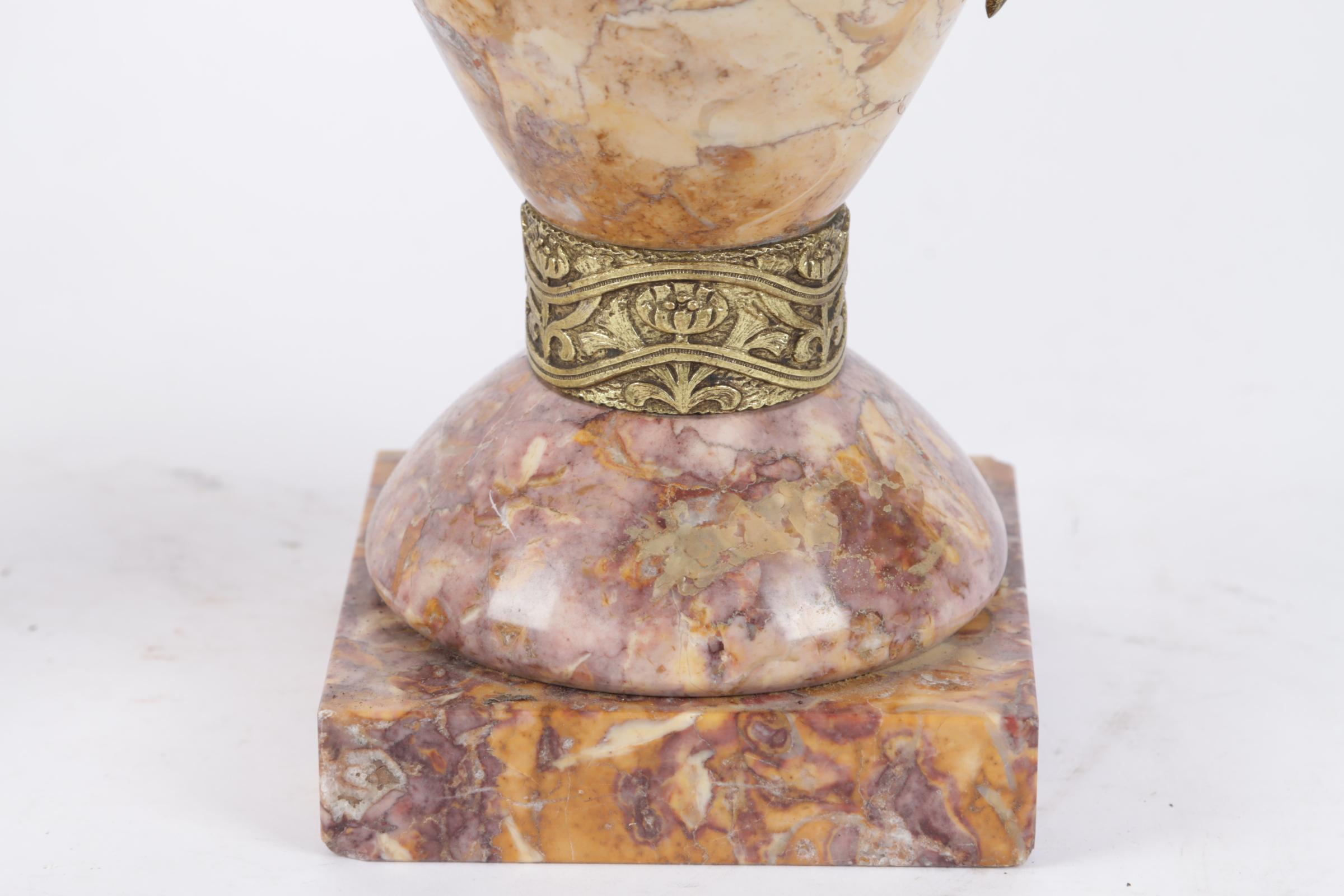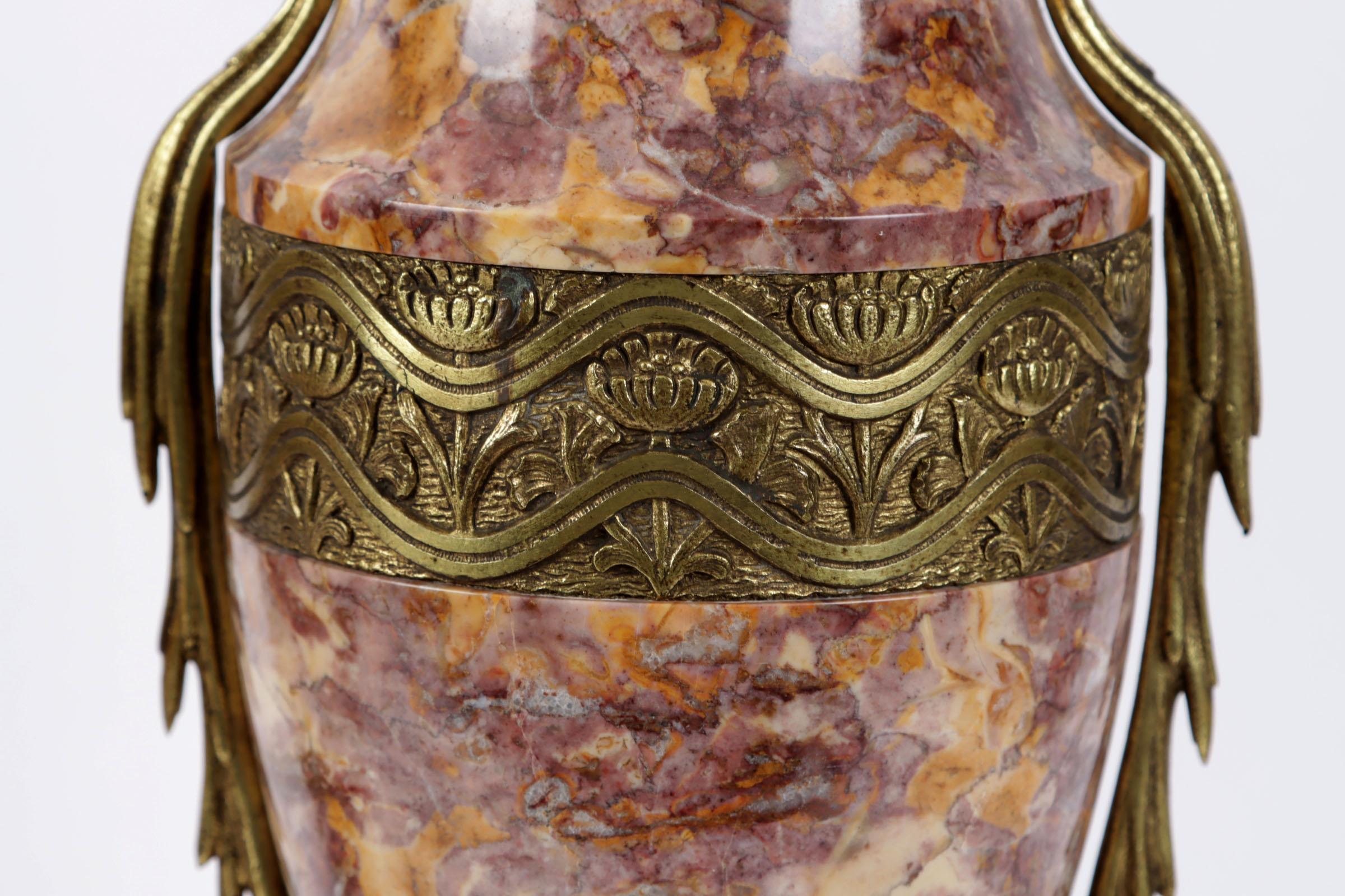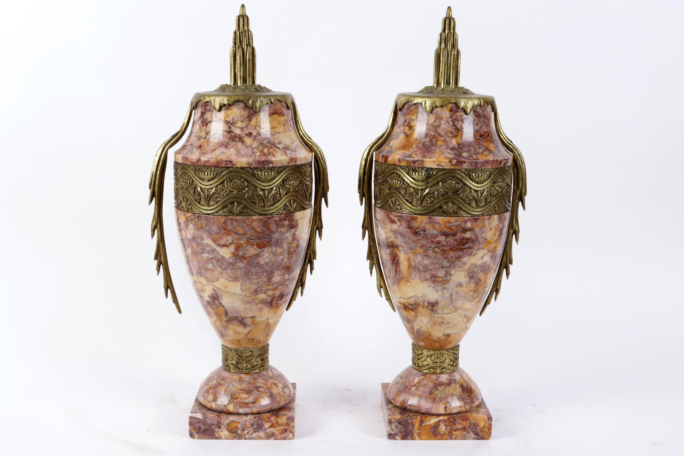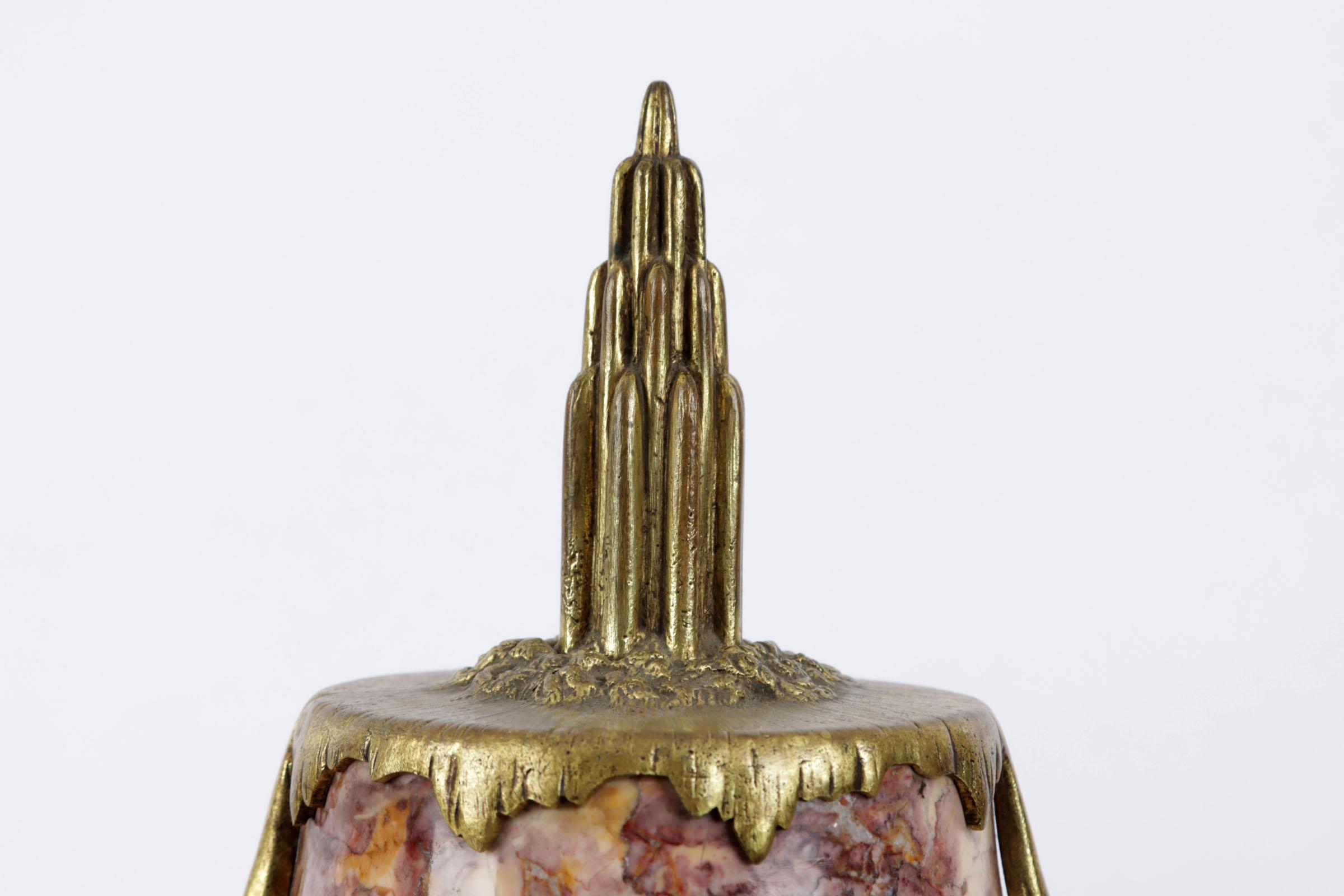 2 Roze marmeren met messing Art Deco casolettes, h.